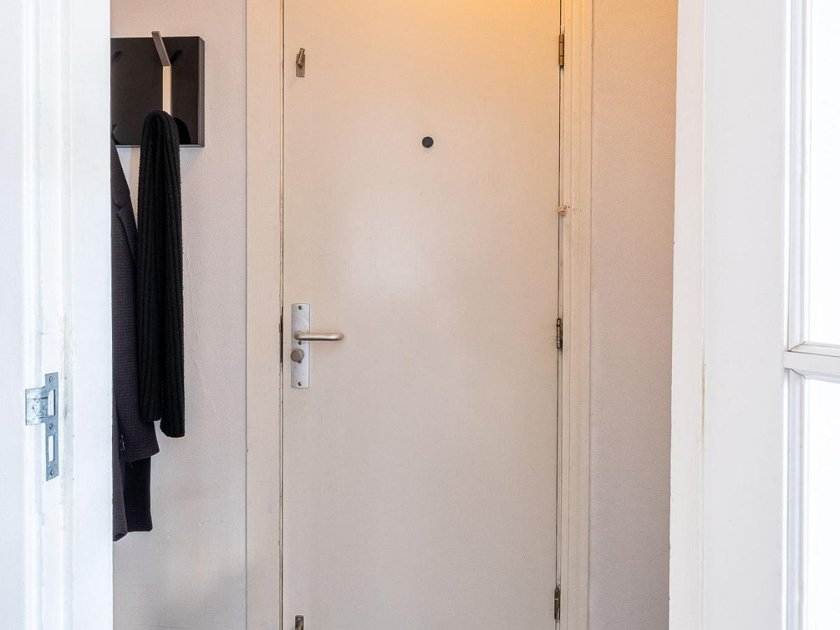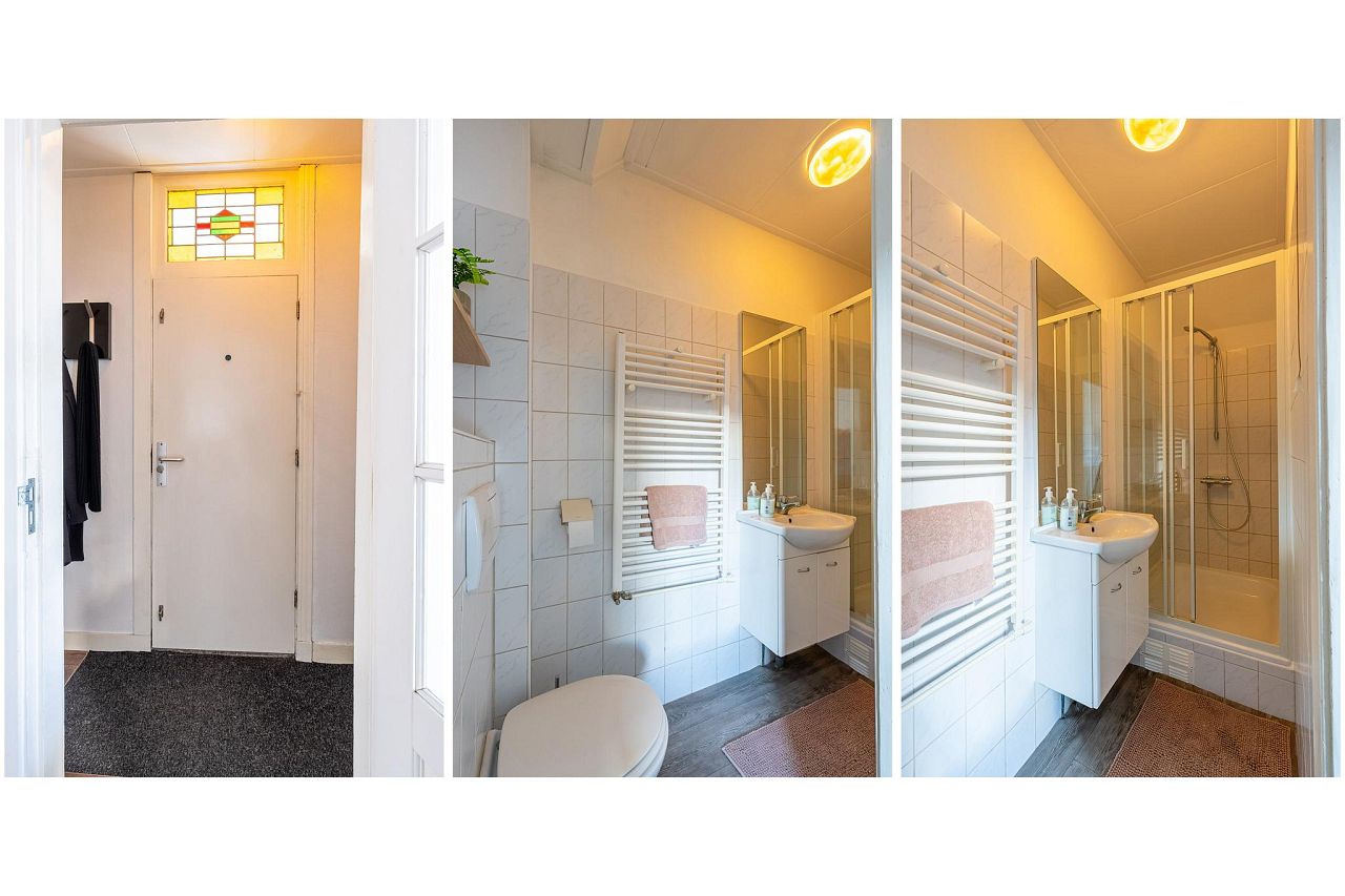 Entree appartement; hal/tochtportaal met klein kamertje met meterkast (3 groepen) en glas-in-lood raam. Dit kamertje is in gebruik als berging.