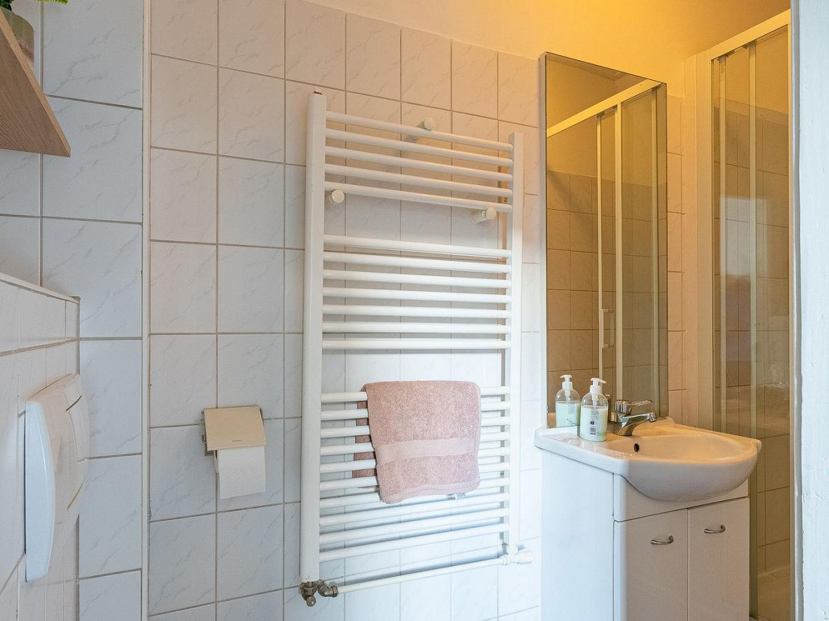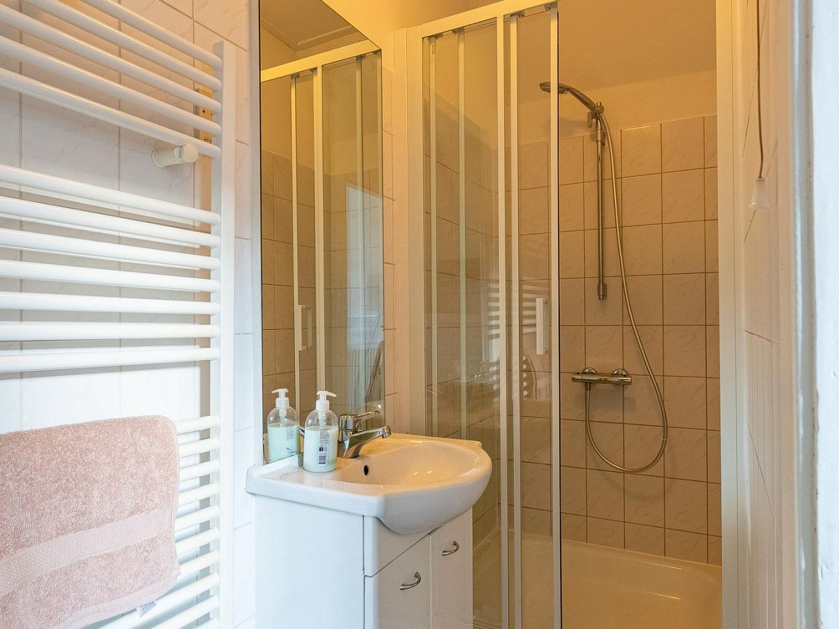 Badkamer in lichte kleurstelling voorzien van douchehoek met scherm, wastafelmeubel, mechanische ventilatie en wandclosetcombinatie.
