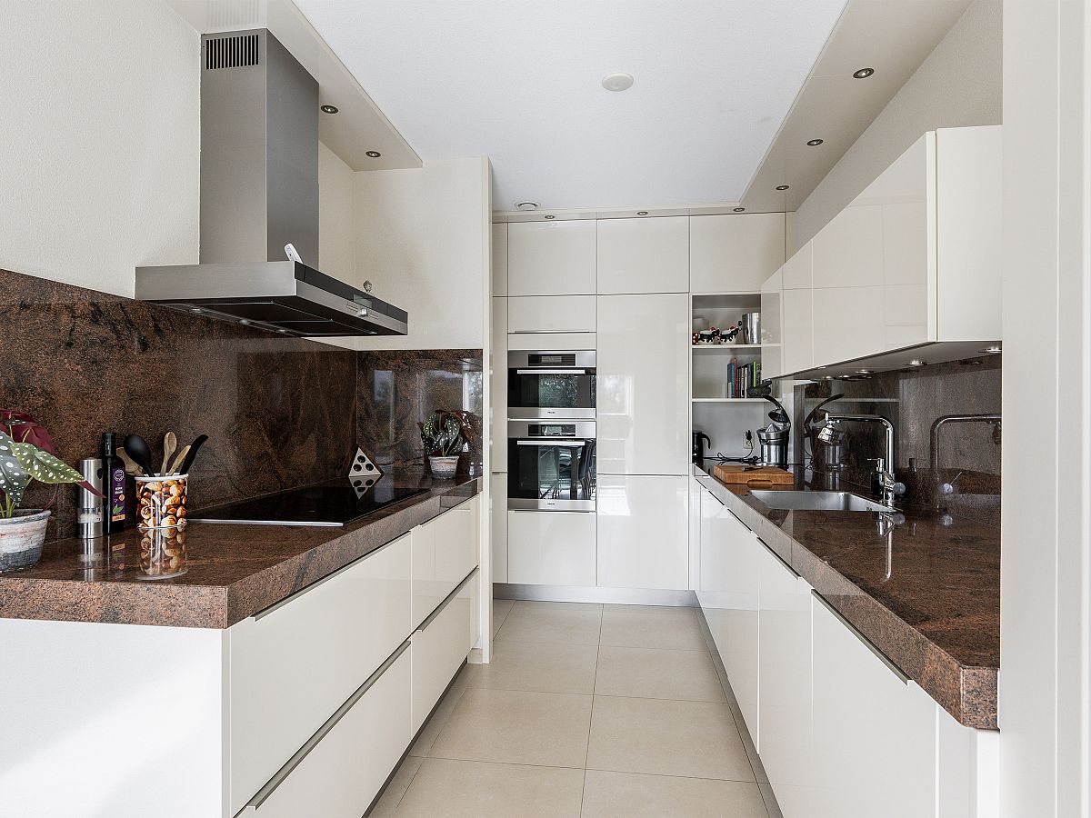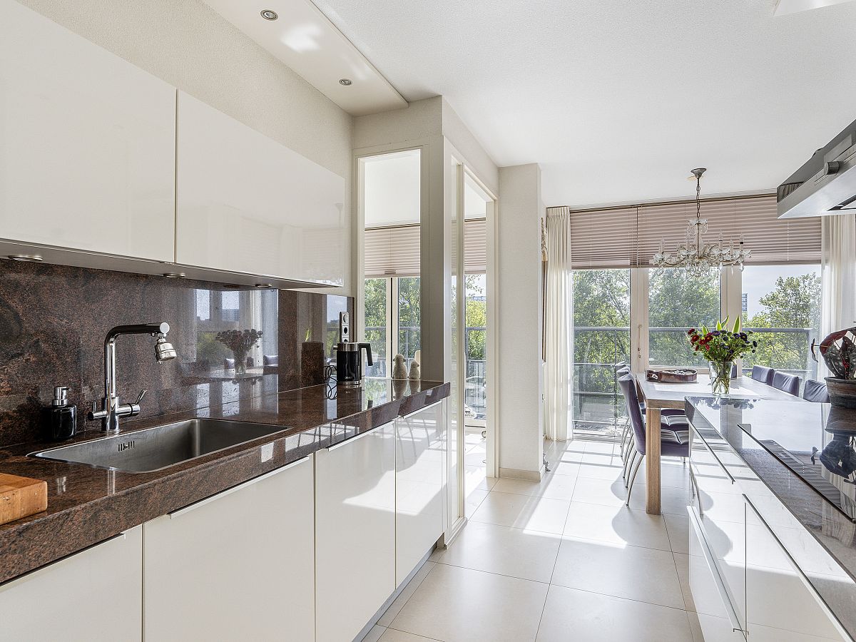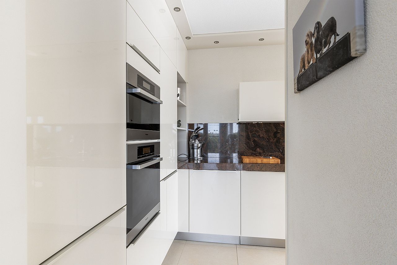 Luxe L-vormige half open keuken met extra dik hardstenen aanrechtblad en witte frontinrichting, Siemens/Miele inbouwapparatuur zoals extra royale koelkast en vriezer, combimagnetron, vaatwasser, inductie kookplaat, afzuigkap en waterzuivering apparaat.