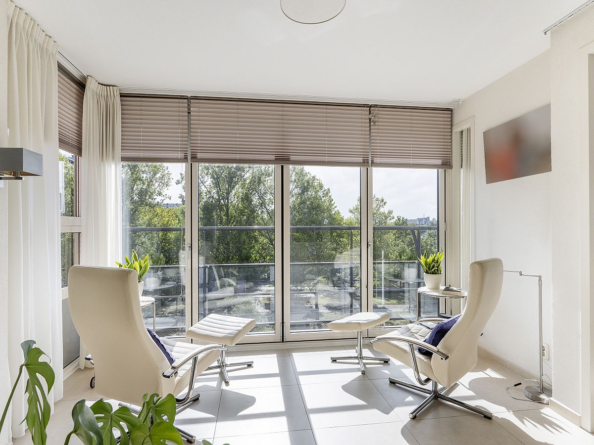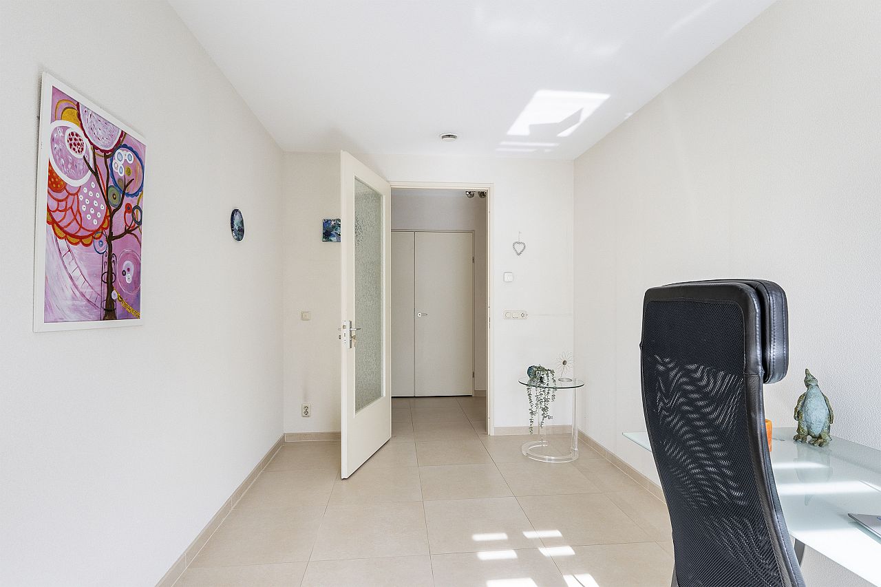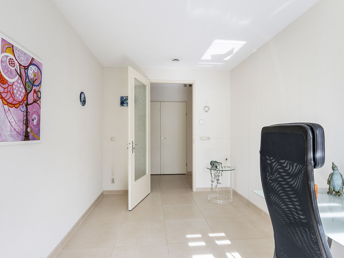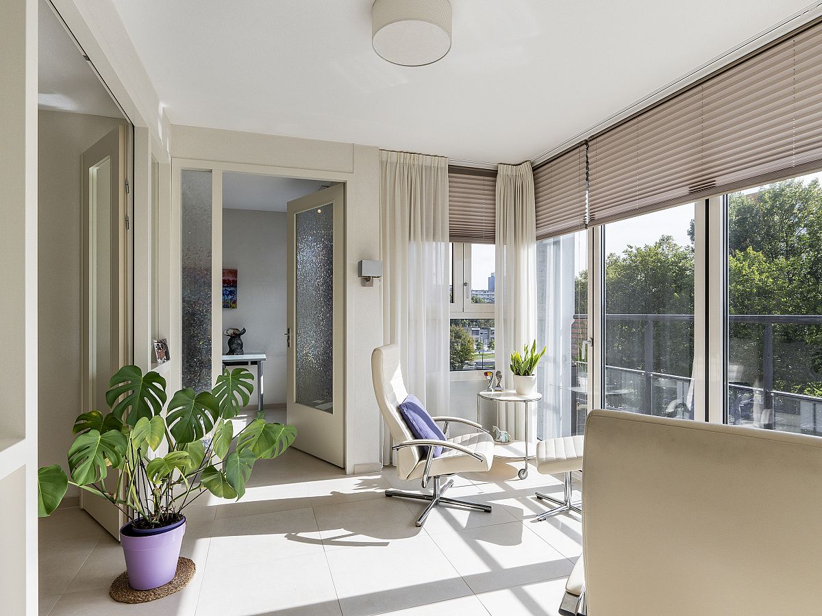 Aansluitend is de royale serre/loggia gelegen. Deze heeft een aluminium pui met harmonicadeuren en zonwering zodat u een beschut balkon op het zuiden kunt creëren.