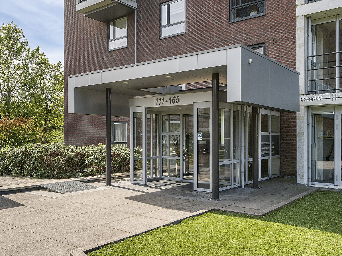 Afgesloten hoofdentree met videofoon en liften.
