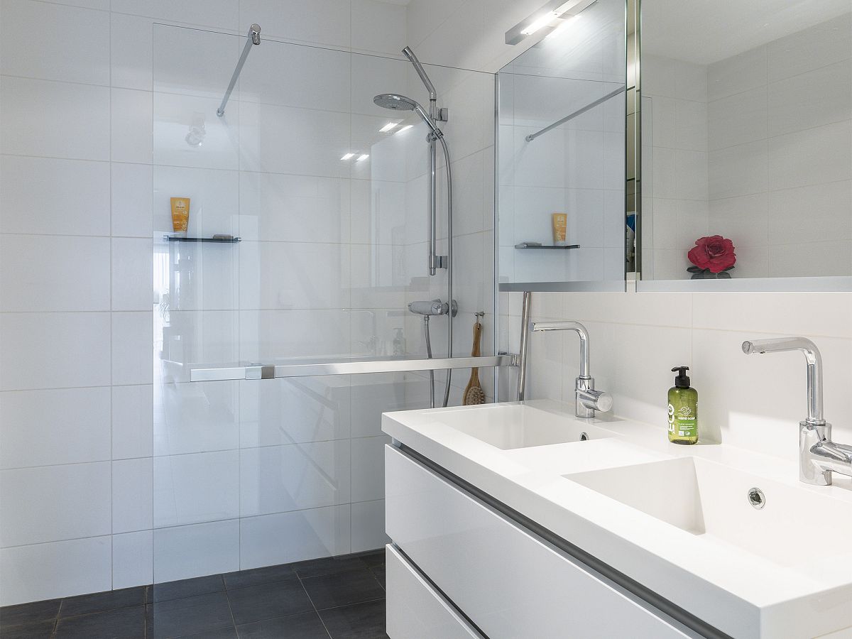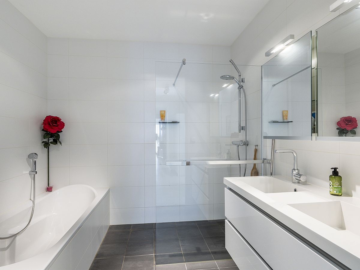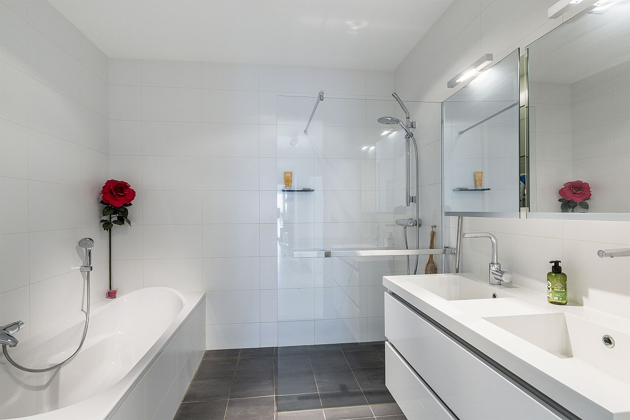 De badkamer is geheel wit betegeld en voorzien van inloopdouche, ligbad, wandclosetcombinatie, dubbele wastafelmeubel met spiegelkast.