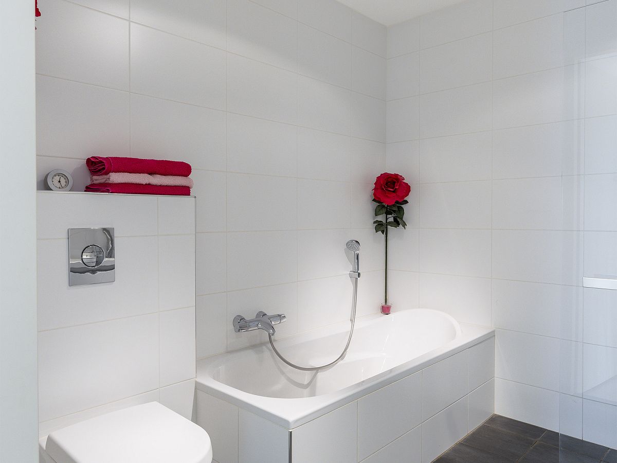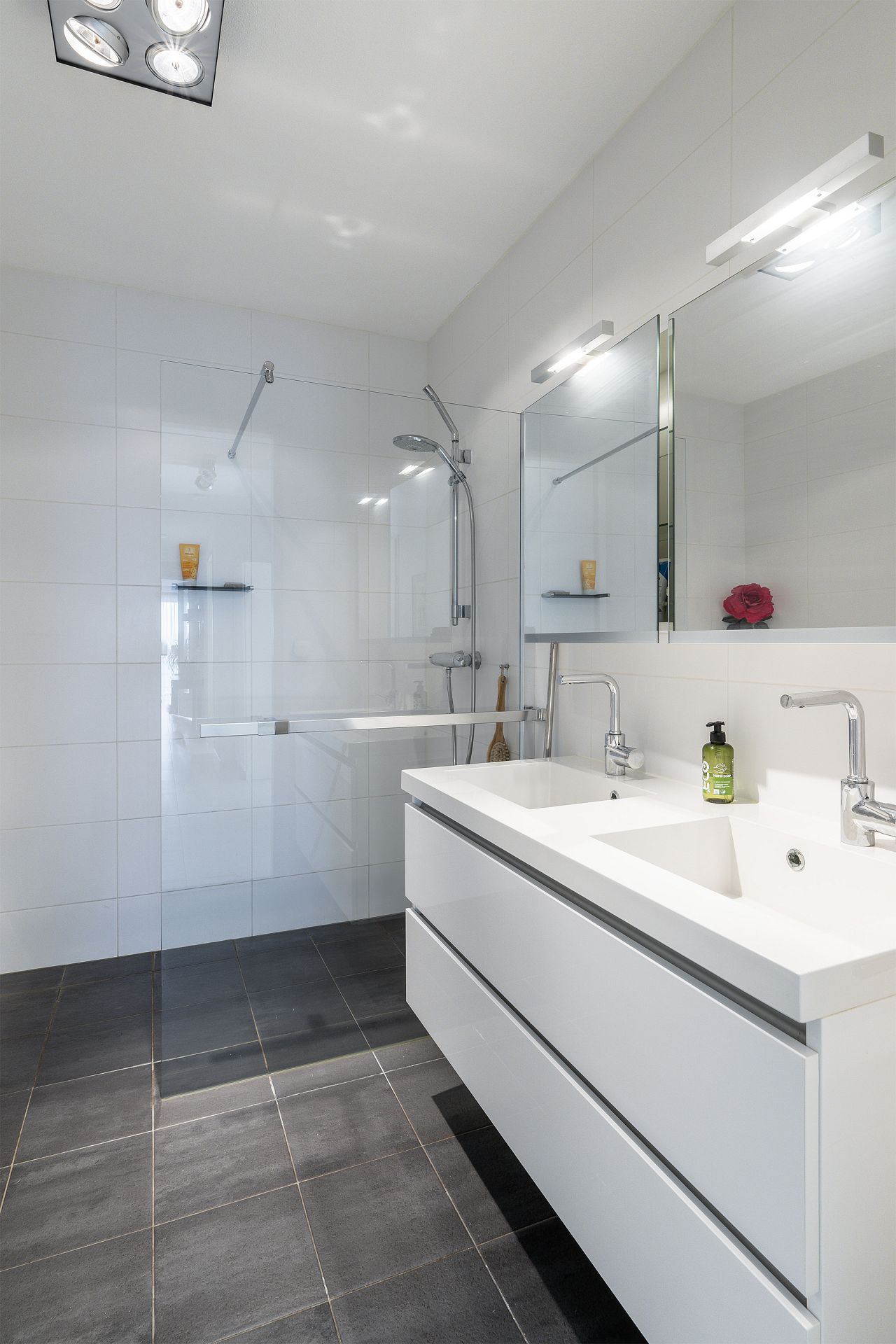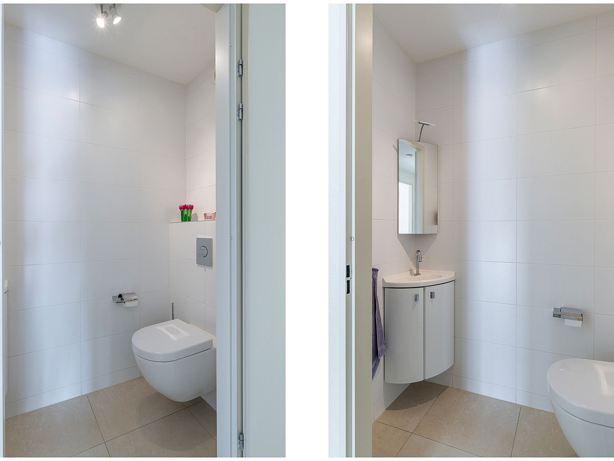 De badkamer is geheel wit betegeld en voorzien van inloopdouche, ligbad, wandclosetcombinatie, dubbele wastafelmeubel met spiegelkast.