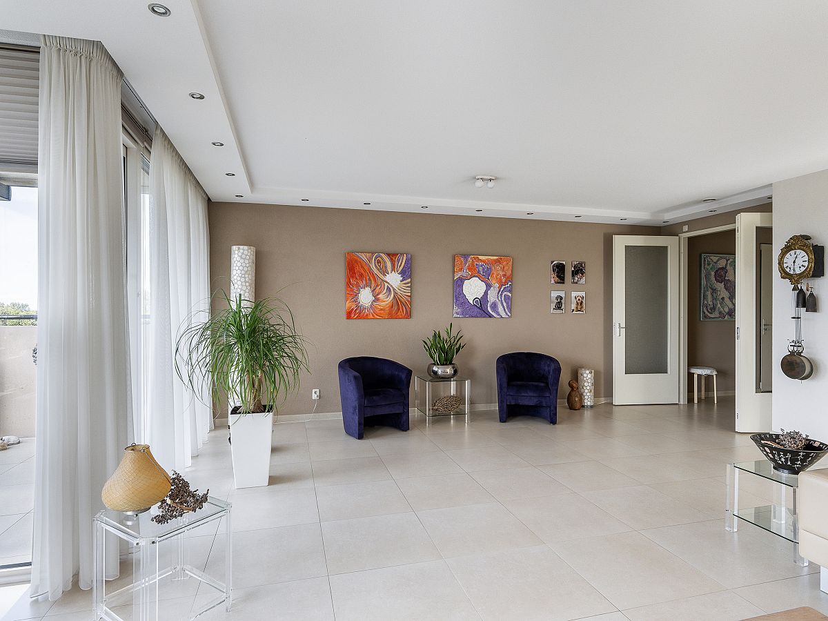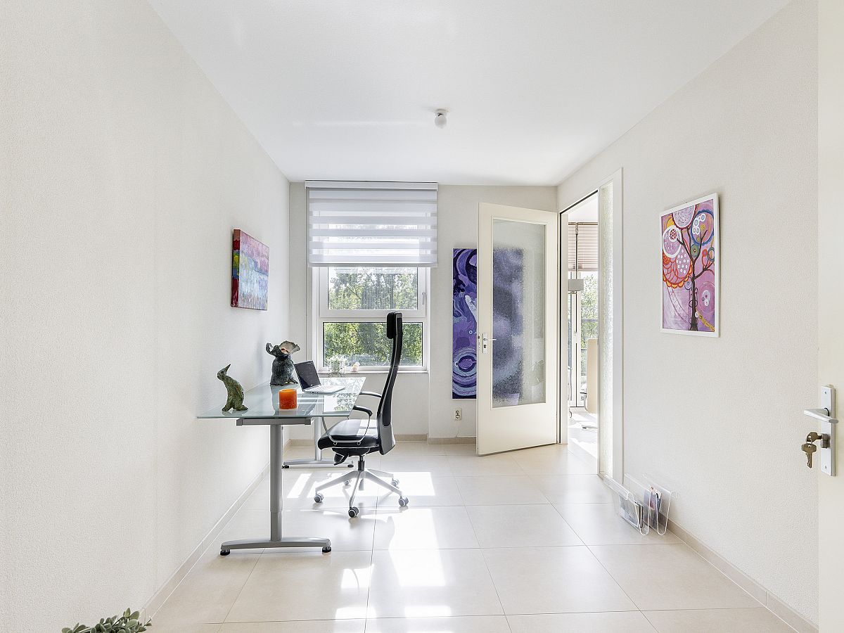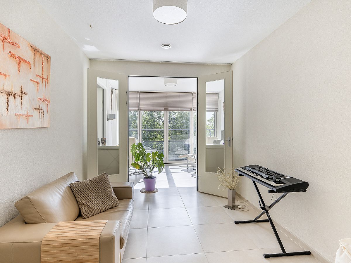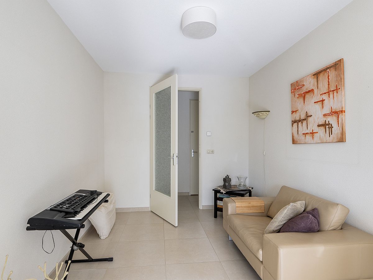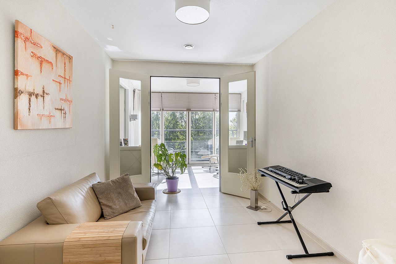 Openslaande deuren naar de woonkamer met een schuifpui naar het balkon op het westen. Het balkon heeft dezelfde betegeling als het appartement.