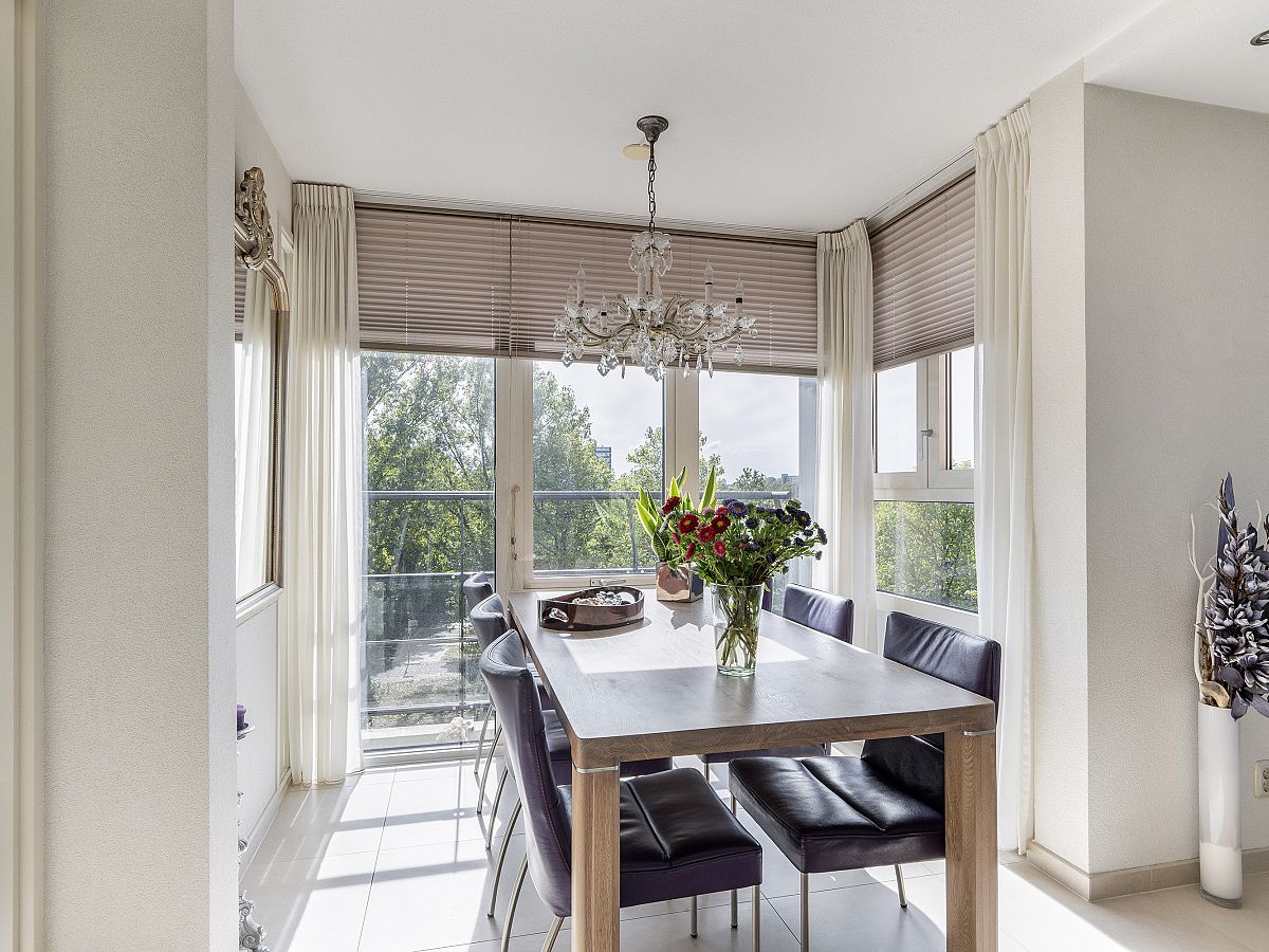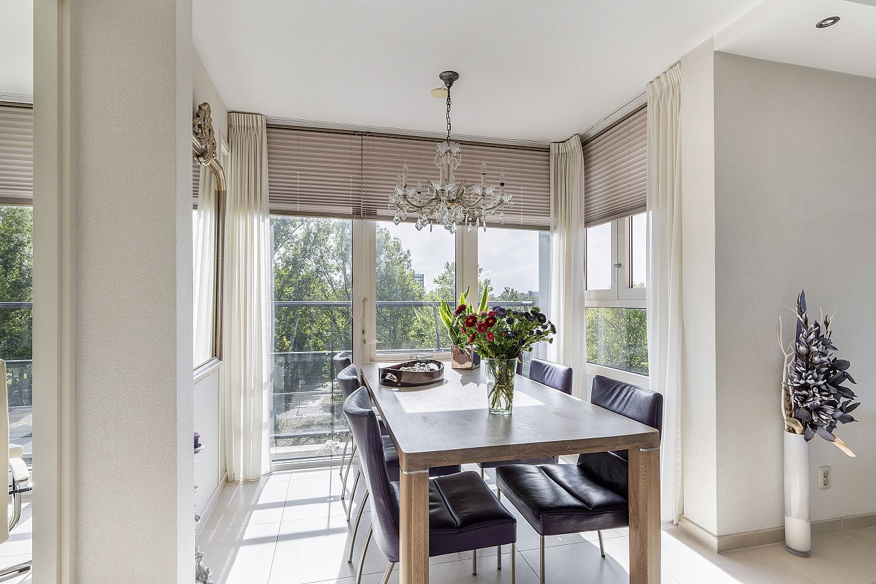 De eetkamer heeft een erker met daardoor nóg meer uitzicht.