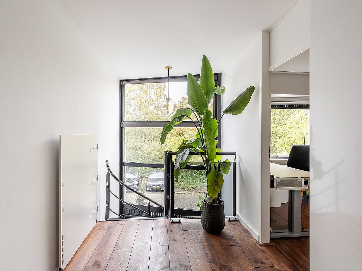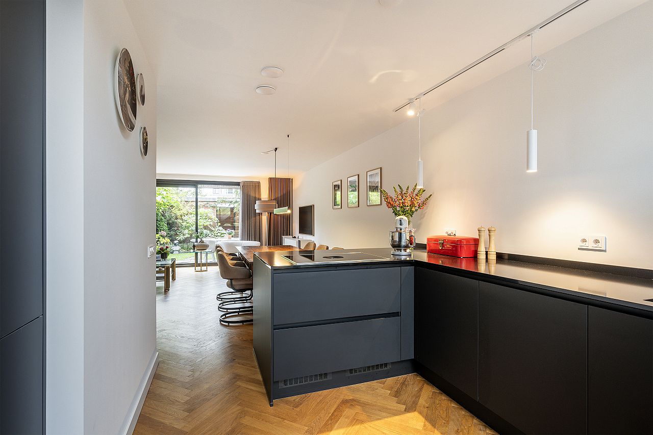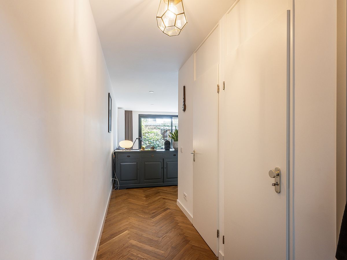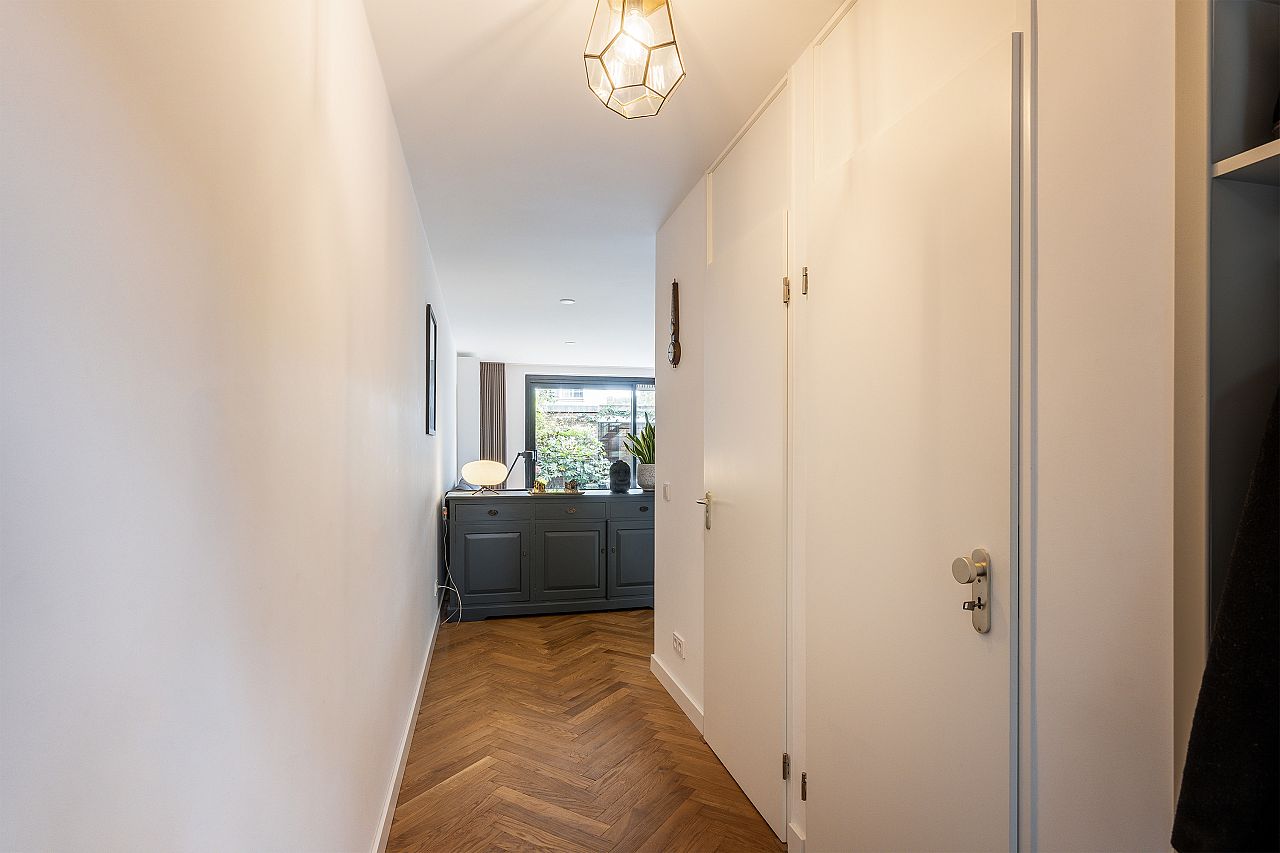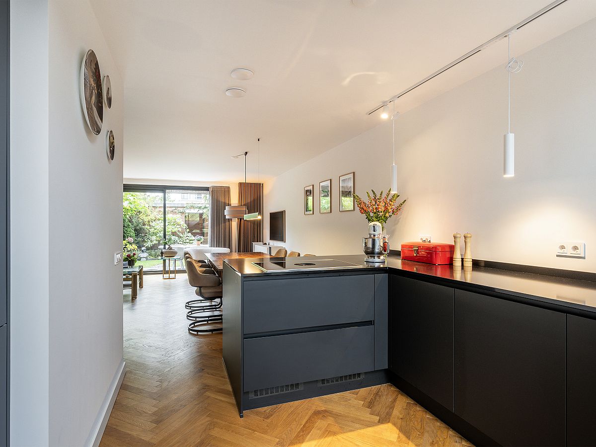 Ruime entree met maatwerk garderobekast, meterkast (volledig vernieuwd) en moderne toiletruimte. De begane grond is volledig voorzien van een eiken parketvloer met vloerverwarming. De woonkamer is strak afgewerkt. Aan de voorzijde van de woning ligt de royale open keuken, uitgevoerd met mat zwarte frontinrichting en aanrechtblad. De keuken bevat kwalitatief hoge inbouwapparatuur, te weten: inductiekookplaat, kokendwaterkraan, stoomoven, combi-oven met magnetronfunctie, vaatwasser, koel-/vriescombinatie en een koffiecorner. De schuifpui geeft toegang tot de zonnige en sfeervolle tuin op het westen, met volwassen beplanting en modern terras. Voorzien van elektrische zonwering, een ruime stenen schuur en achterom. Aan de voorzijde van de woning is tevens een fraai aangelegde, groene voortuin met praktische overkapping, ideaal voor het stallen van bijvoorbeeld fietsen.