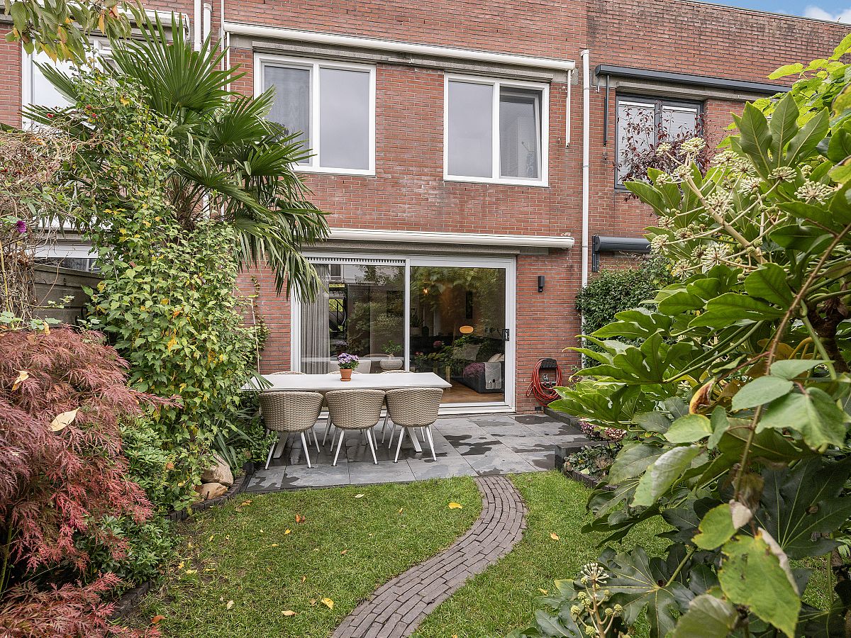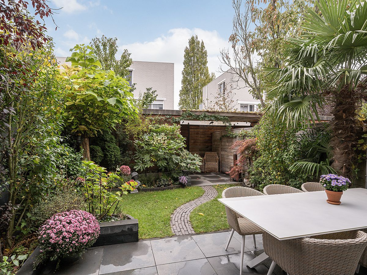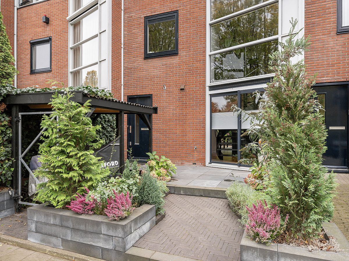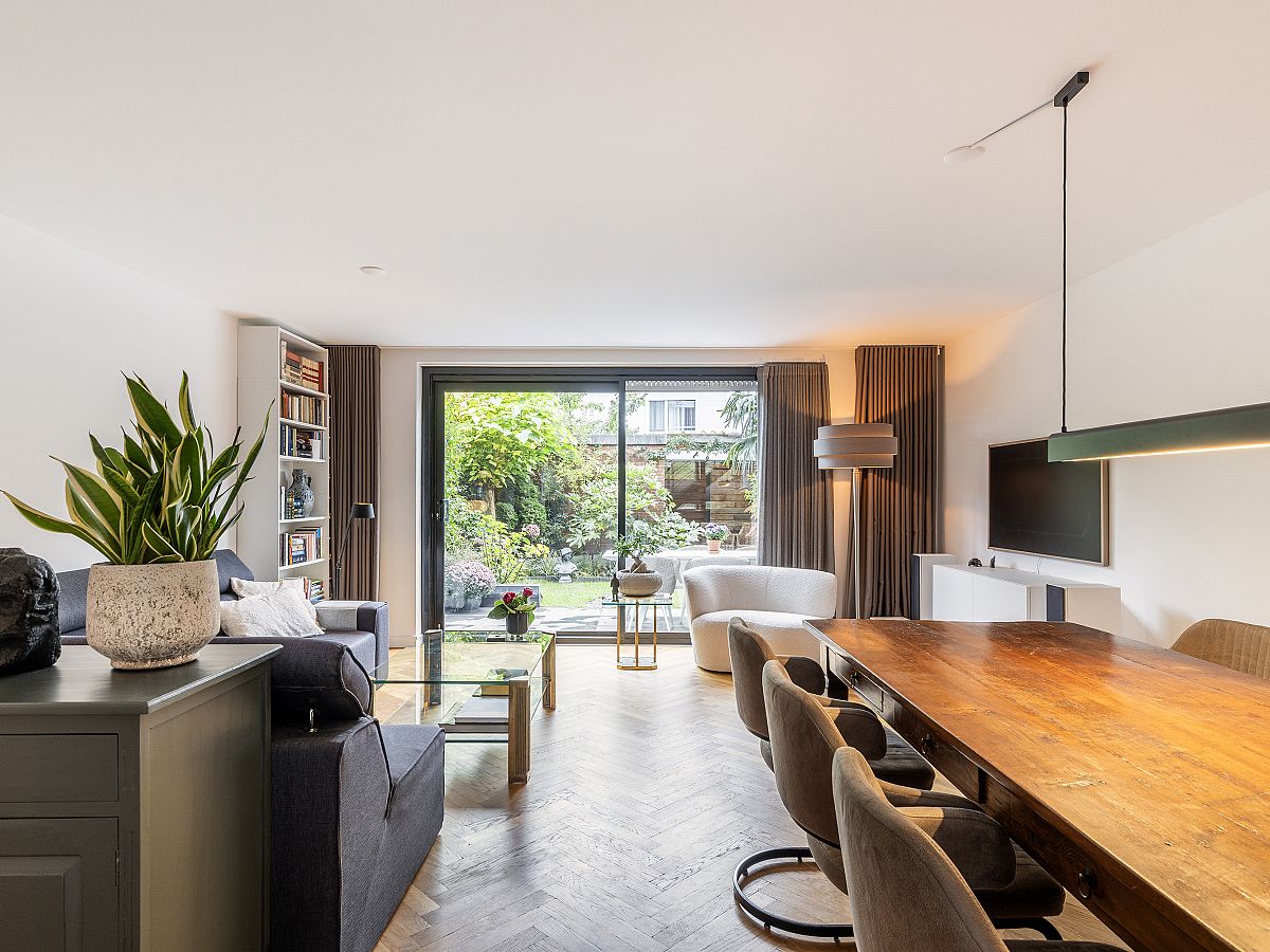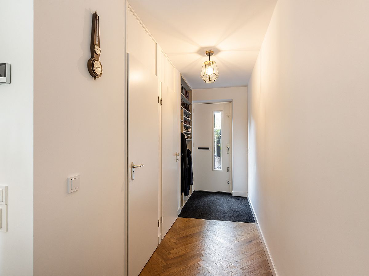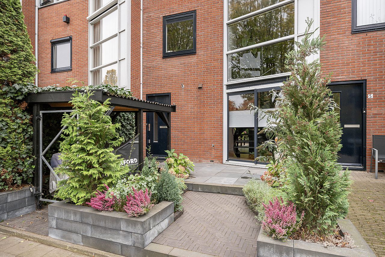 Ruime entree met maatwerk garderobekast, meterkast (volledig vernieuwd) en moderne toiletruimte. De begane grond is volledig voorzien van een eiken parketvloer met vloerverwarming. De woonkamer is strak afgewerkt. Aan de voorzijde van de woning ligt de royale open keuken, uitgevoerd met mat zwarte frontinrichting en aanrechtblad. De keuken bevat kwalitatief hoge inbouwapparatuur, te weten: inductiekookplaat, kokendwaterkraan, stoomoven, combi-oven met magnetronfunctie, vaatwasser, koel-/vriescombinatie en een koffiecorner. De schuifpui geeft toegang tot de zonnige en sfeervolle tuin op het westen, met volwassen beplanting en modern terras. Voorzien van elektrische zonwering, een ruime stenen schuur en achterom. Aan de voorzijde van de woning is tevens een fraai aangelegde, groene voortuin met praktische overkapping, ideaal voor het stallen van bijvoorbeeld fietsen.