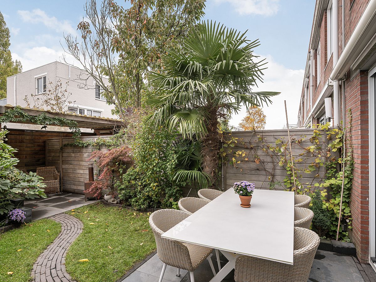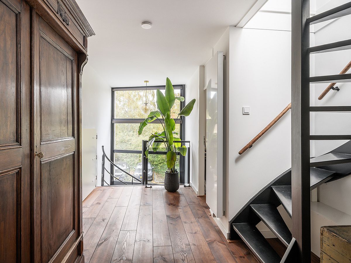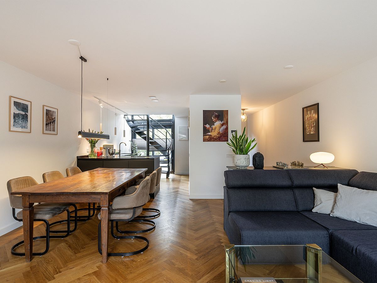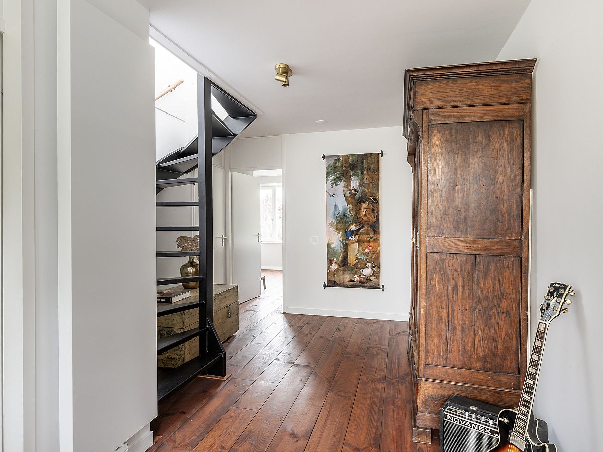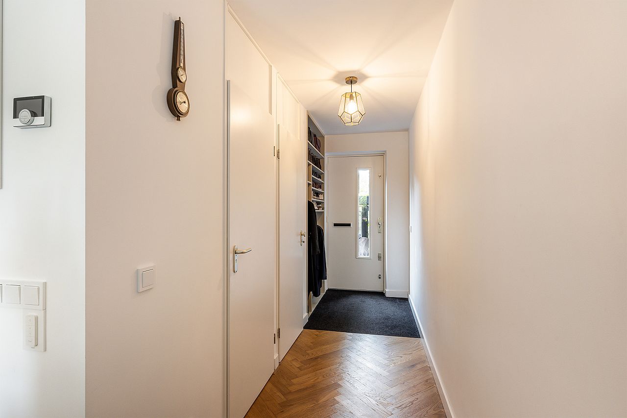 Ruime entree met maatwerk garderobekast, meterkast (volledig vernieuwd) en moderne toiletruimte. De begane grond is volledig voorzien van een eiken parketvloer met vloerverwarming. De woonkamer is strak afgewerkt. Aan de voorzijde van de woning ligt de royale open keuken, uitgevoerd met mat zwarte frontinrichting en aanrechtblad. De keuken bevat kwalitatief hoge inbouwapparatuur, te weten: inductiekookplaat, kokendwaterkraan, stoomoven, combi-oven met magnetronfunctie, vaatwasser, koel-/vriescombinatie en een koffiecorner. De schuifpui geeft toegang tot de zonnige en sfeervolle tuin op het westen, met volwassen beplanting en modern terras. Voorzien van elektrische zonwering, een ruime stenen schuur en achterom. Aan de voorzijde van de woning is tevens een fraai aangelegde, groene voortuin met praktische overkapping, ideaal voor het stallen van bijvoorbeeld fietsen.