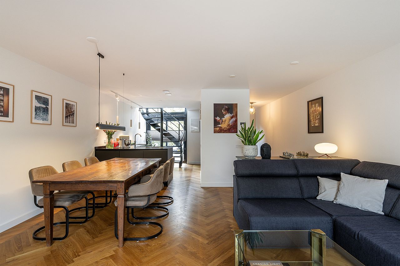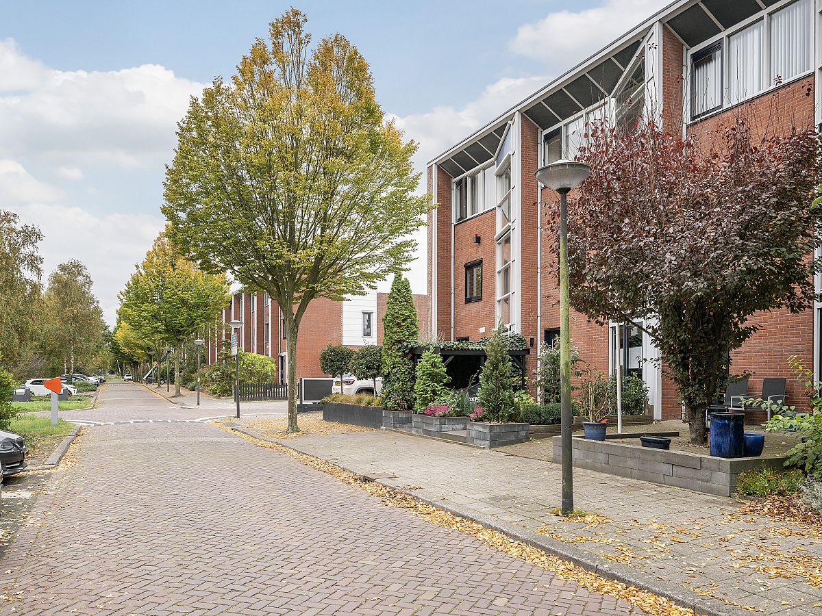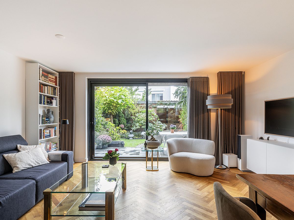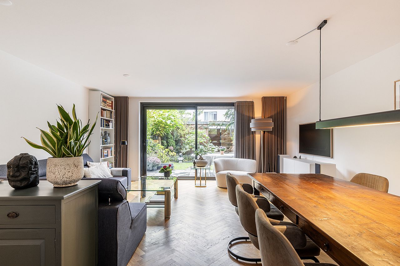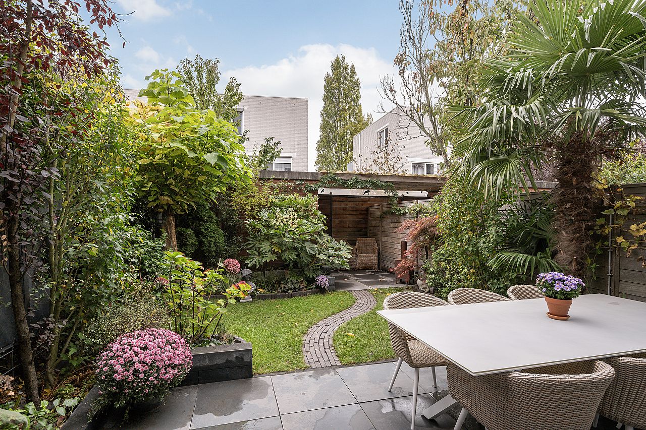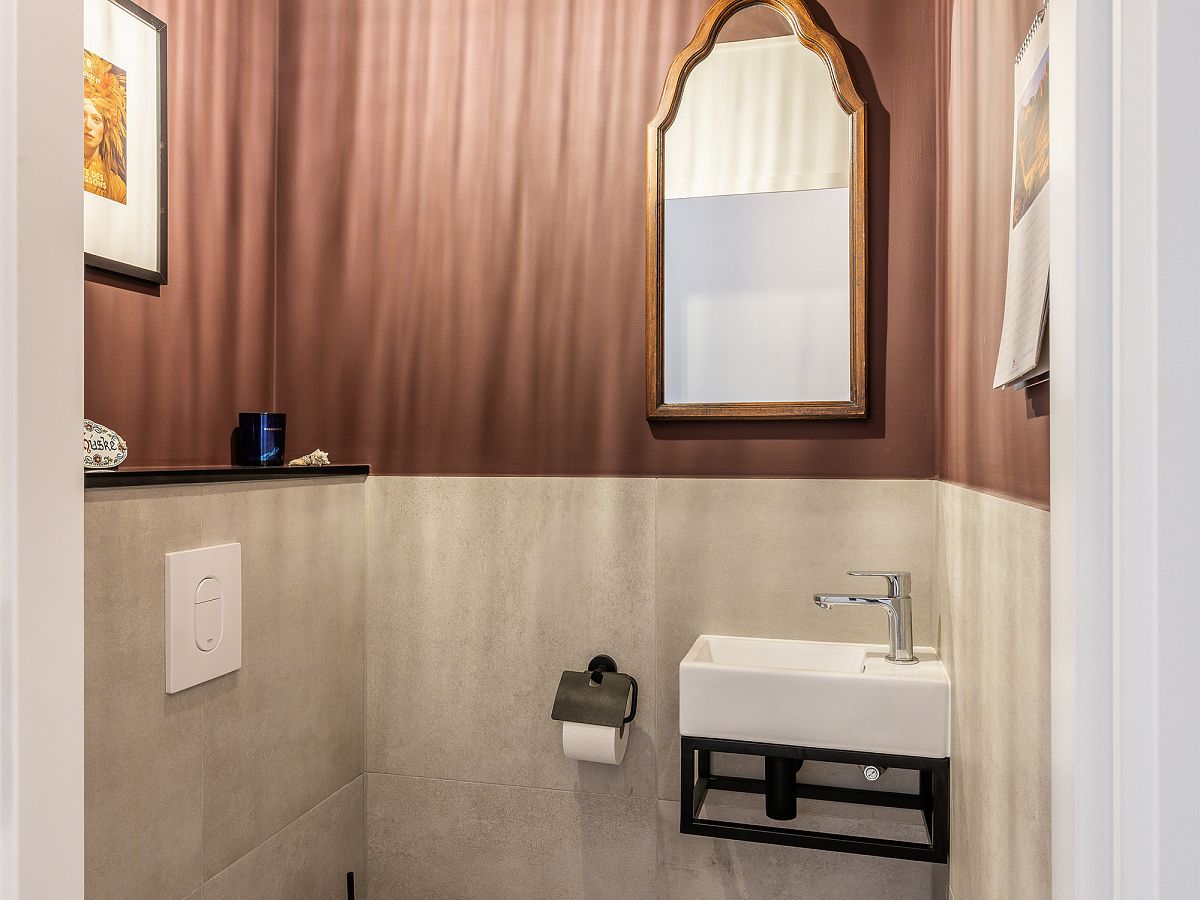 Ruime entree met maatwerk garderobekast, meterkast (volledig vernieuwd) en moderne toiletruimte. De begane grond is volledig voorzien van een eiken parketvloer met vloerverwarming. De woonkamer is strak afgewerkt. Aan de voorzijde van de woning ligt de royale open keuken, uitgevoerd met mat zwarte frontinrichting en aanrechtblad. De keuken bevat kwalitatief hoge inbouwapparatuur, te weten: inductiekookplaat, kokendwaterkraan, stoomoven, combi-oven met magnetronfunctie, vaatwasser, koel-/vriescombinatie en een koffiecorner. De schuifpui geeft toegang tot de zonnige en sfeervolle tuin op het westen, met volwassen beplanting en modern terras. Voorzien van elektrische zonwering, een ruime stenen schuur en achterom. Aan de voorzijde van de woning is tevens een fraai aangelegde, groene voortuin met praktische overkapping, ideaal voor het stallen van bijvoorbeeld fietsen.