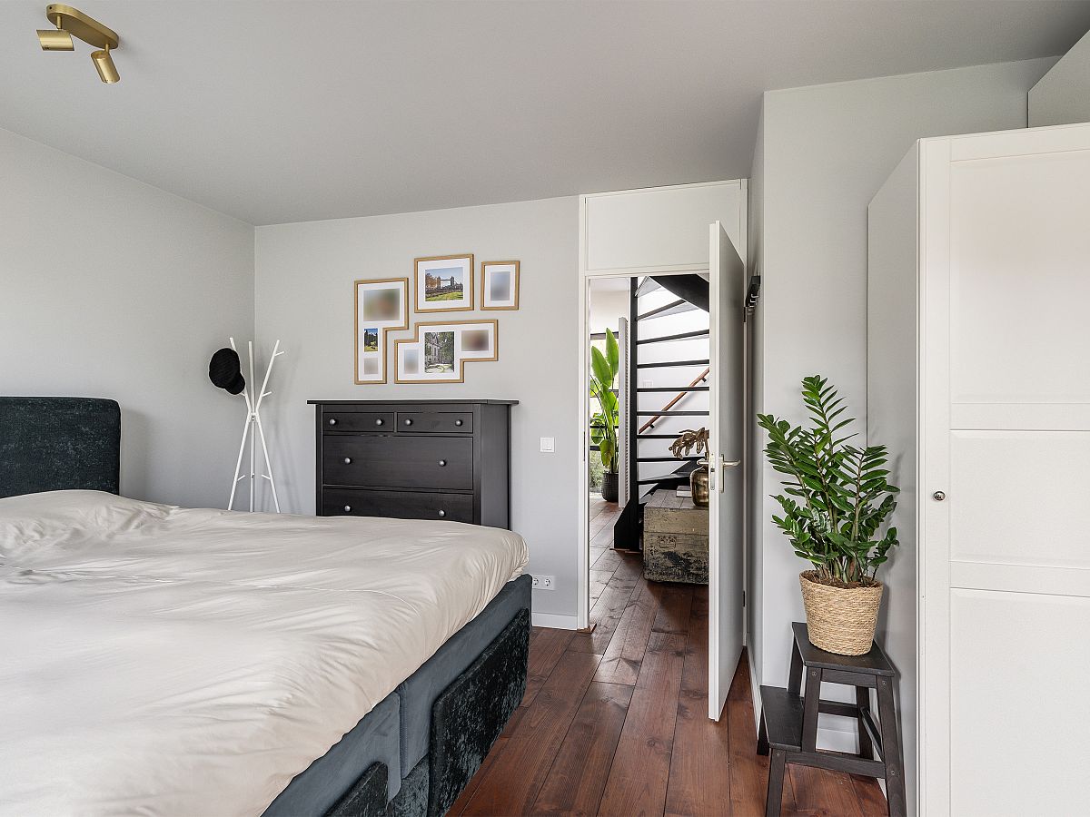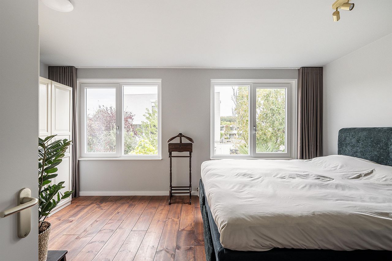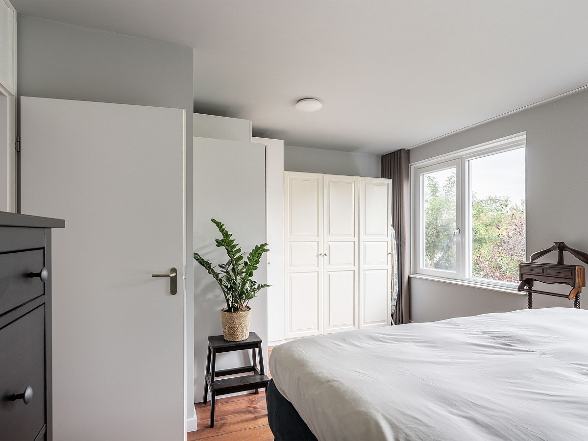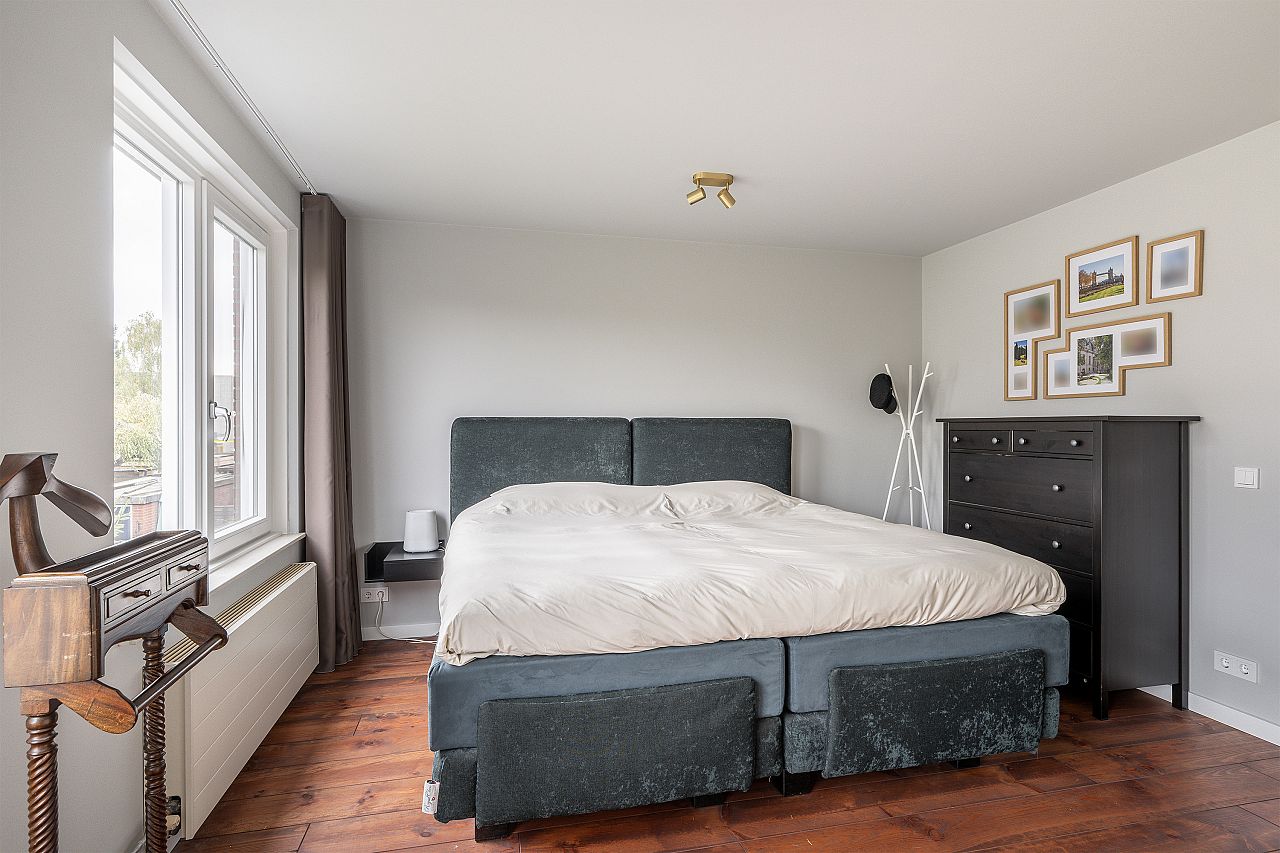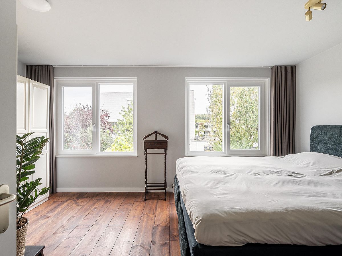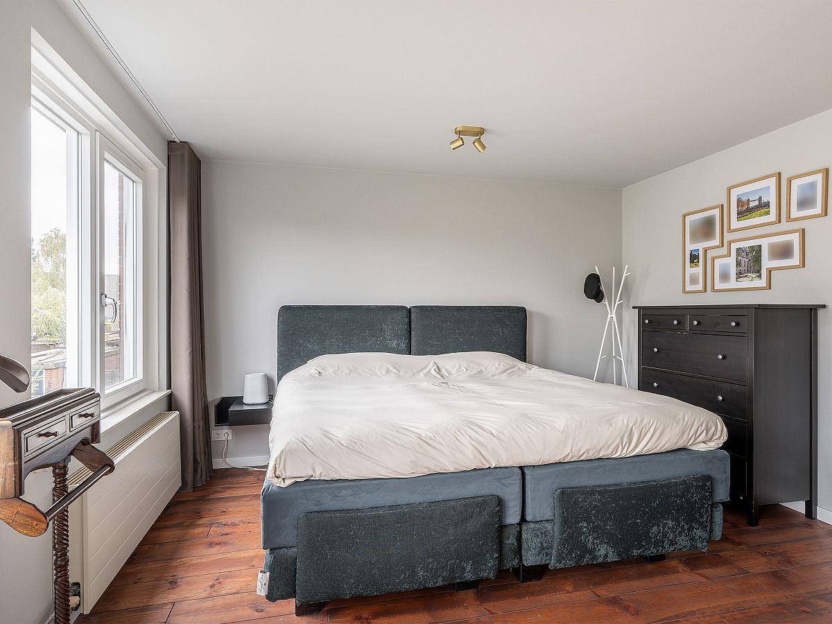 Ruime overloop met massief houten vloerdelen. De uitgebouwde badkamer is uitgerust met moderne wand- en vloertegels, een zeer royale inloopdouche met dubbele (massage) douchekop, ligbad, toilet en wastafelmeubel. De grote slaapkamer aan de achterzijde is voorzien van nieuwe kunststof kozijnen met HR++ beglazing en elektrische zonwering. Voorheen bevond zich hier nog een extra slaapkamer, deze kan indien gewenst gemakkelijk weer worden gerealiseerd. Ook deze verdieping heeft een strakke wand- en plafondafwerking. Aan de voorzijde bevindt zich nog een slaapkamer, die momenteel als werkruimte in gebruik is.