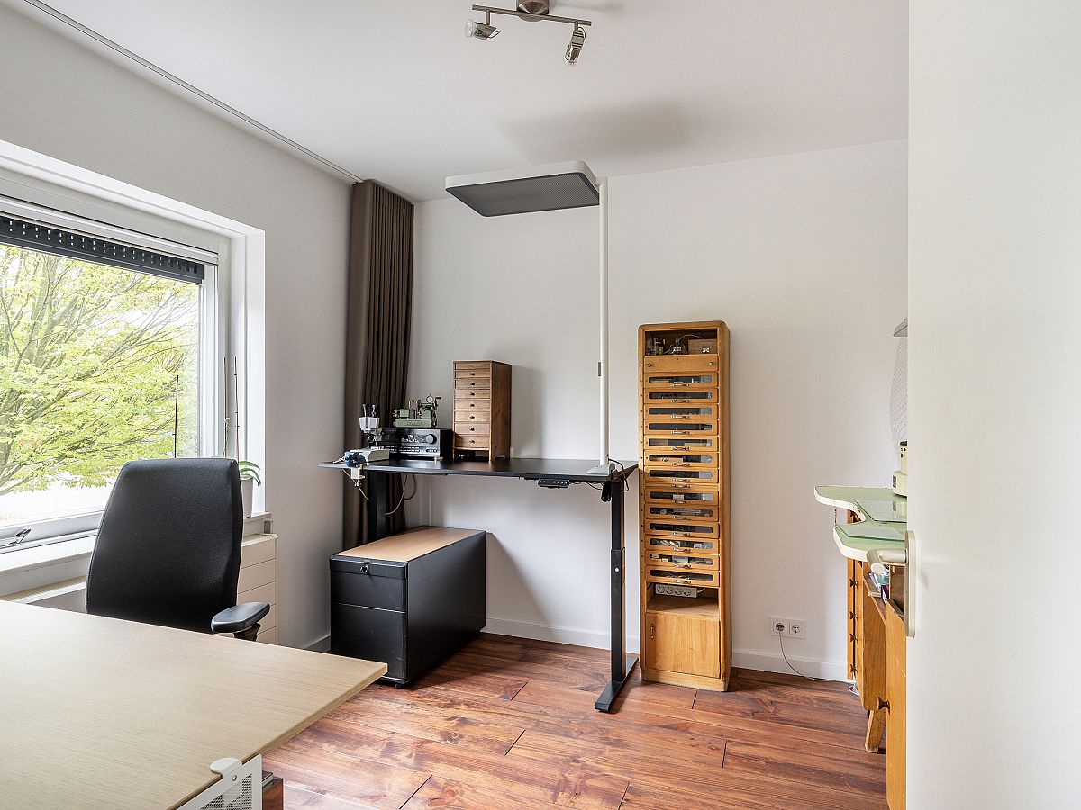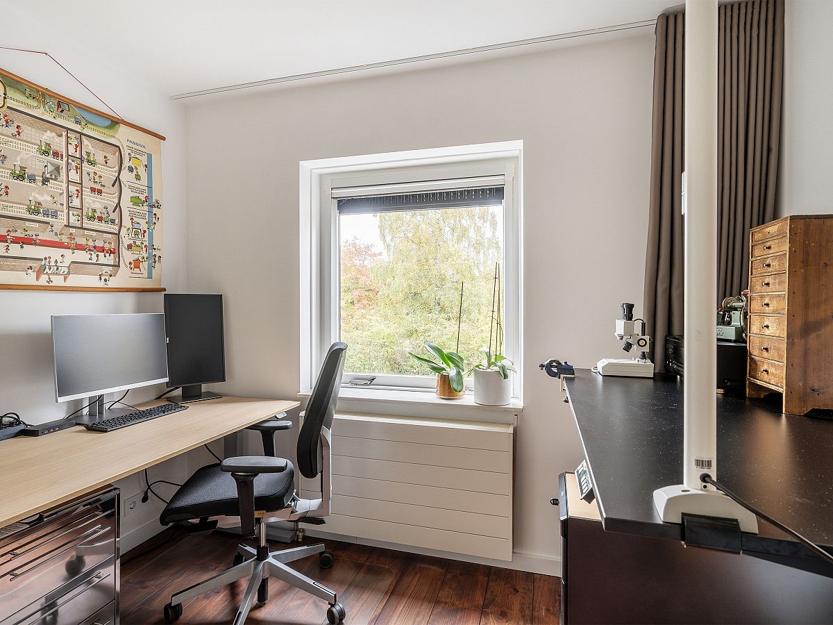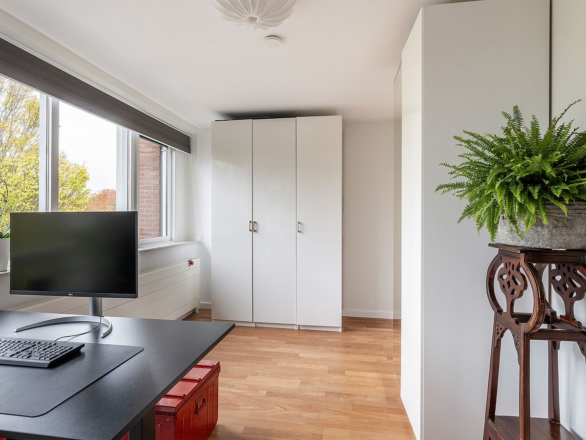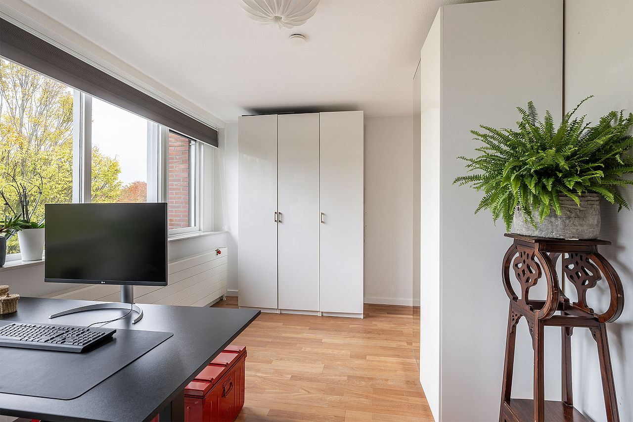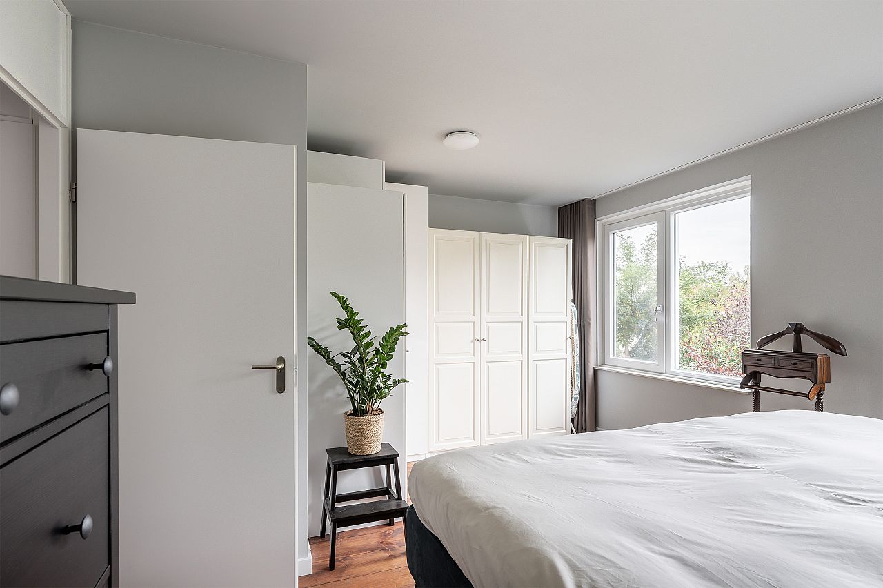 Ruime overloop met massief houten vloerdelen. De uitgebouwde badkamer is uitgerust met moderne wand- en vloertegels, een zeer royale inloopdouche met dubbele (massage) douchekop, ligbad, toilet en wastafelmeubel. De grote slaapkamer aan de achterzijde is voorzien van nieuwe kunststof kozijnen met HR++ beglazing en elektrische zonwering. Voorheen bevond zich hier nog een extra slaapkamer, deze kan indien gewenst gemakkelijk weer worden gerealiseerd. Ook deze verdieping heeft een strakke wand- en plafondafwerking. Aan de voorzijde bevindt zich nog een slaapkamer, die momenteel als werkruimte in gebruik is.