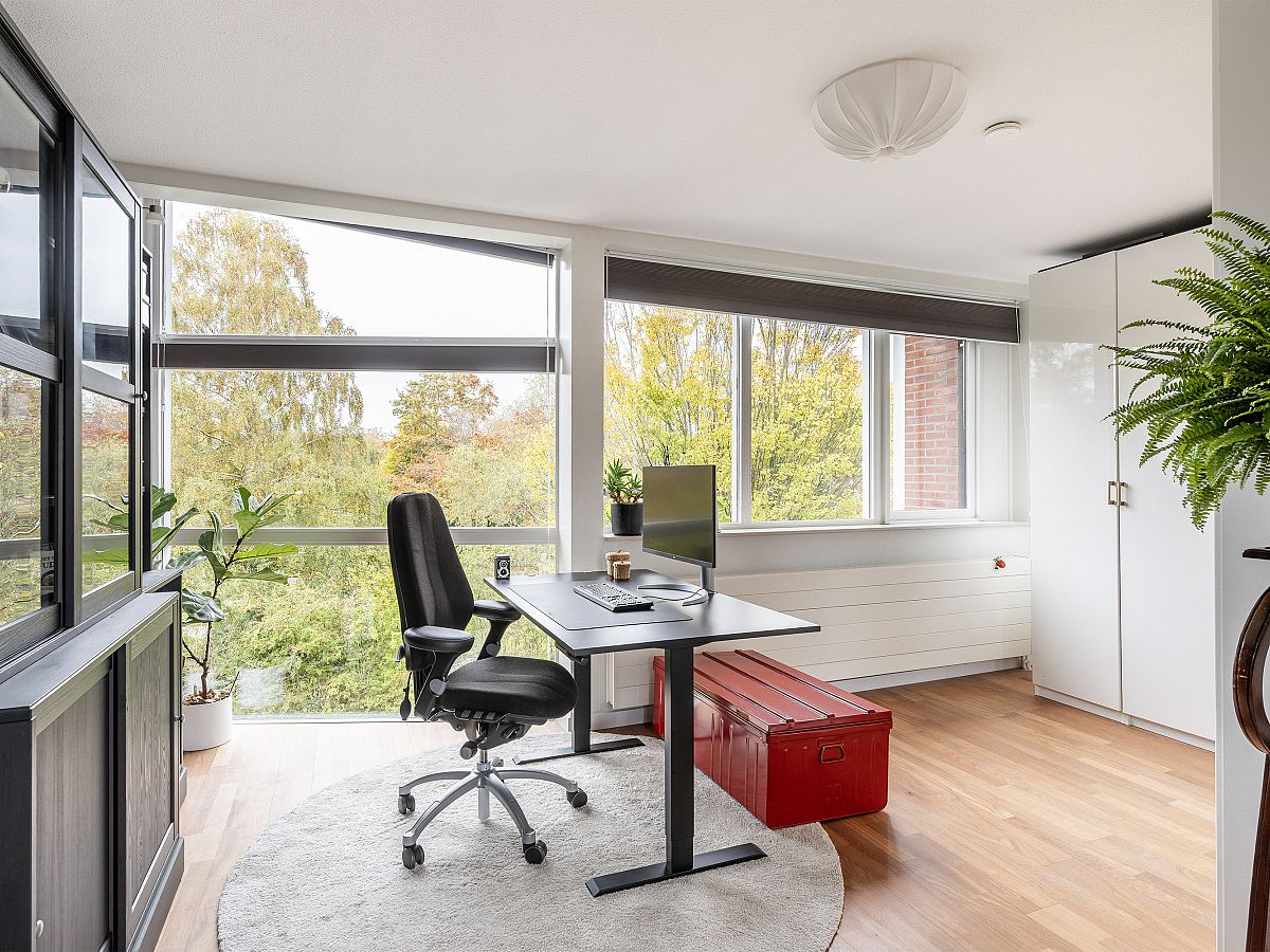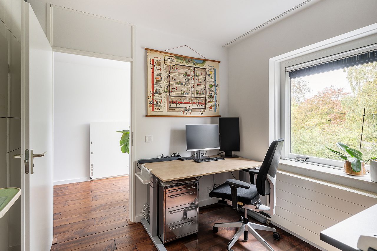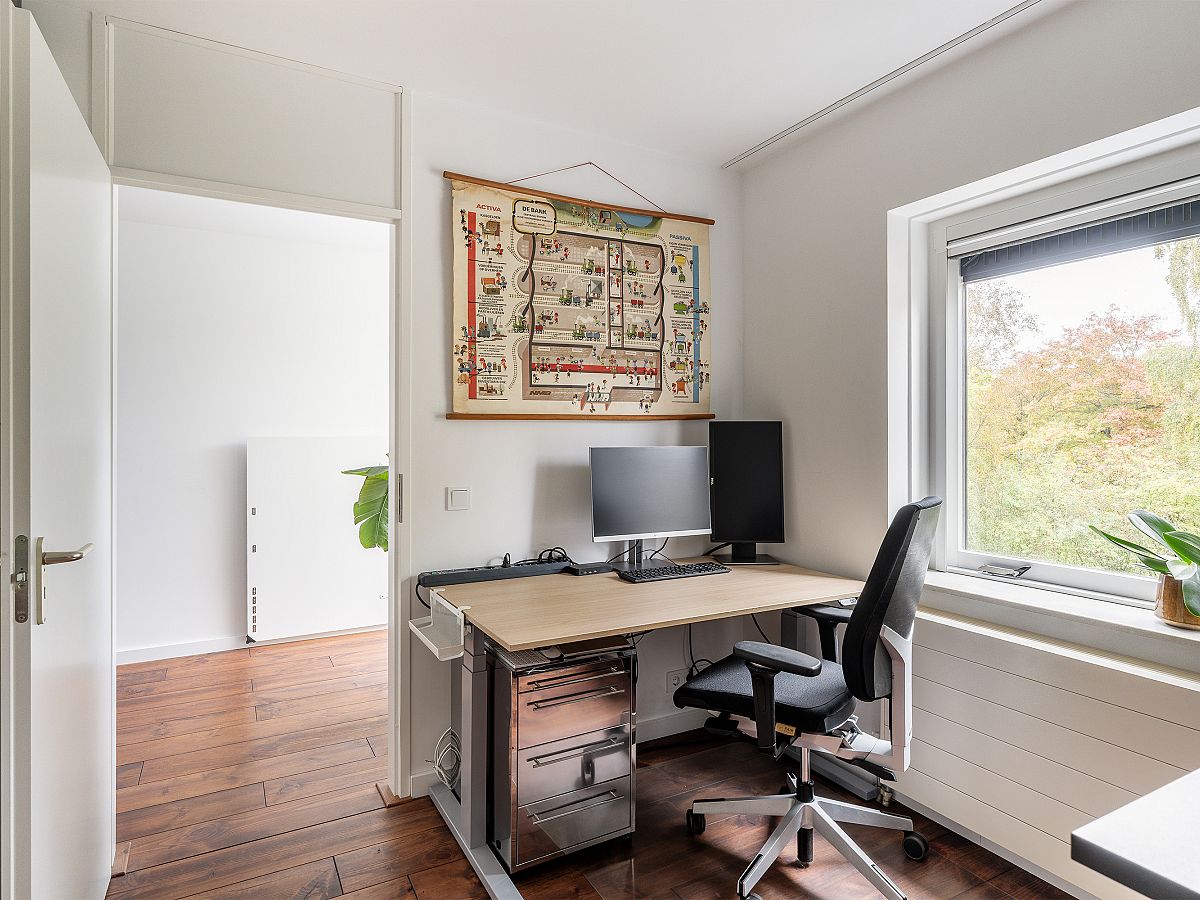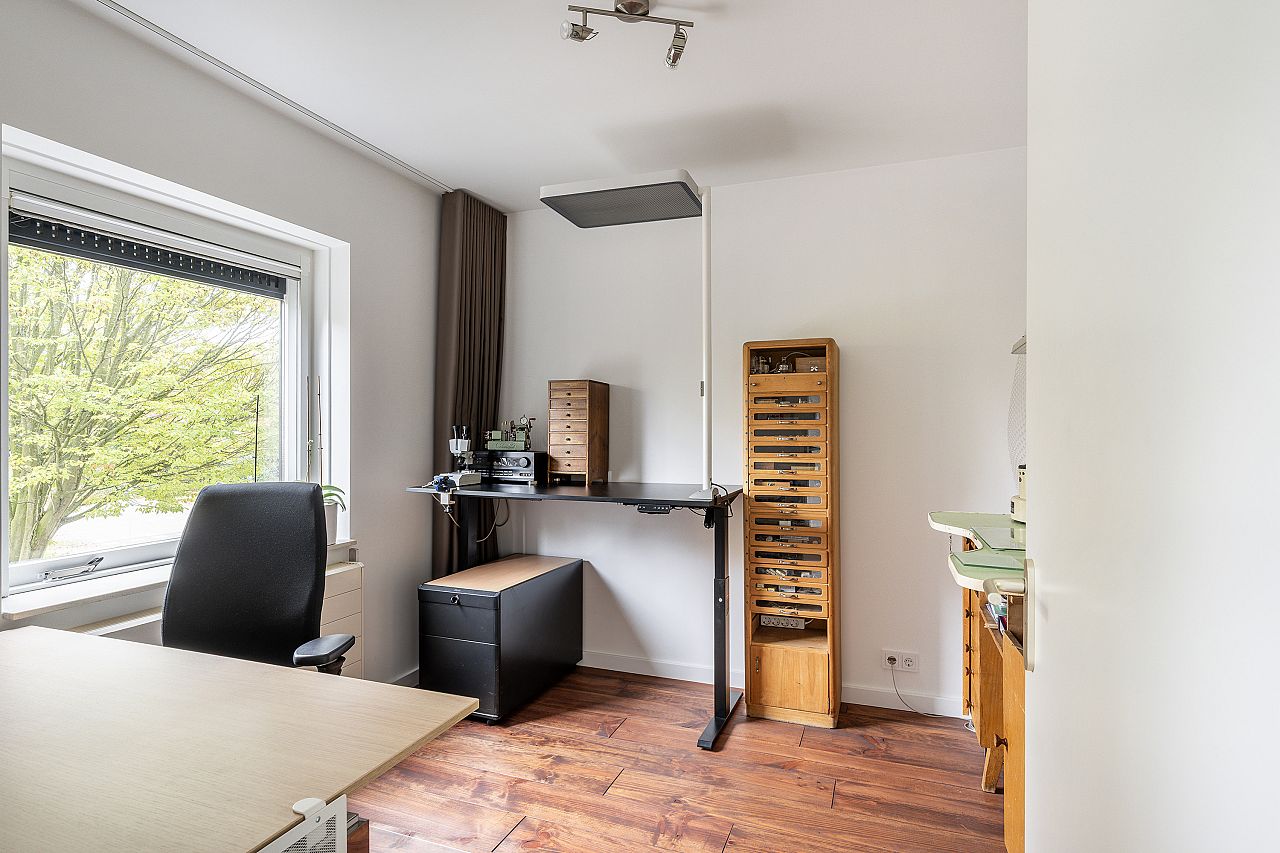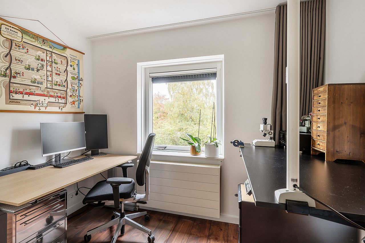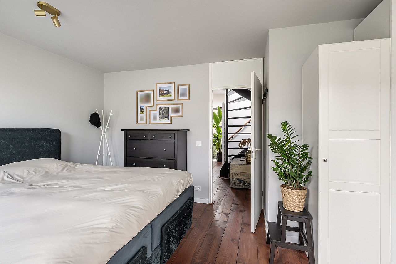 Ruime overloop met massief houten vloerdelen. De uitgebouwde badkamer is uitgerust met moderne wand- en vloertegels, een zeer royale inloopdouche met dubbele (massage) douchekop, ligbad, toilet en wastafelmeubel. De grote slaapkamer aan de achterzijde is voorzien van nieuwe kunststof kozijnen met HR++ beglazing en elektrische zonwering. Voorheen bevond zich hier nog een extra slaapkamer, deze kan indien gewenst gemakkelijk weer worden gerealiseerd. Ook deze verdieping heeft een strakke wand- en plafondafwerking. Aan de voorzijde bevindt zich nog een slaapkamer, die momenteel als werkruimte in gebruik is.