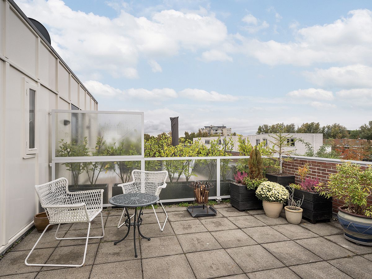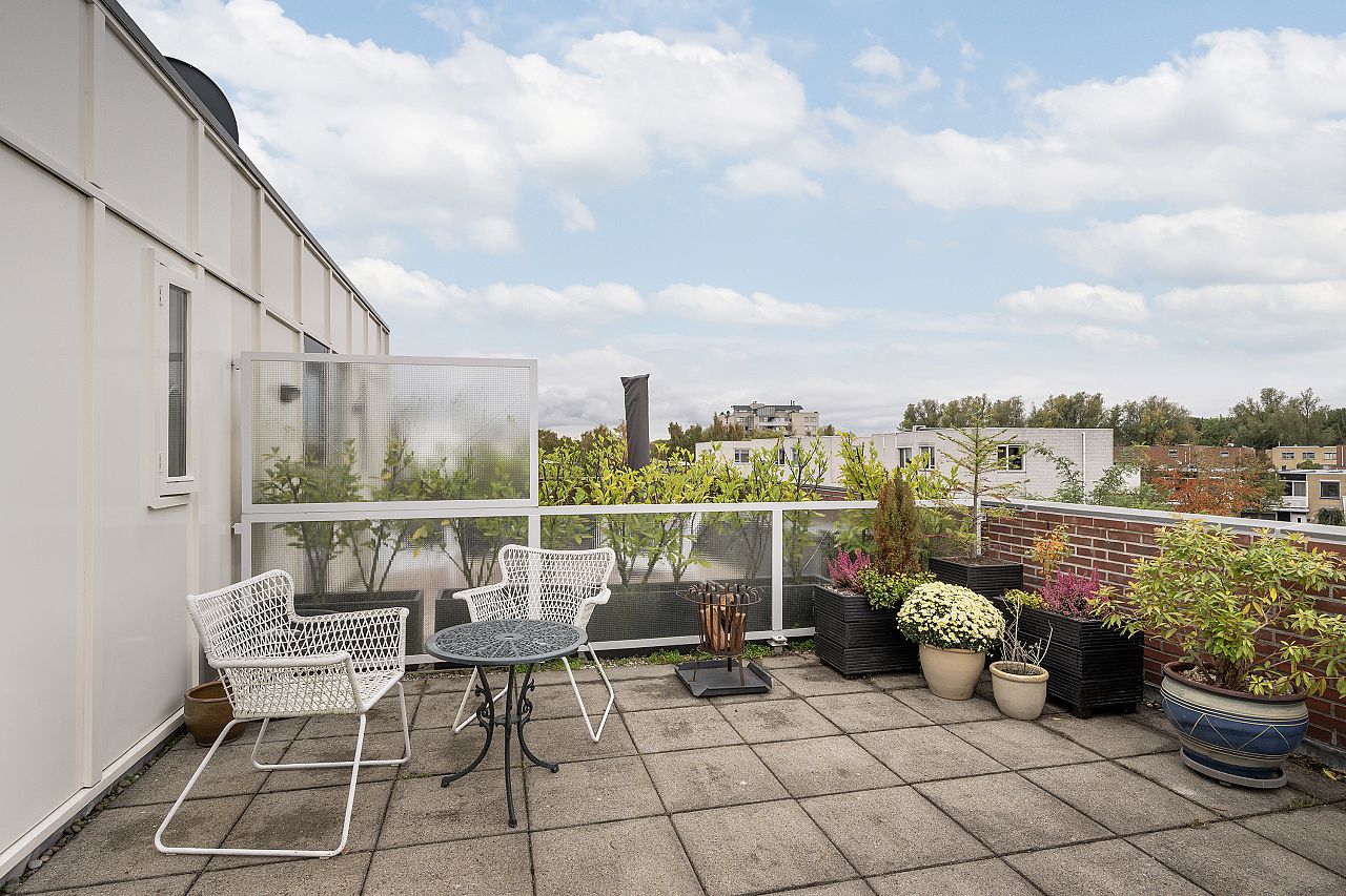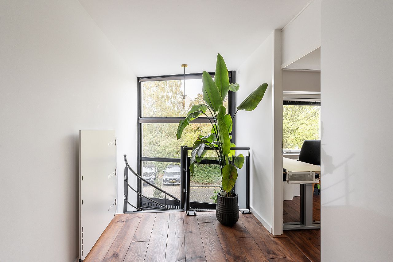 De tweede verdieping is voorzien van een mooie parketvloer. De overloop geeft toegang tot een ruime slaapkamer met veel lichtinval, welke momenteel ook als werkkamer in gebruik is. Op deze verdieping bevindt zich een wasruimte met CV combiketel (Remeha 2022), tevens geschikt als ruimte om een tweede badkamer te creëren. Via de overloop bereik je het dakterras. Zeer ruim, zonnig tot in de late avonduren en biedt mogelijkheden om de woning uit te bouwen.