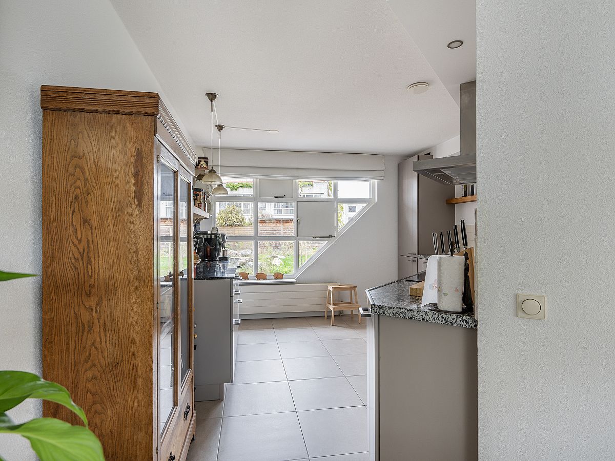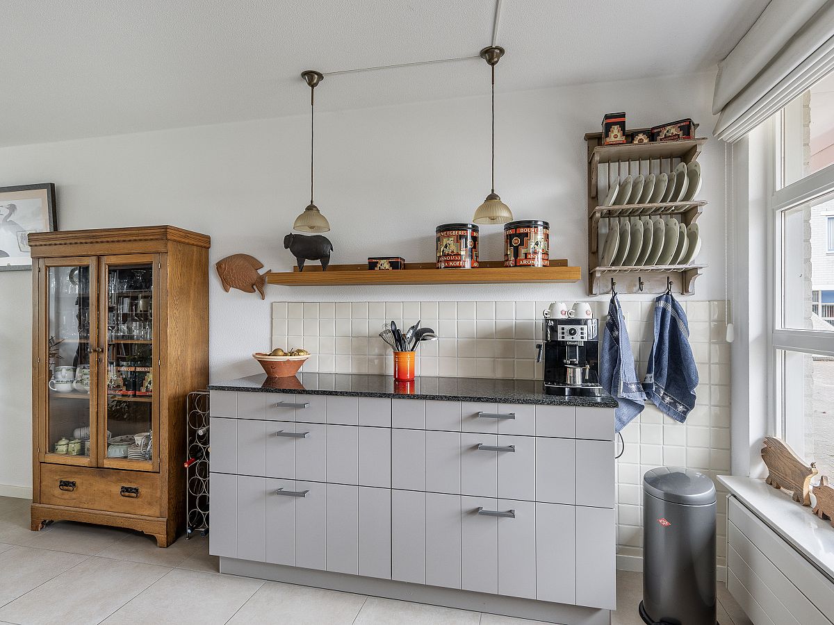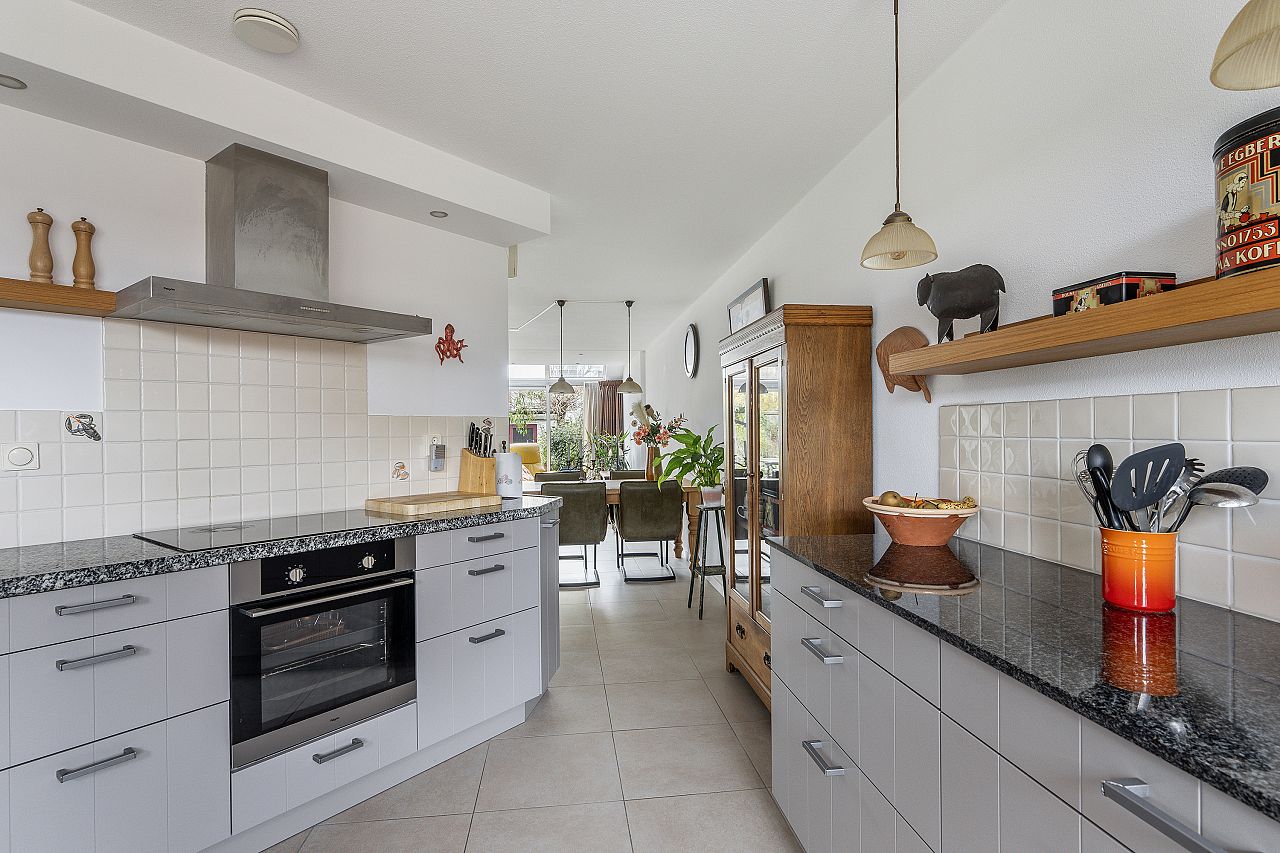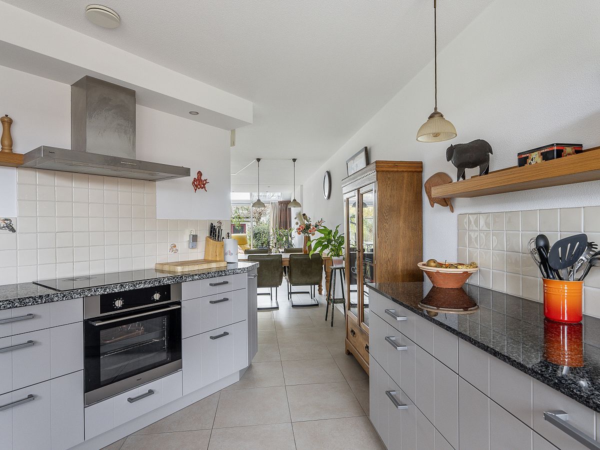 Aan de voorzijde is de keuken gelegen. De keuken heeft leemkleurige fronten en een granieten werkblad. De keuken is uitgerust met een hete lucht-oven, inductiekookplaat, afzuigkap, apothekerskast, vaatwasser, koelkast en vriezer.