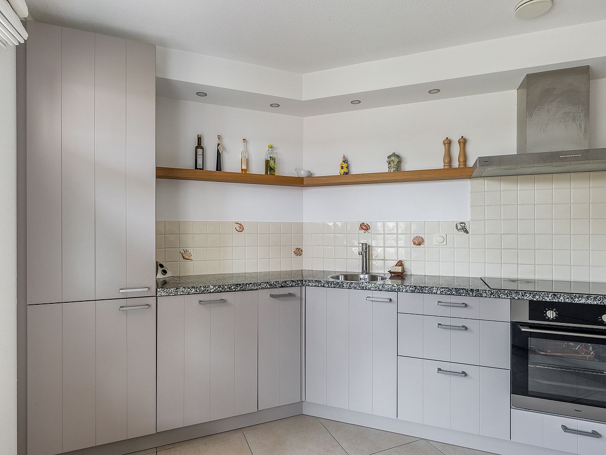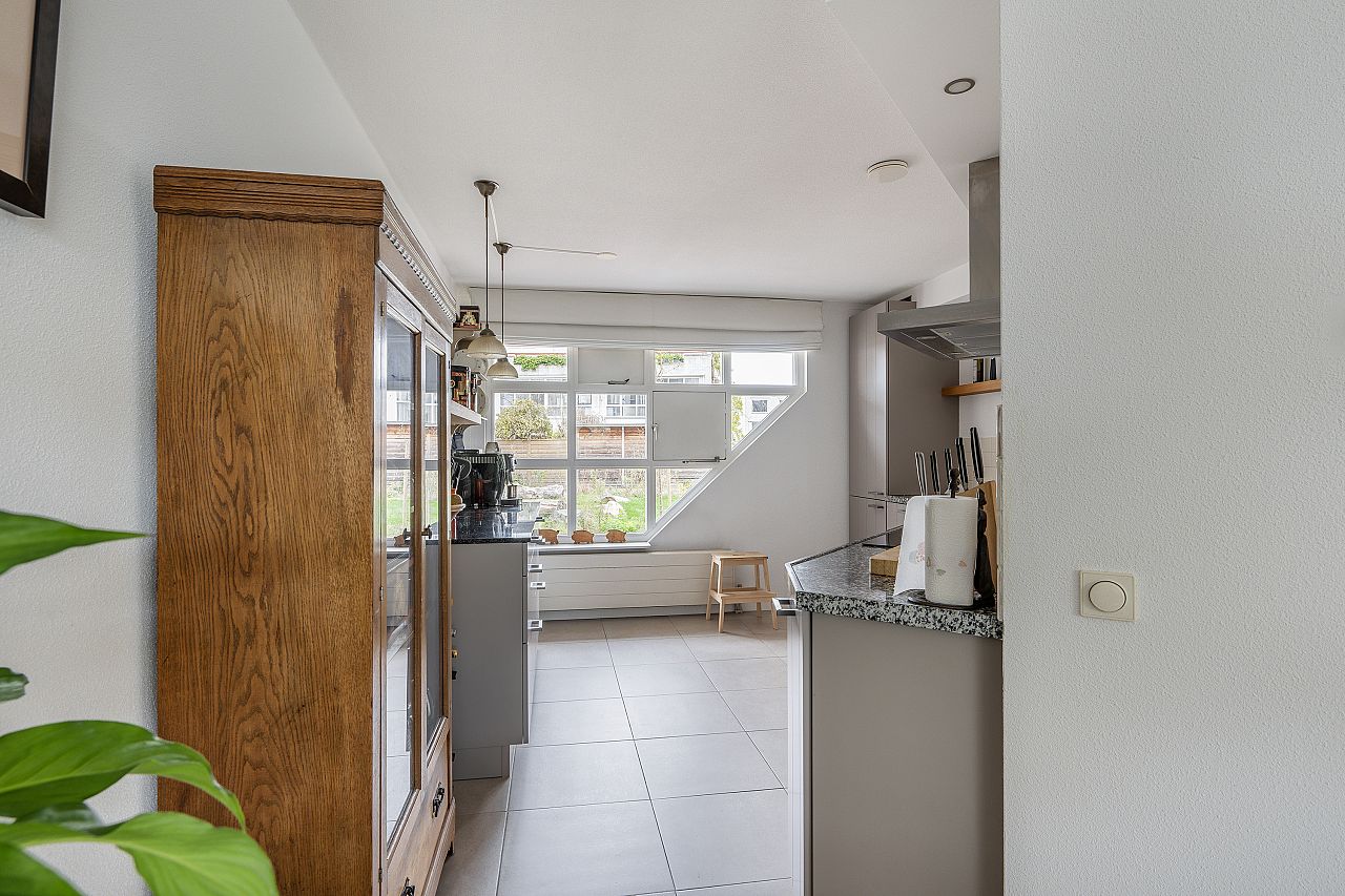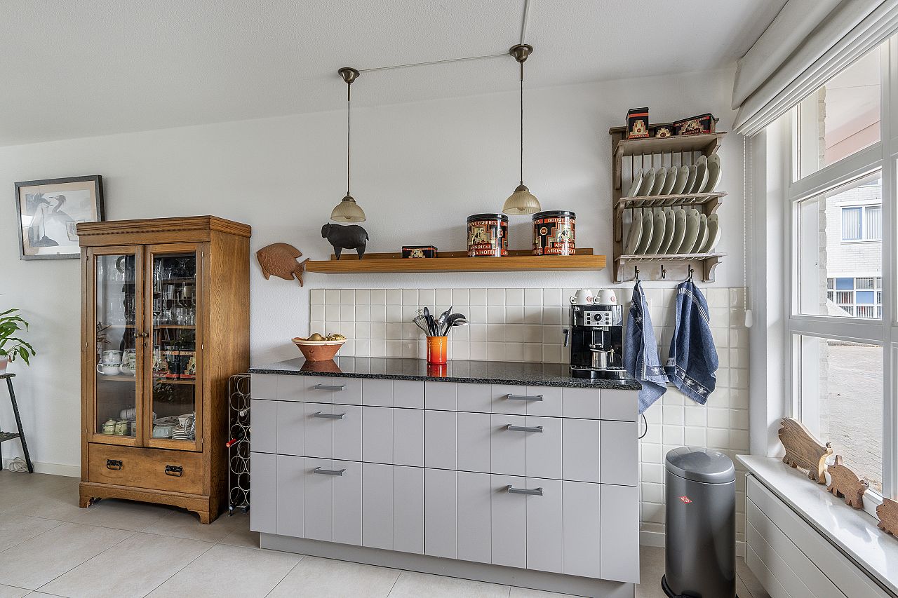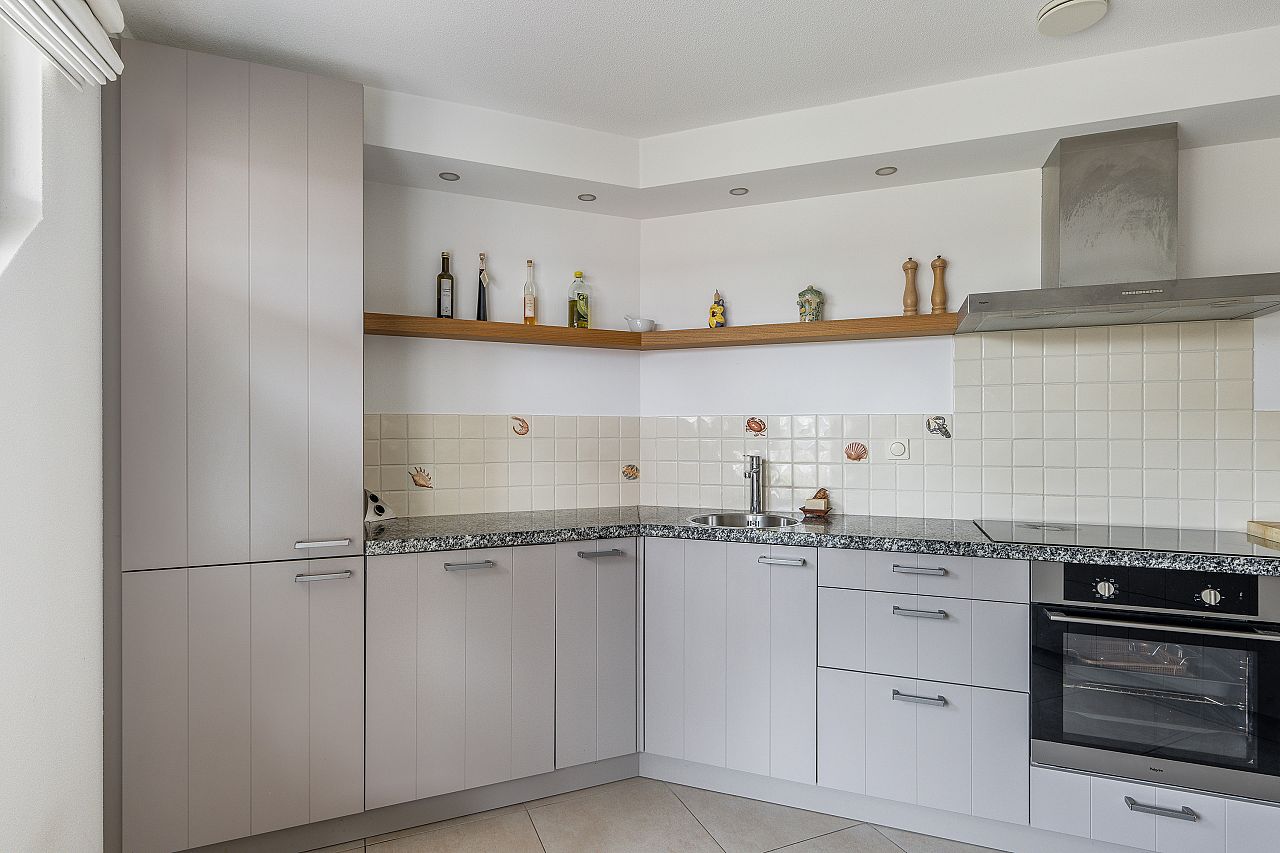 Aan de voorzijde is de keuken gelegen. De keuken heeft leemkleurige fronten en een granieten werkblad. De keuken is uitgerust met een hete lucht-oven, inductiekookplaat, afzuigkap, apothekerskast, vaatwasser, koelkast en vriezer.
