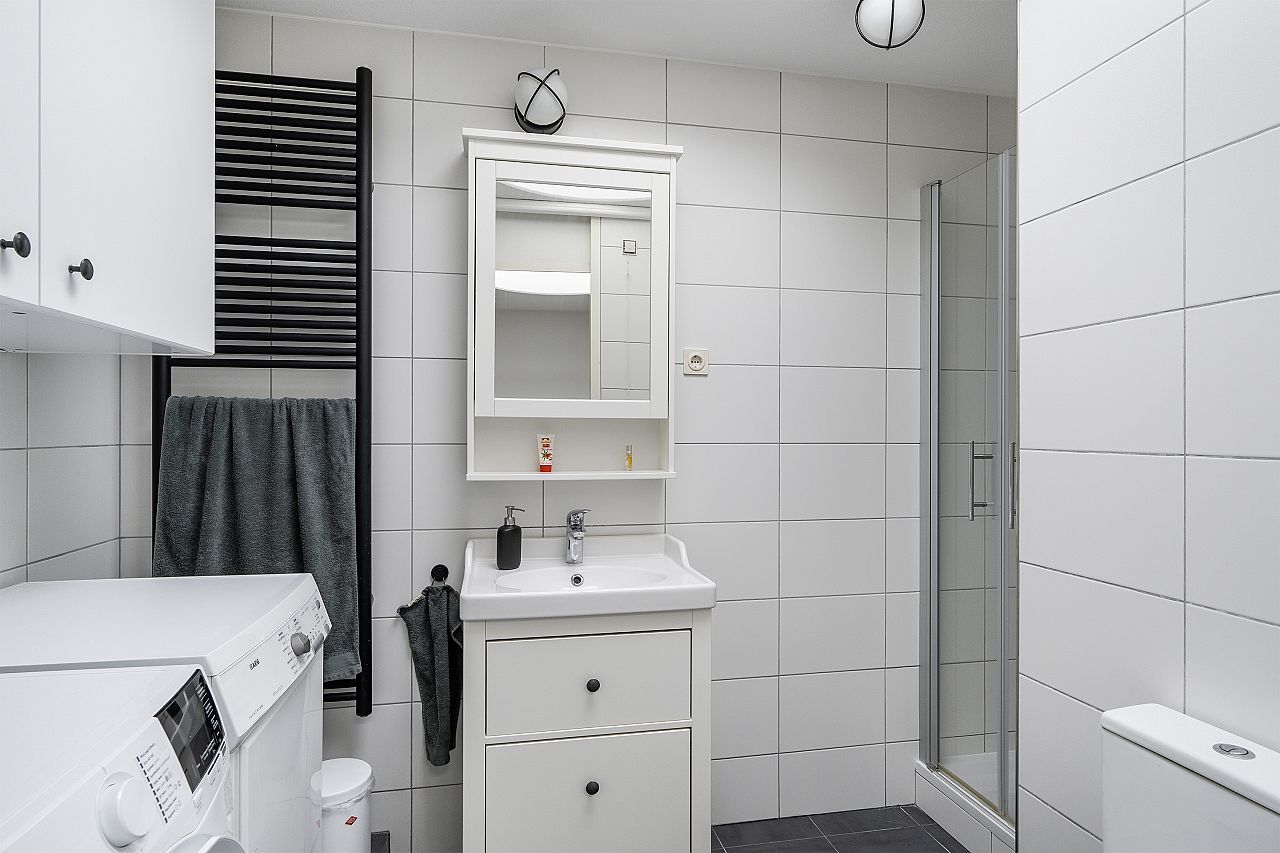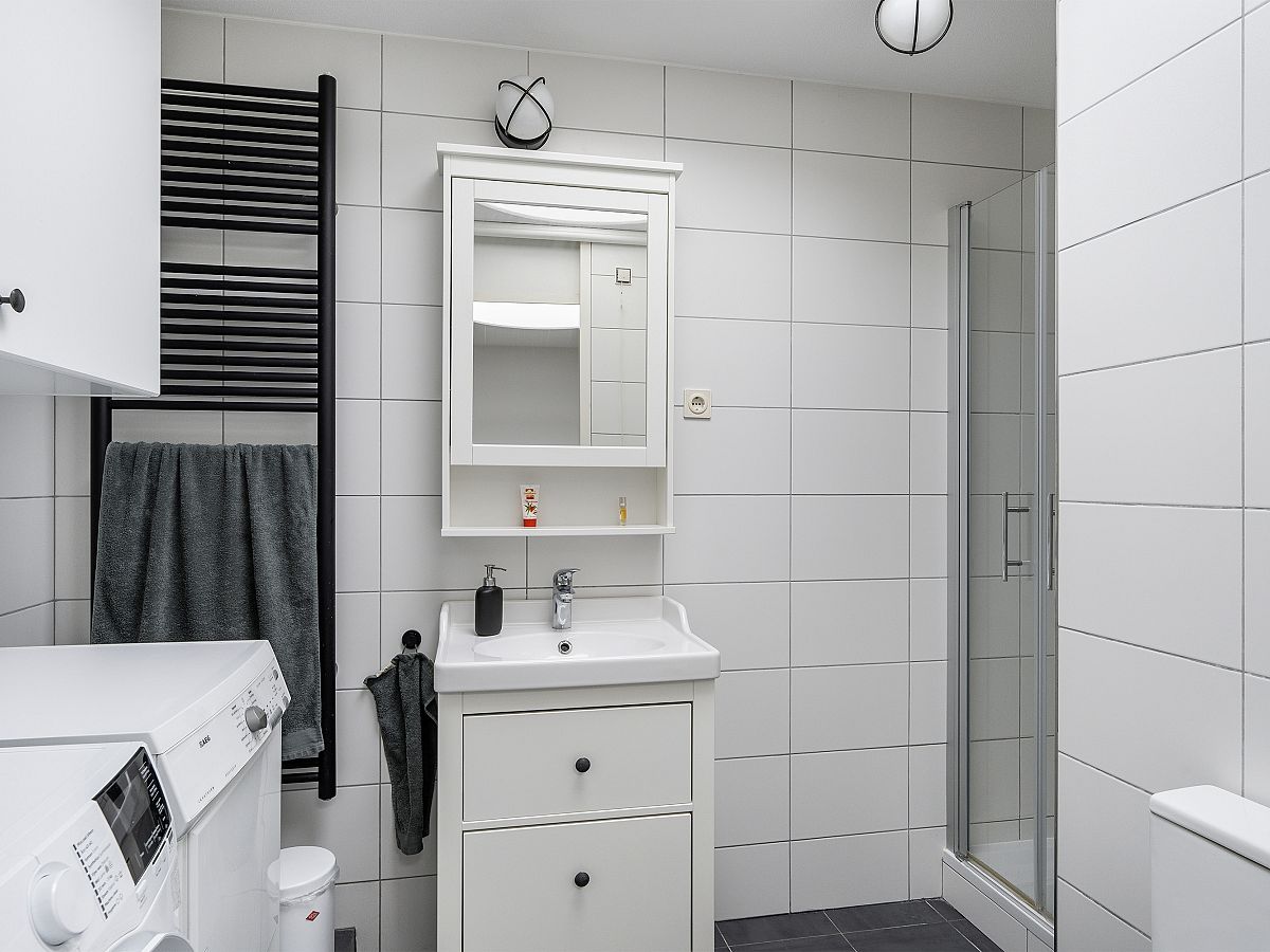 De ruime badkamer heeft een tweede toilet, wastafelmeubel, douche en plek om de wasmachine en droger neer te zetten. Wil je graag een ligbad? De aansluitingen zijn nog aanwezig!