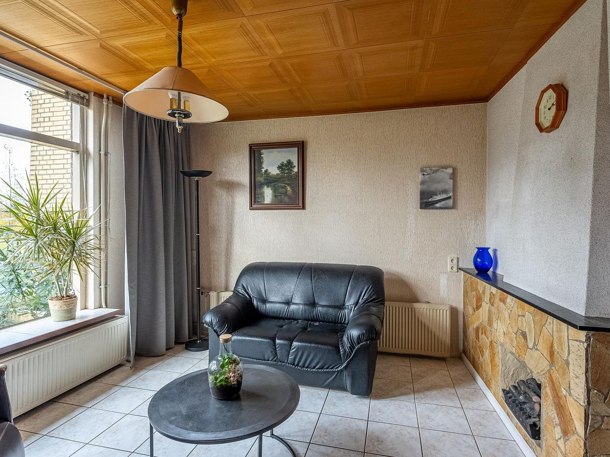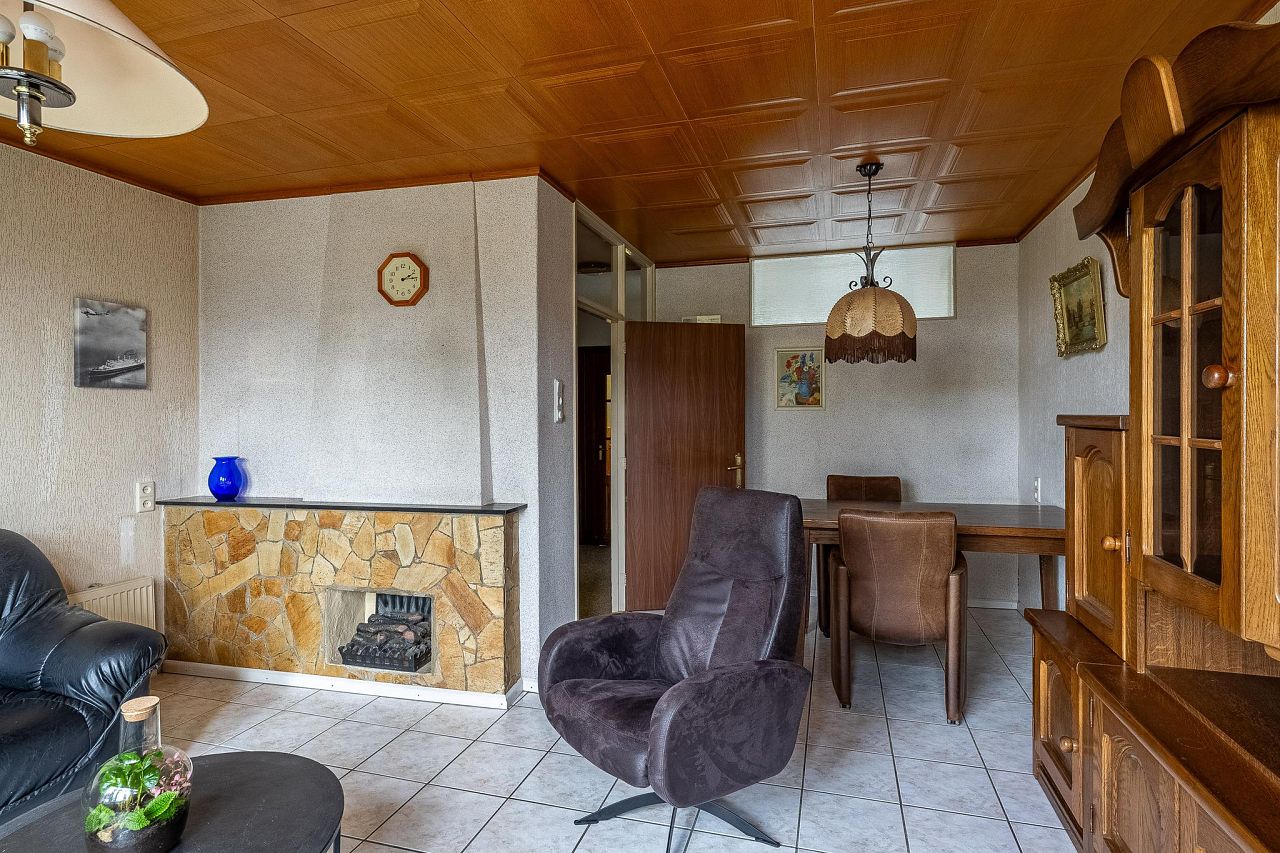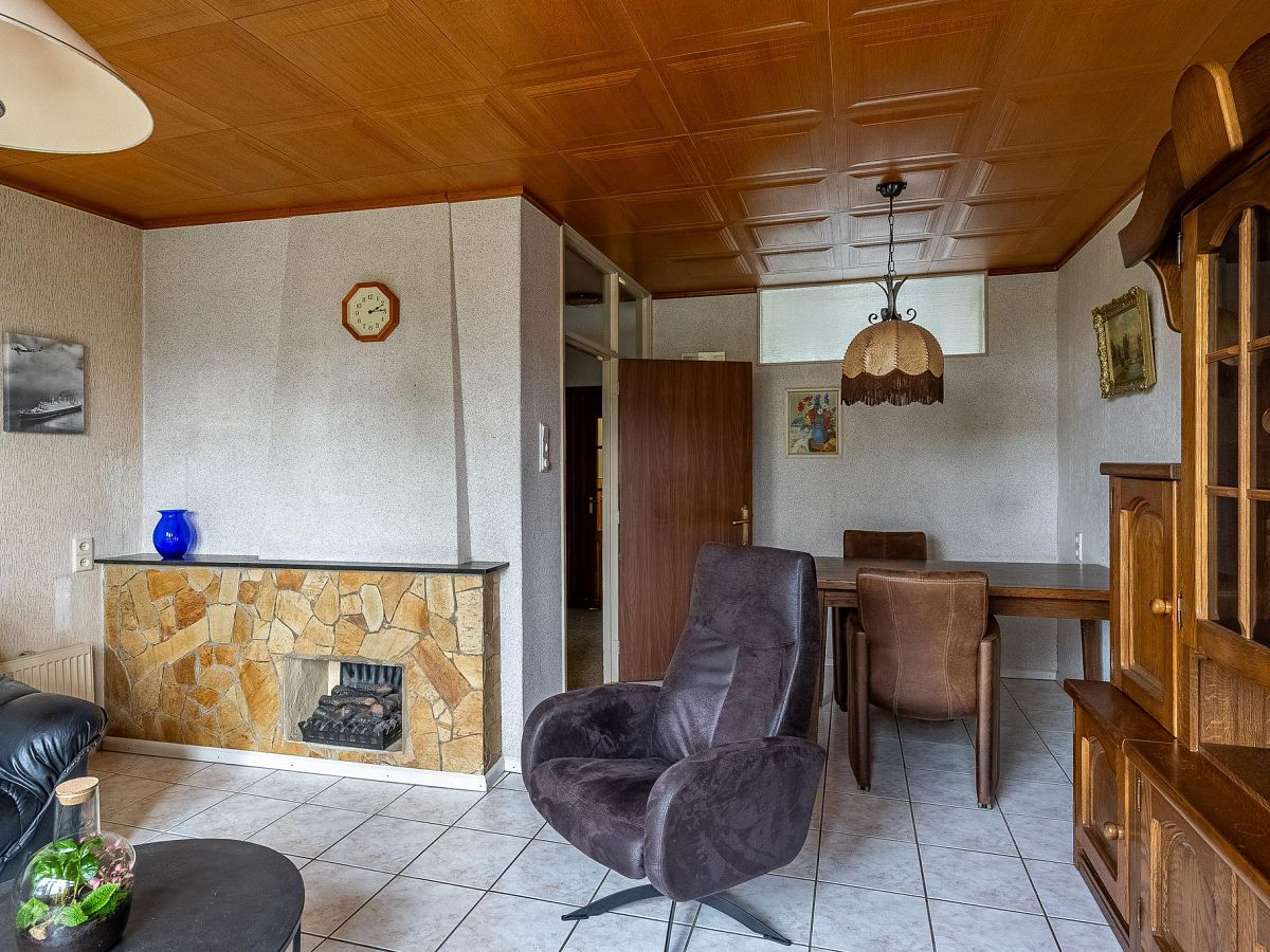 Woonkamer voorzien van plavuizenvloer, elektrische haard met schouw en zonnig balkon uitkijkend over groenpartij. Deze verdieping is voorzien van vloerverwarming op de hal na.