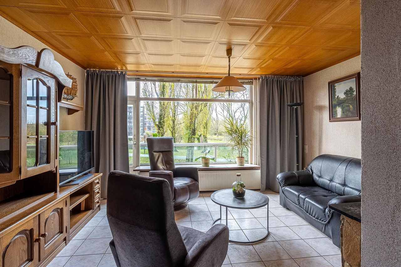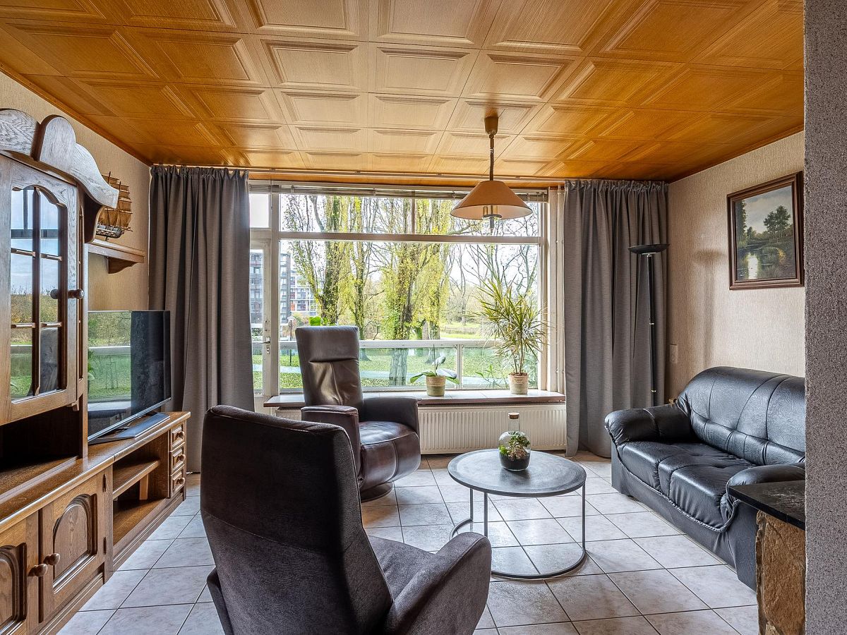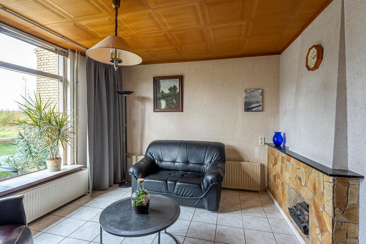 Woonkamer voorzien van plavuizenvloer, elektrische haard met schouw en zonnig balkon uitkijkend over groenpartij. Deze verdieping is voorzien van vloerverwarming op de hal na.