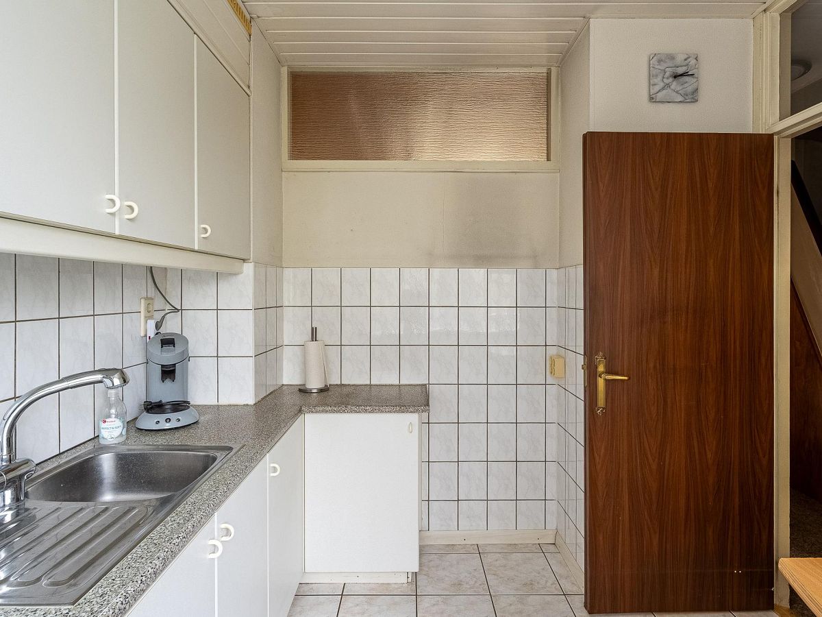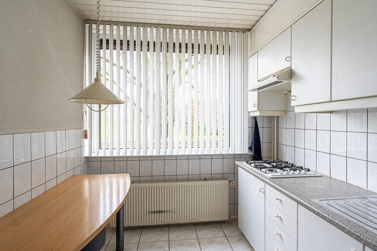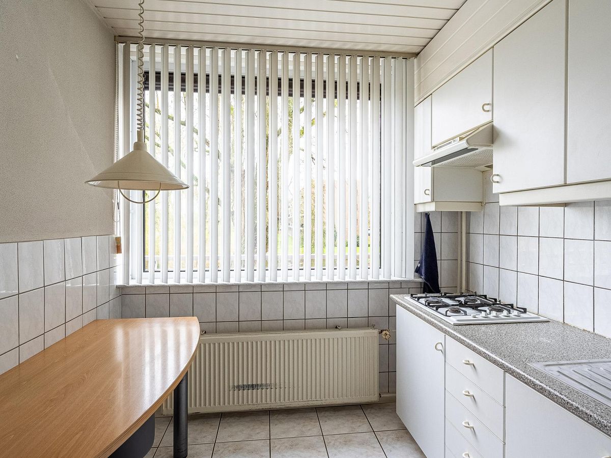 Dichte keuken met witte frontinrichting, gaskookplaat, close-in-boiler en afzuigkap. De keuken is voorzien van kunststof kozijnen en dubbel glas; meterkast omvat 4 groepen en aardlekschakelaar.