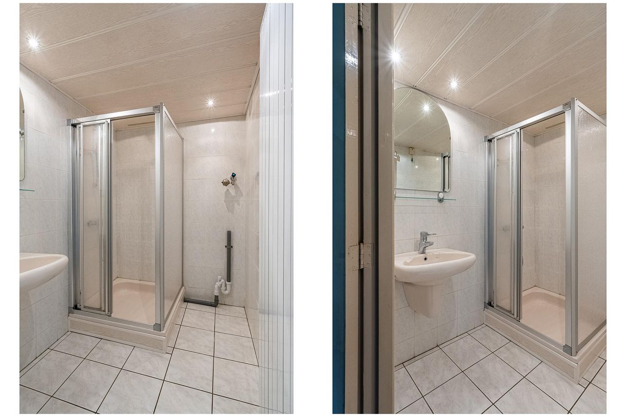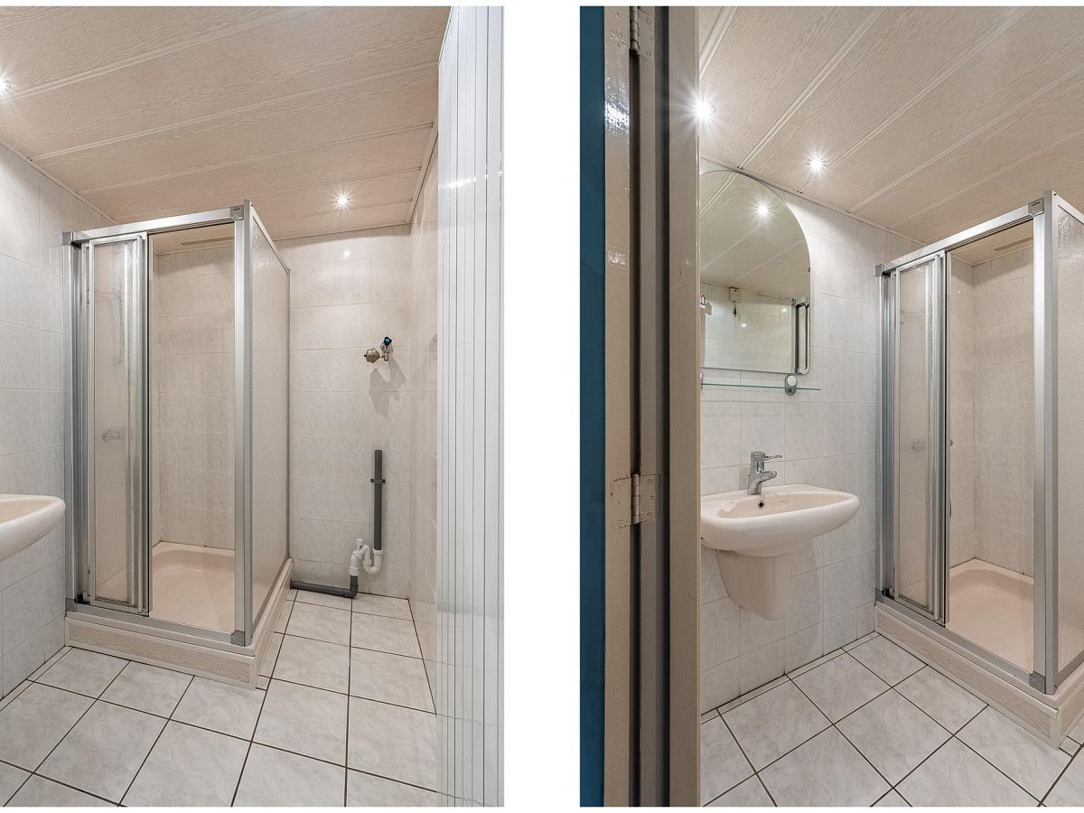 De badkamer is wit betegeld en voorzien van douchehoek, wastafel en vloerverwarming.