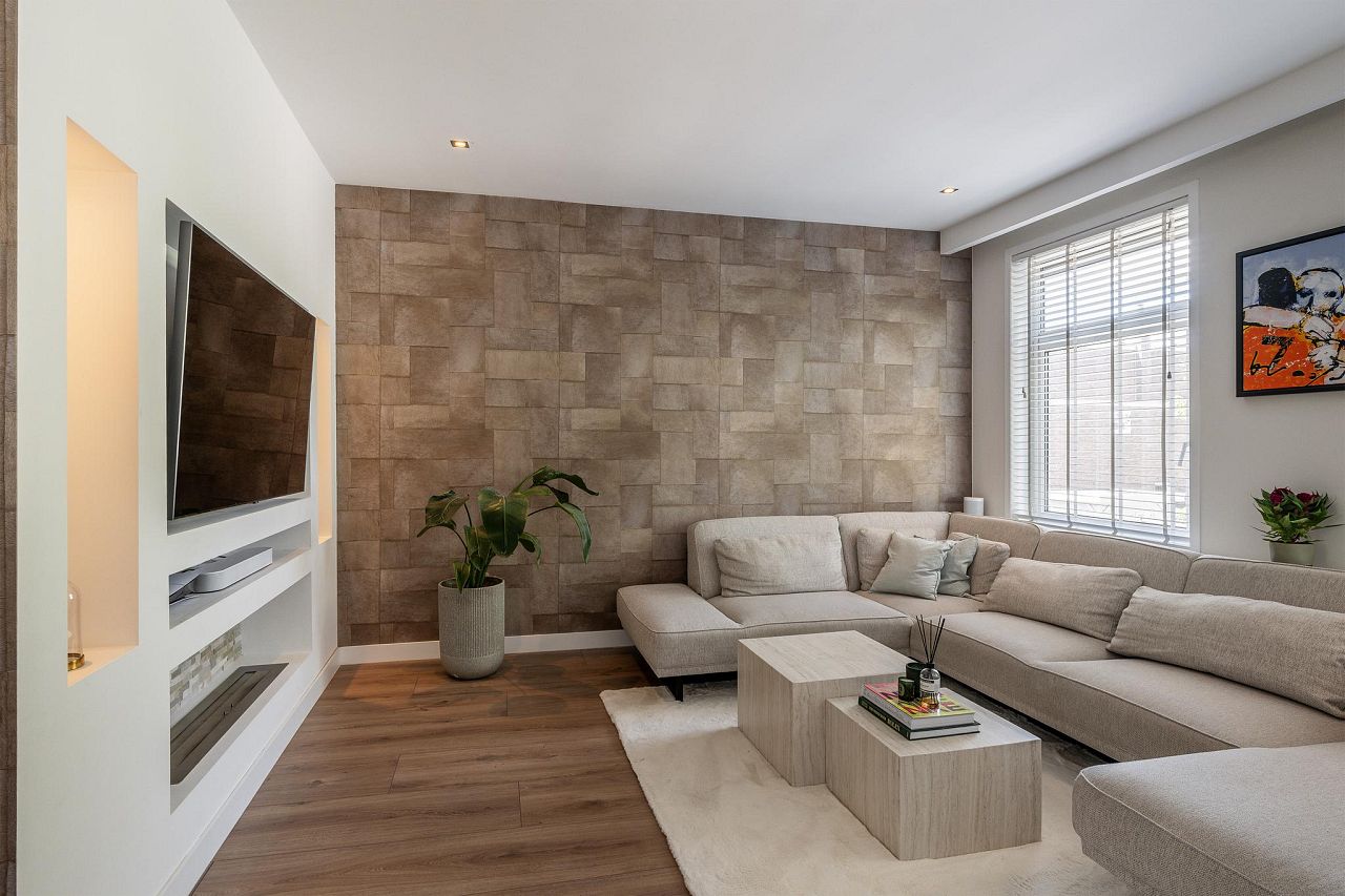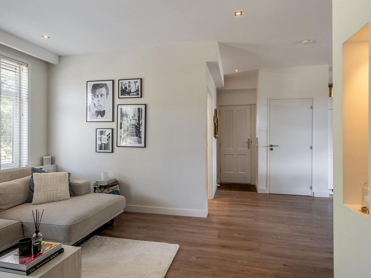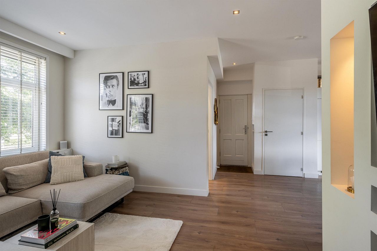 Entree. Ruime, lichte woonkamer met vaste garderobekast, airconditioning, open keuken en deur naar het balkon. De woonkamer is afgewerkt met een fraaie brede laminaatvloer en strakke gestucte wanden voorzien van wandbekleding en strak gestucte plafonds met inbouw spots.