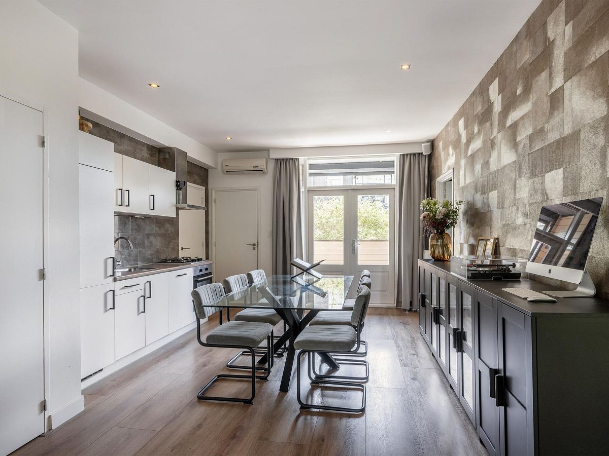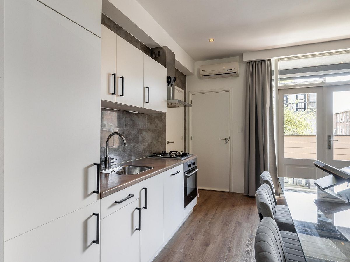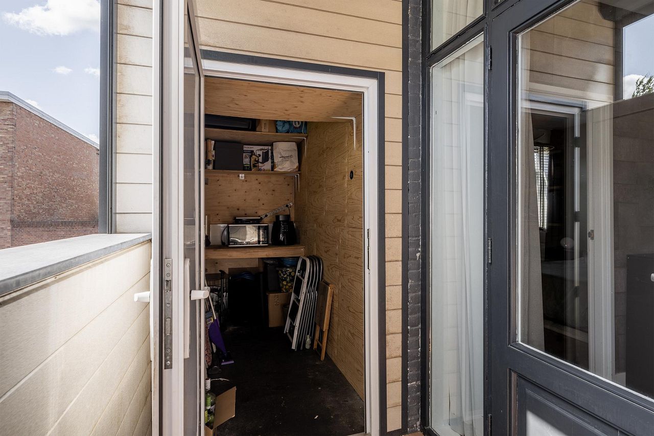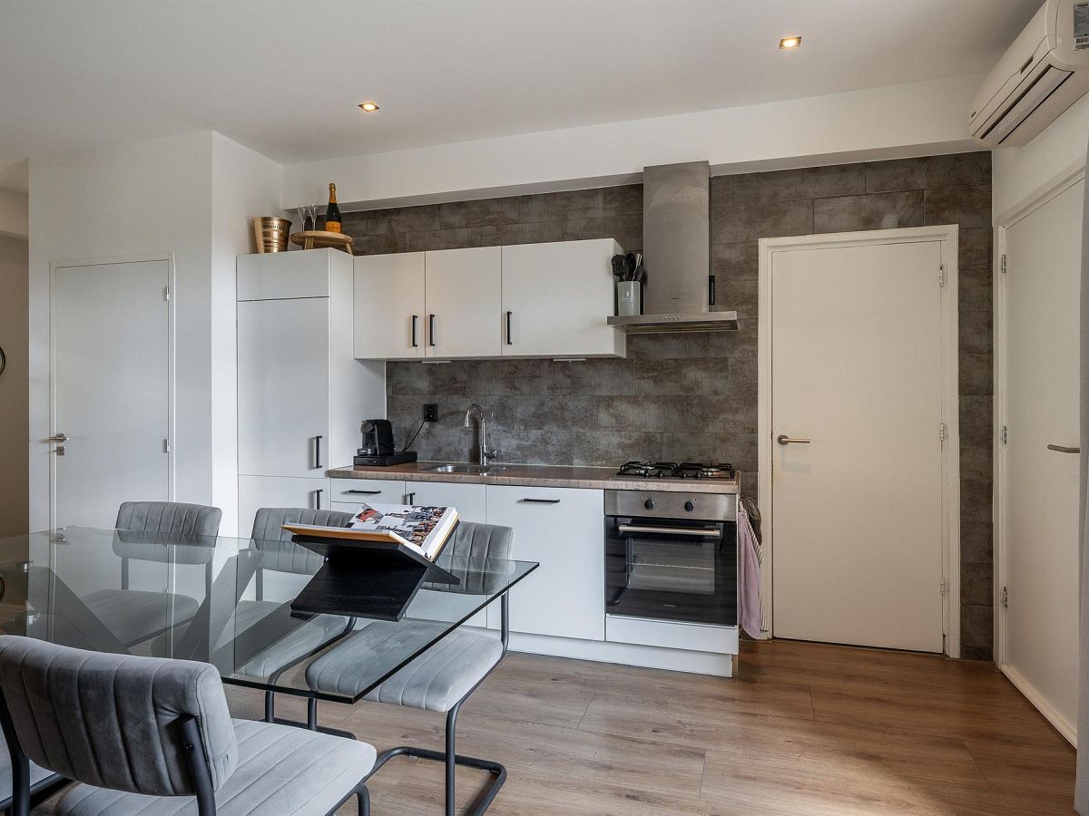 Vanuit de woonkamer zijn de diverse vertrekken toegankelijk. De open keuken bestaat uit een wandkeukenblok en is voorzien van een koel/vriescombinatie, vaatwasser, 4-pits gasfornuis, afzuigkap en een oven. Aan de achterzijde van de woning is het balkon gelegen. Het balkon heeft een elektrisch rolluik en een ruime inpandige berging.