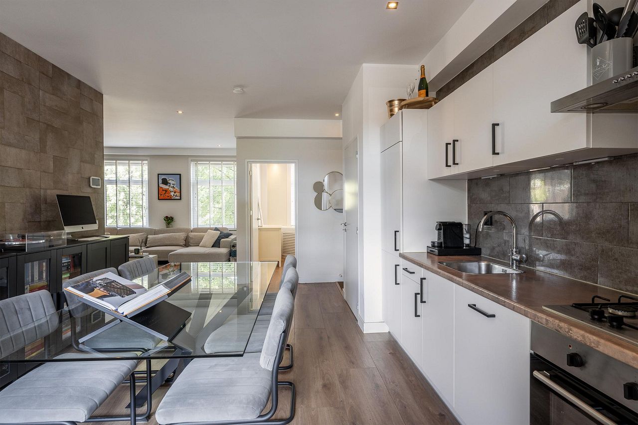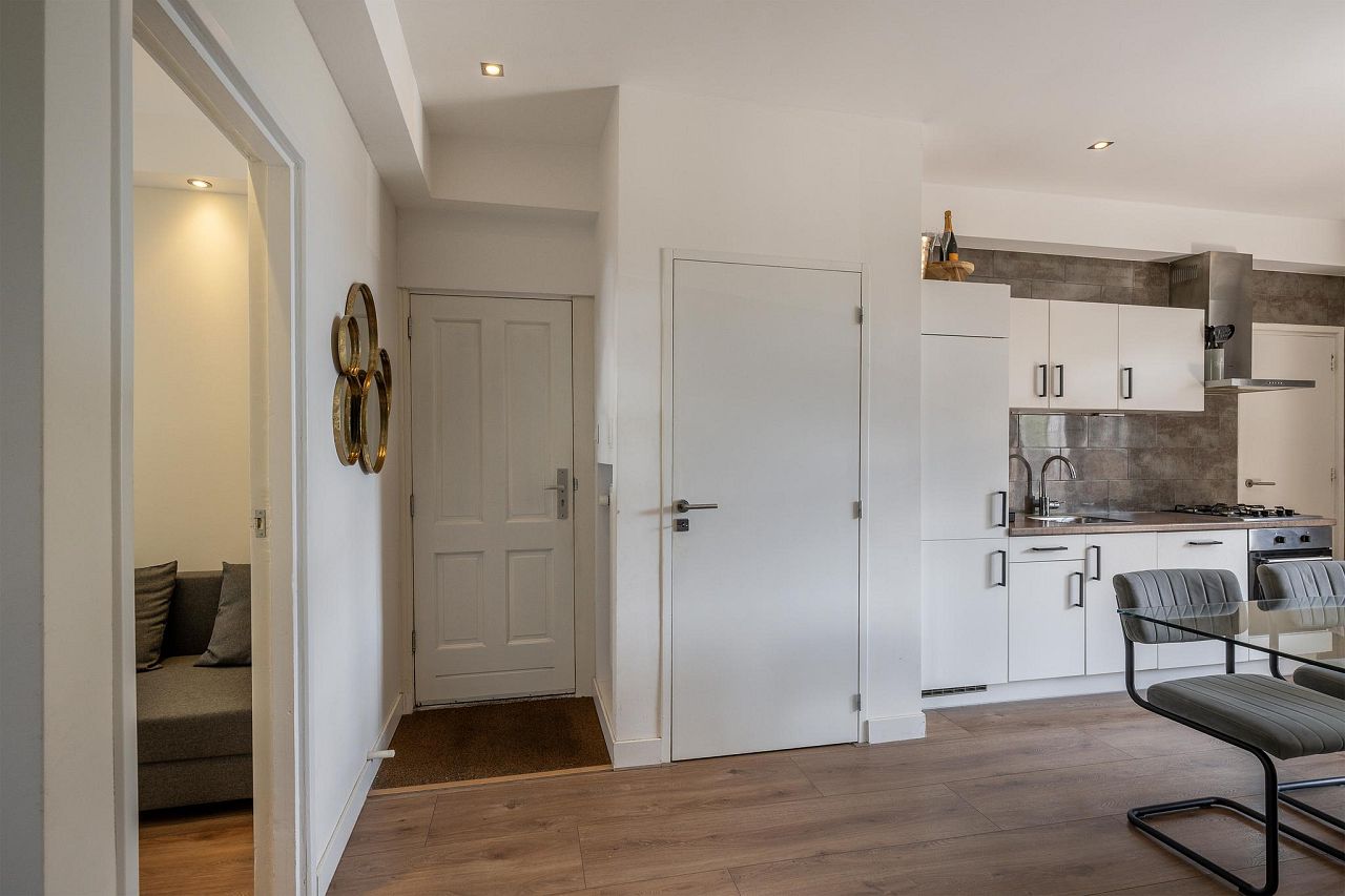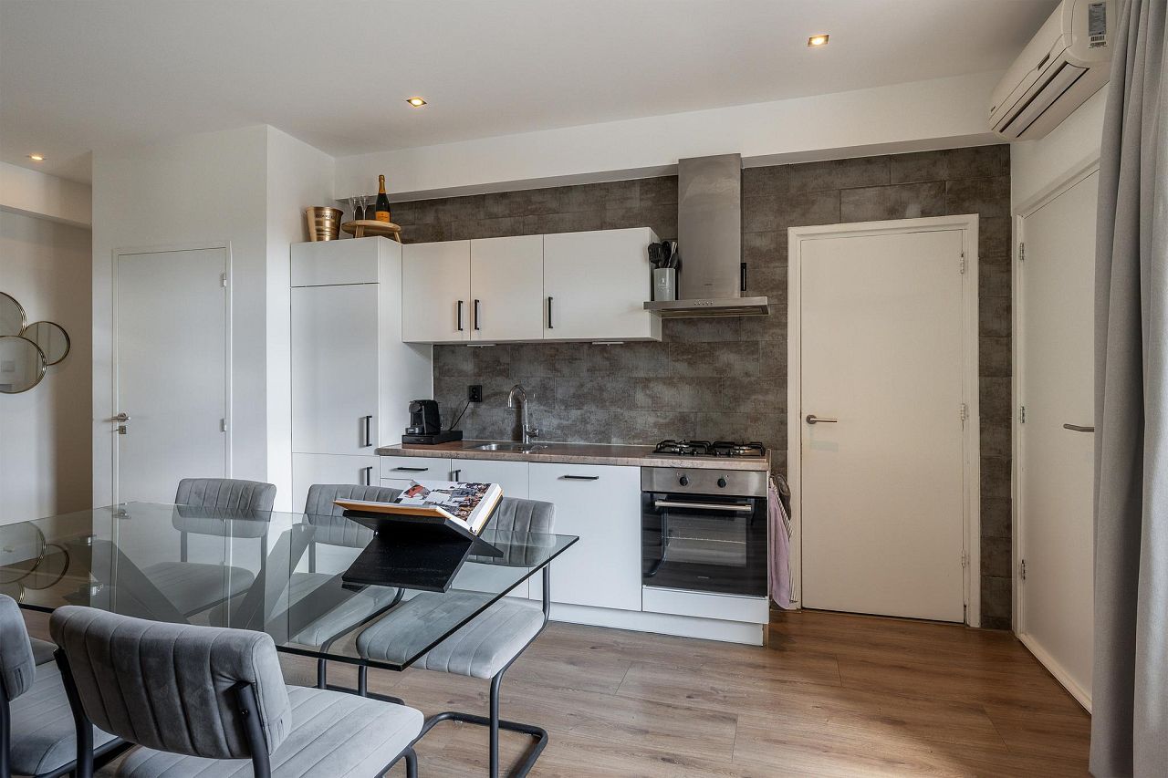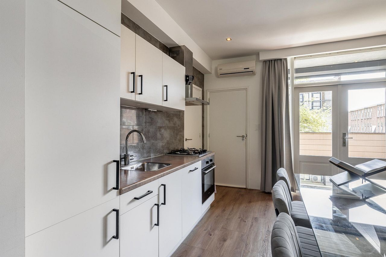 Vanuit de woonkamer zijn de diverse vertrekken toegankelijk. De open keuken bestaat uit een wandkeukenblok en is voorzien van een koel/vriescombinatie, vaatwasser, 4-pits gasfornuis, afzuigkap en een oven. Aan de achterzijde van de woning is het balkon gelegen. Het balkon heeft een elektrisch rolluik en een ruime inpandige berging.