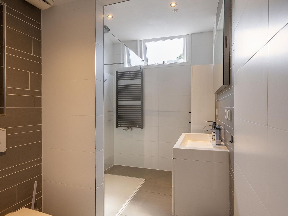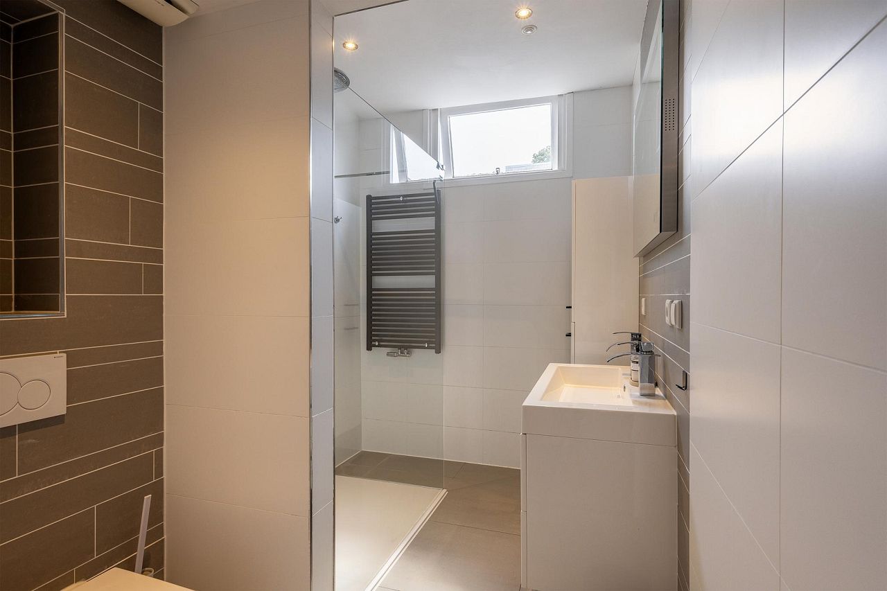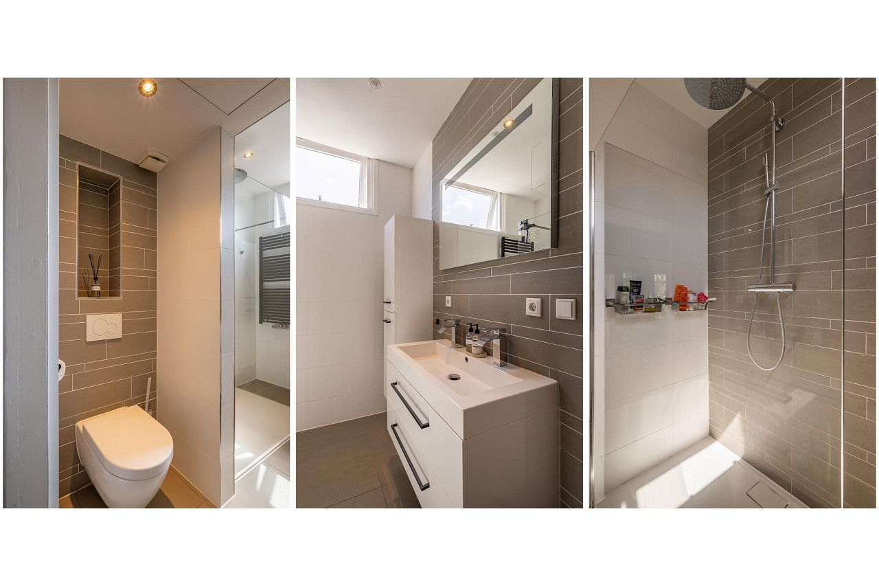 De luxe badkamer beschikt over een strakke vloer- en wandbetegeling, toilet, inloopdouche met regendouchekop en losse handdouche, dubbele wastafel, strak gestuct plafond met inbouwspotjes en mechanische ventilatie.