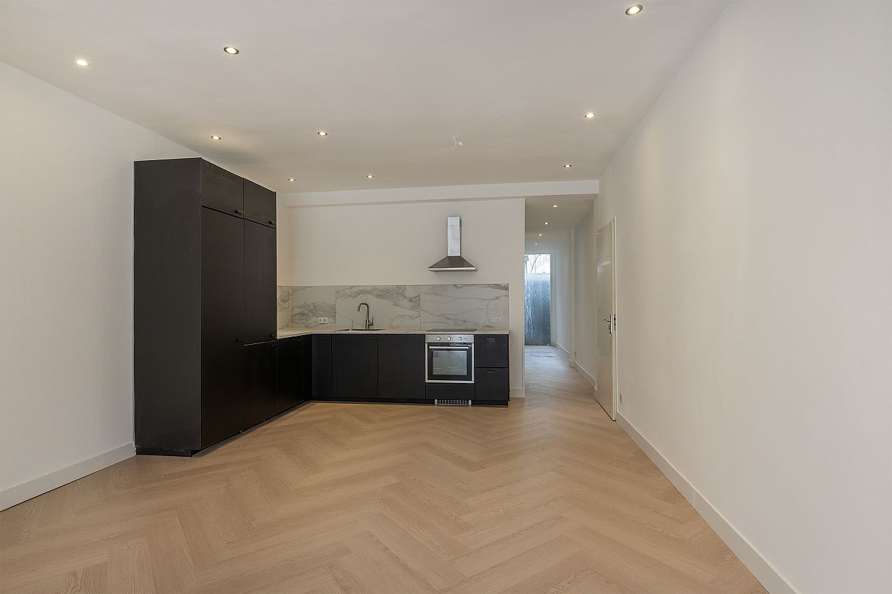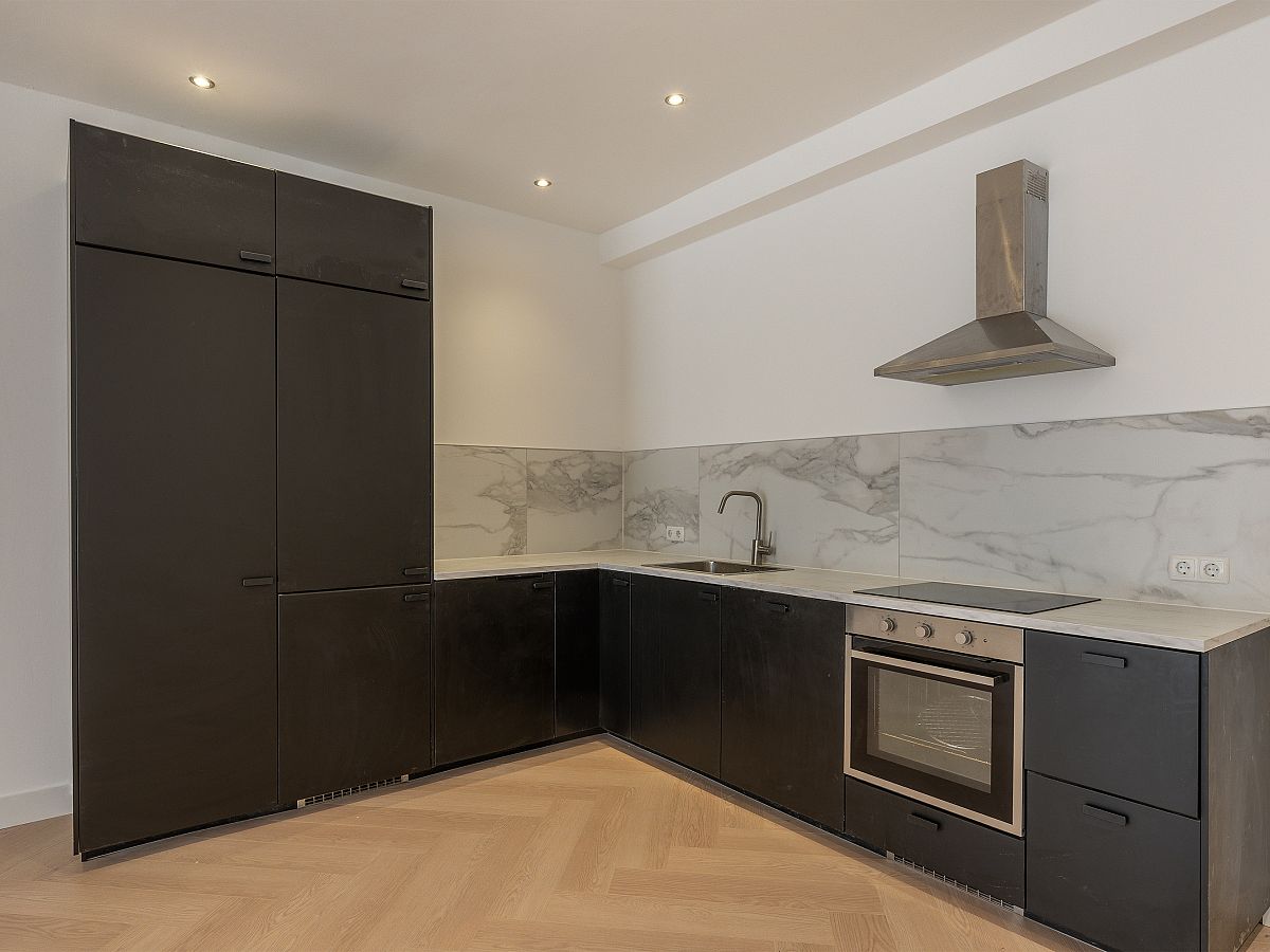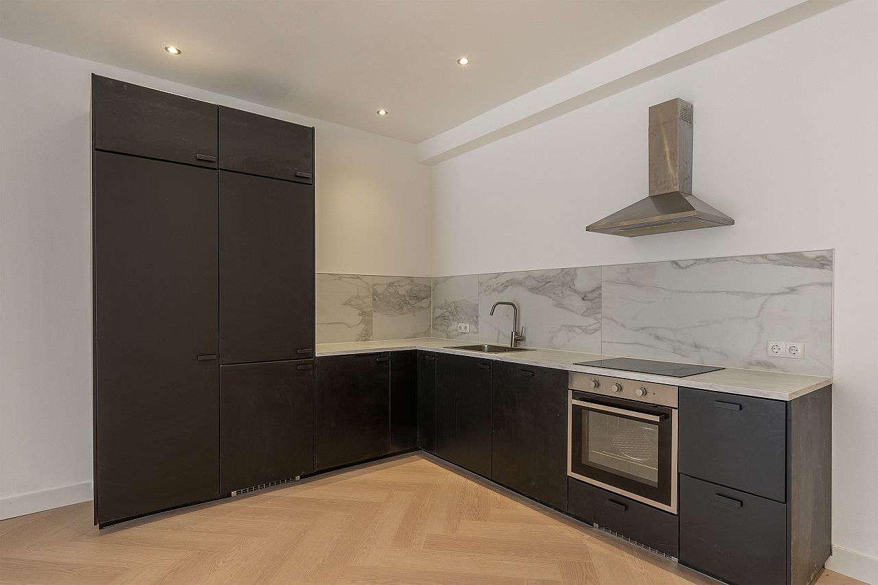 Ruime woonkamer met open keuken in hoekopstelling. De keukenkastjes zijn voorzien van zwarte fronten en er ligt een marmerlook werkblad met voldoende werkruimte.