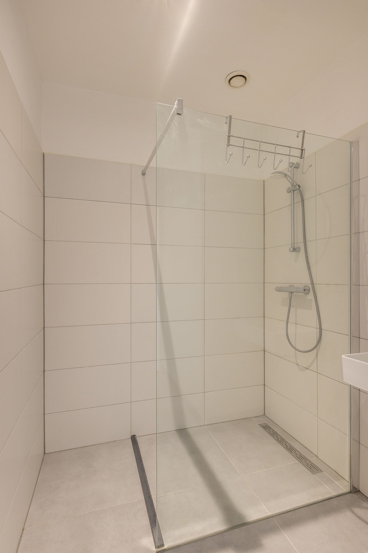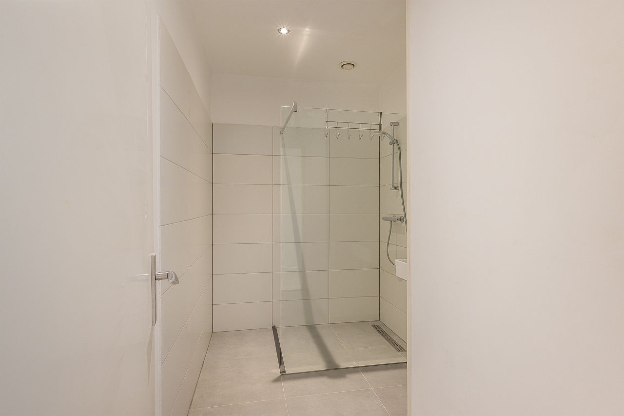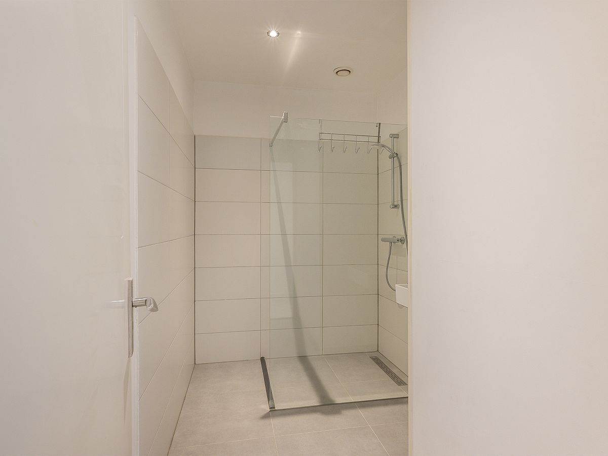 De ruime badkamer heeft een inloopdouche en wastafel.