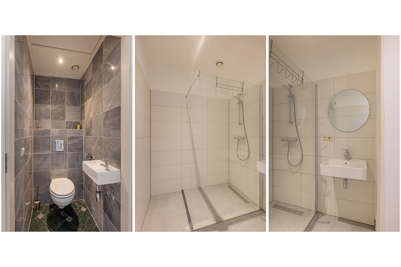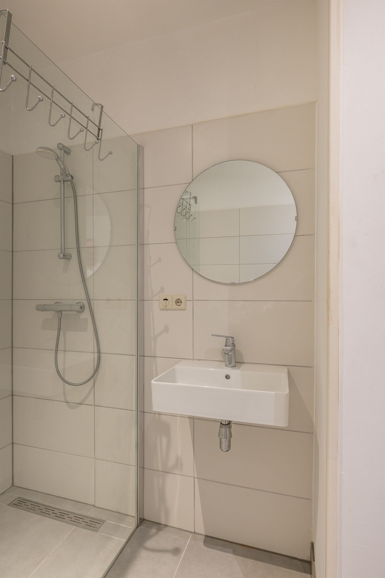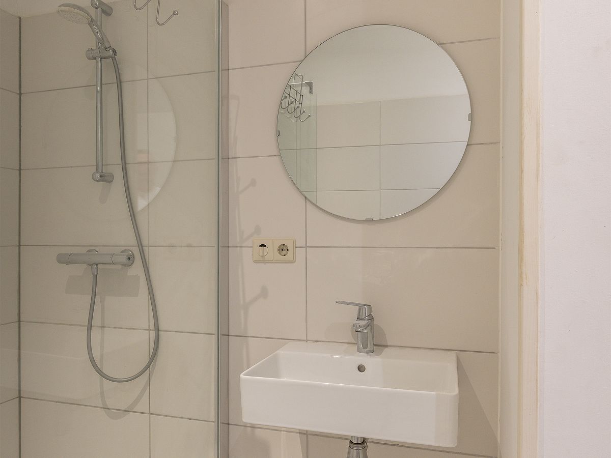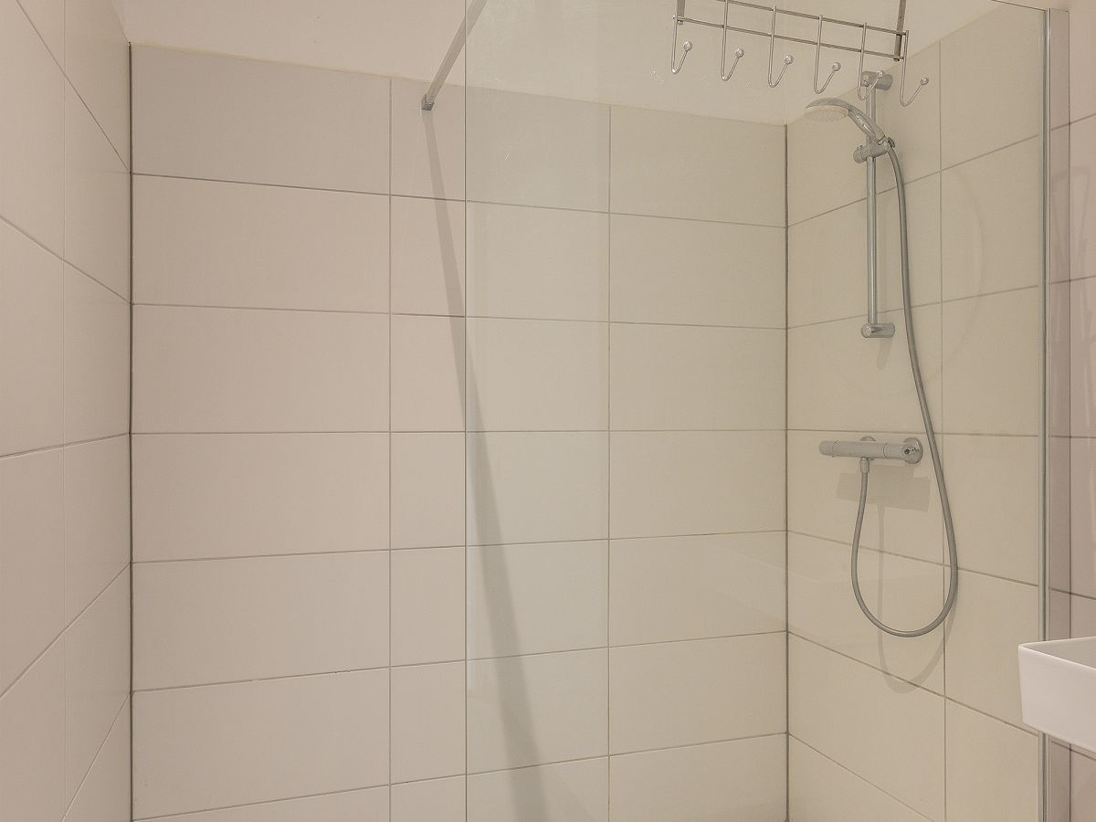 De ruime badkamer heeft een inloopdouche en wastafel.