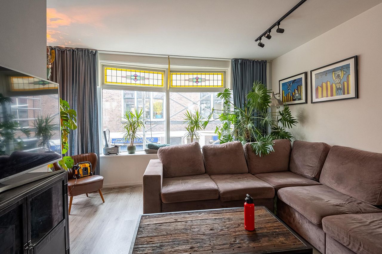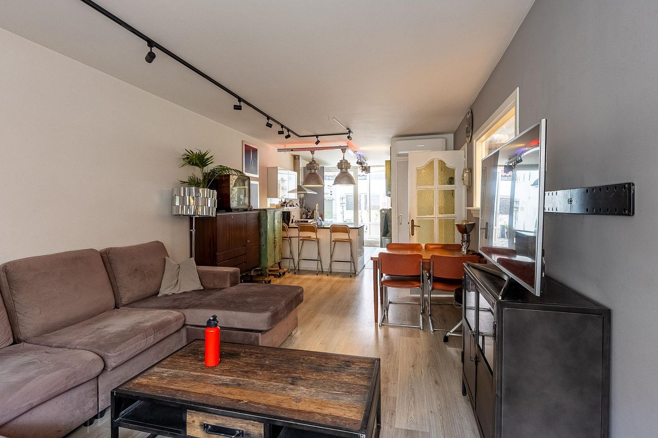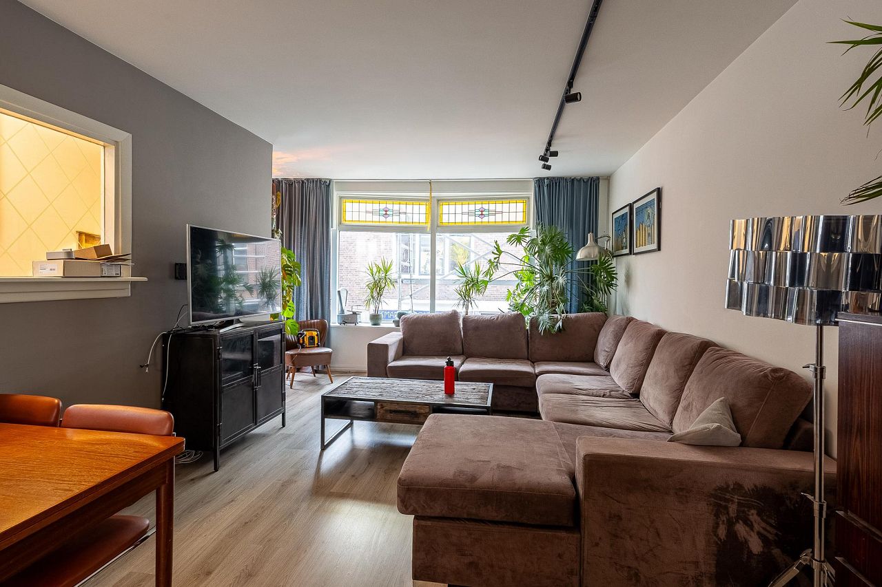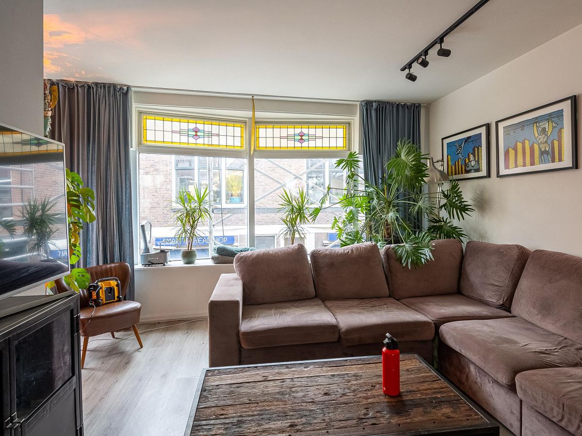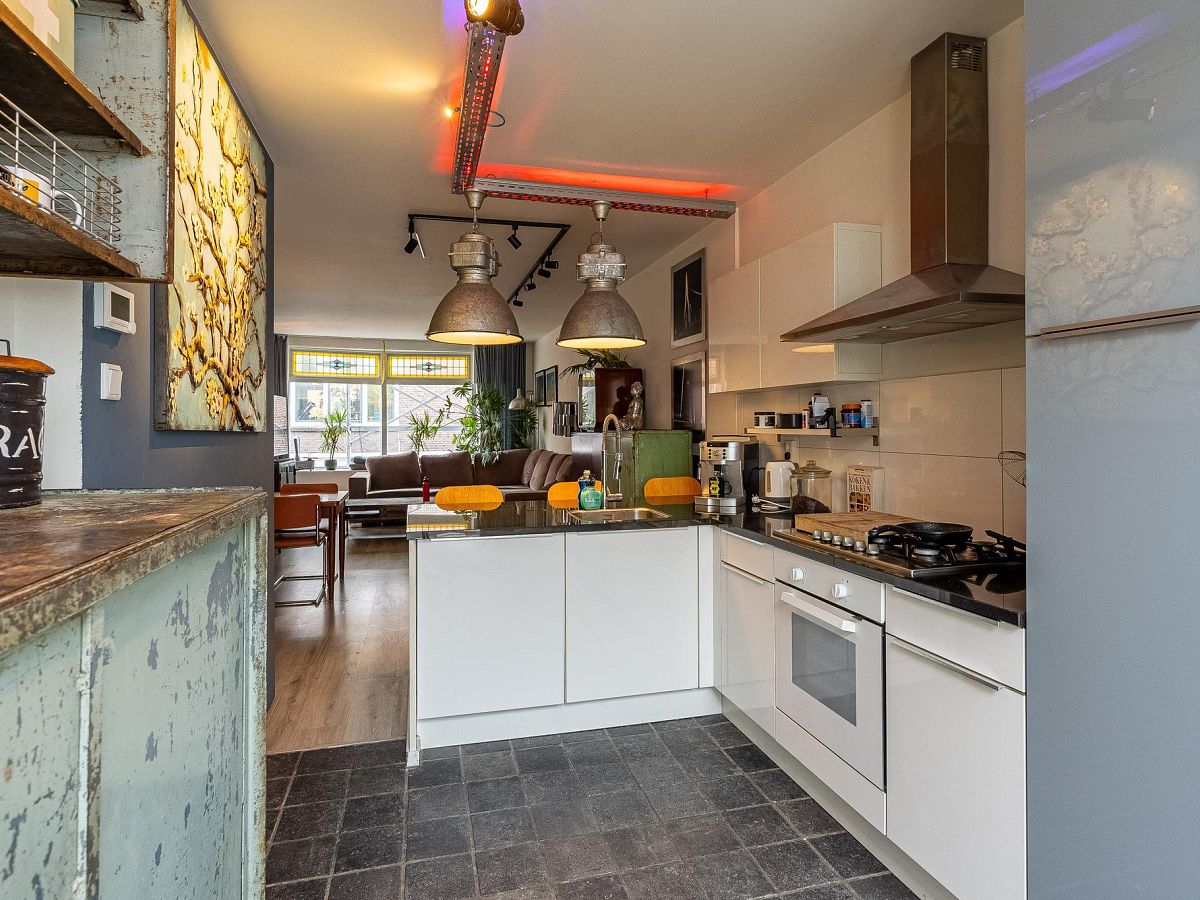 Woonkamer met trapkast, laminaatvloer, erker met glas-in-lood (dubbel) ramen; open keuken in een hoekopstelling voorzien van witte frontinrichting en hardsteen zwart aanrechtblad, vaatwasser, 5 pits kookkookplaat, afzuigkap, oven, koelkast, vriezer en getrommeld marmeren achterwand. Kunststof pui naar het achtergelegen dakterras, deze is gelegen op het zuidoosten.