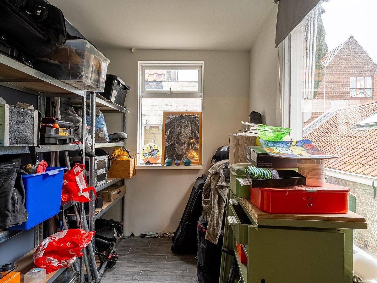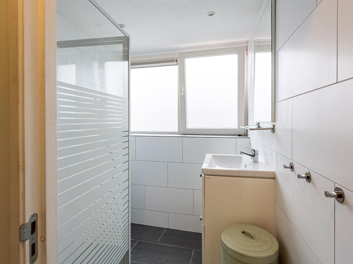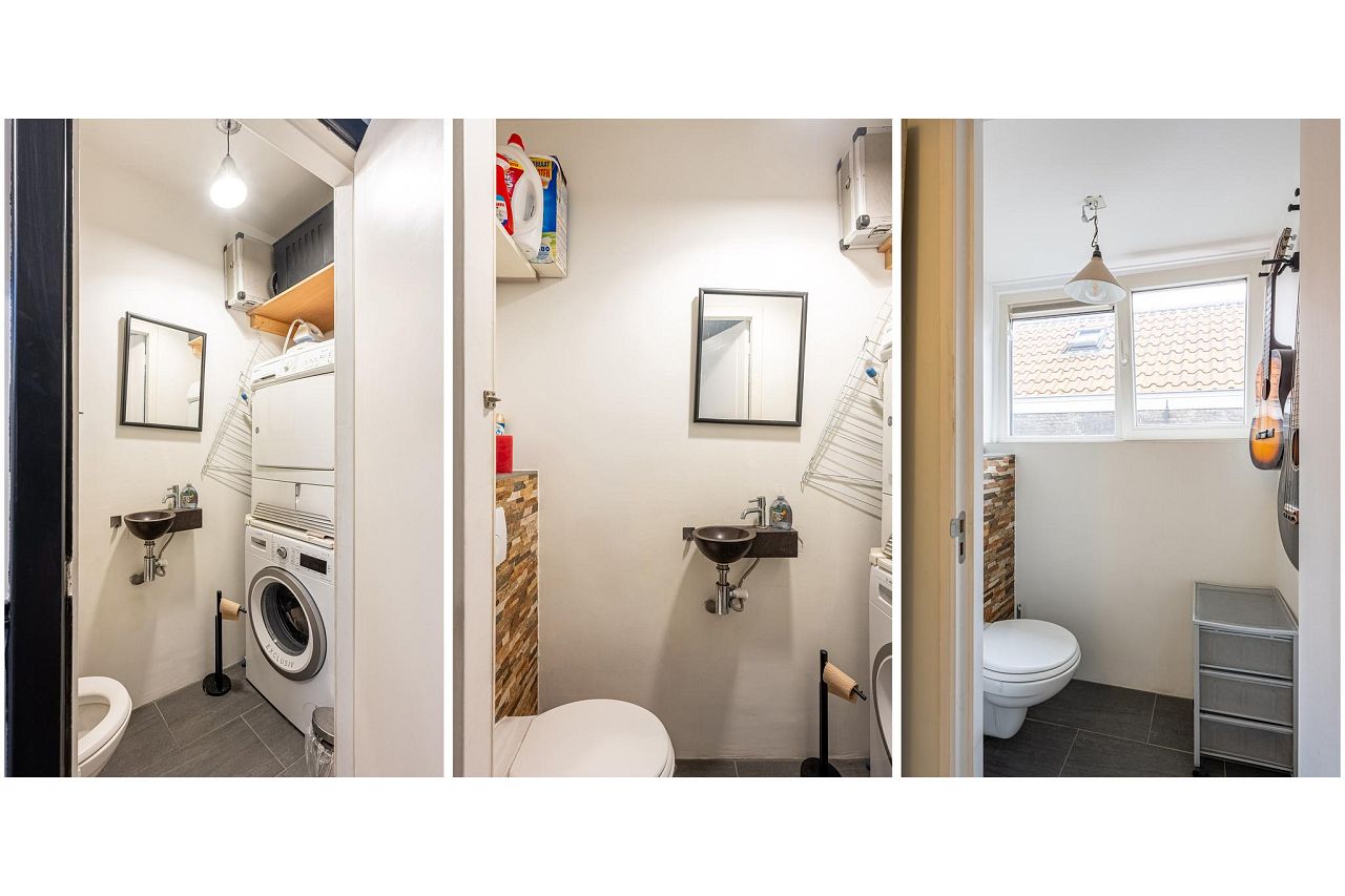 Gang voorzien van terrazzo tegelvloer; ruim toilet met wandclosetcombinatie, wasbakje en tevens de aansluiting voor de wasmachine/droger voorzien van mechanische ventilatie. Achter slaapkamer, welke momenteel in gebruik is als berging en voorzien van hardhouten kozijnen en dubbel glas.