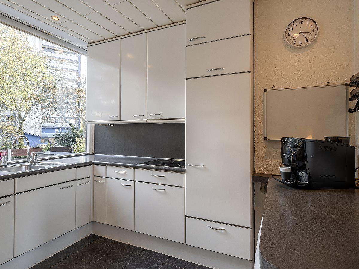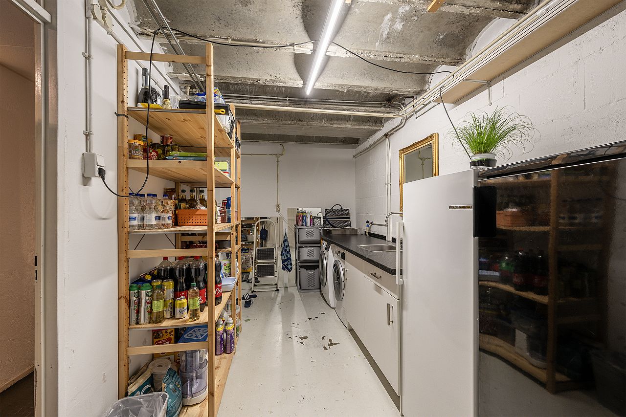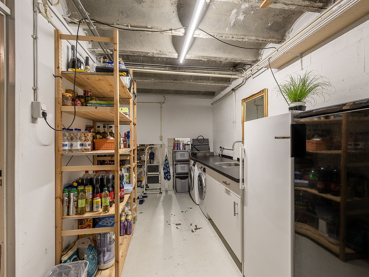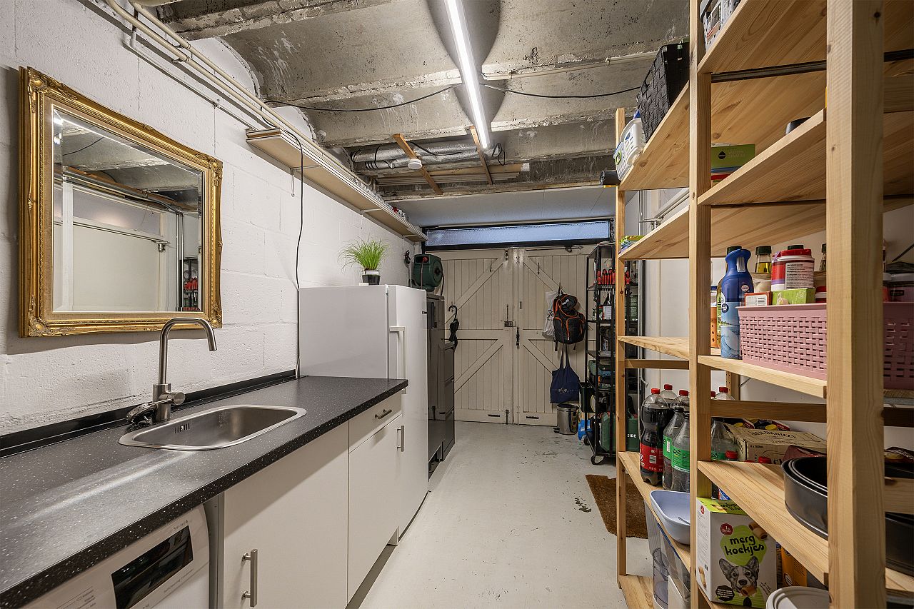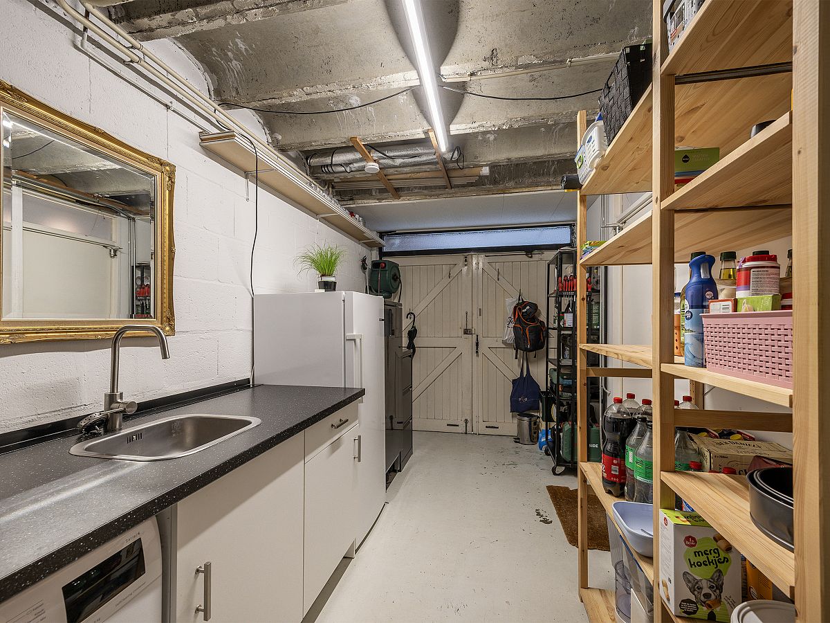Garage met openslaande deuren naar de oprit. In de garage is de aansluiting voor de wasmachine en droger. Bovendien staat hier een extra keukenblok.