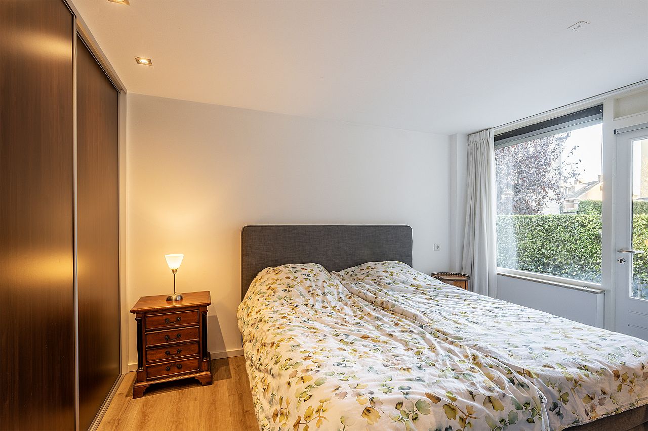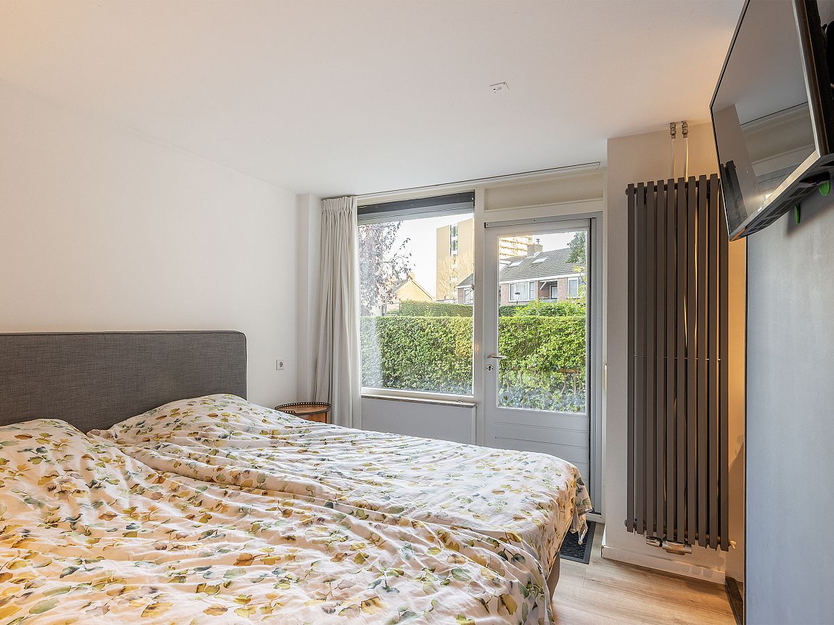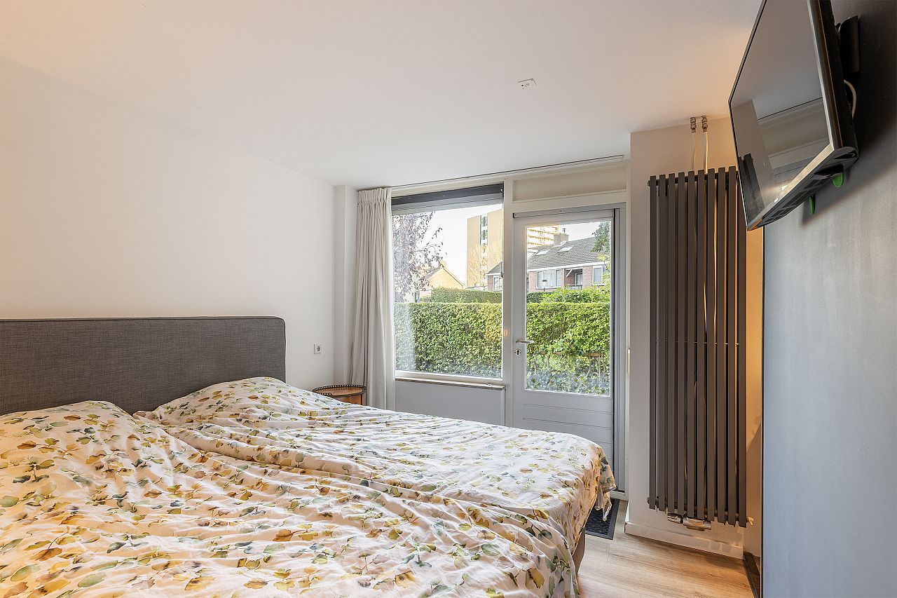 Slaapkamer aan de achterzijde met vaste kast, rolluik en toegang tot de achtertuin.