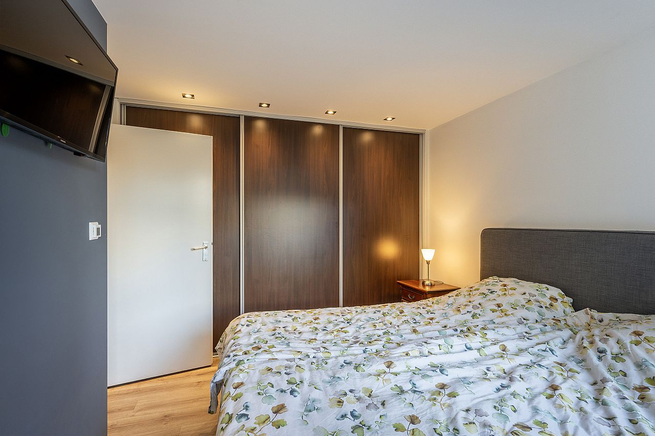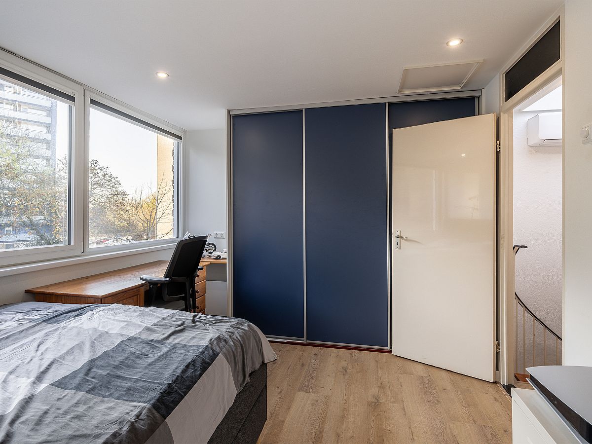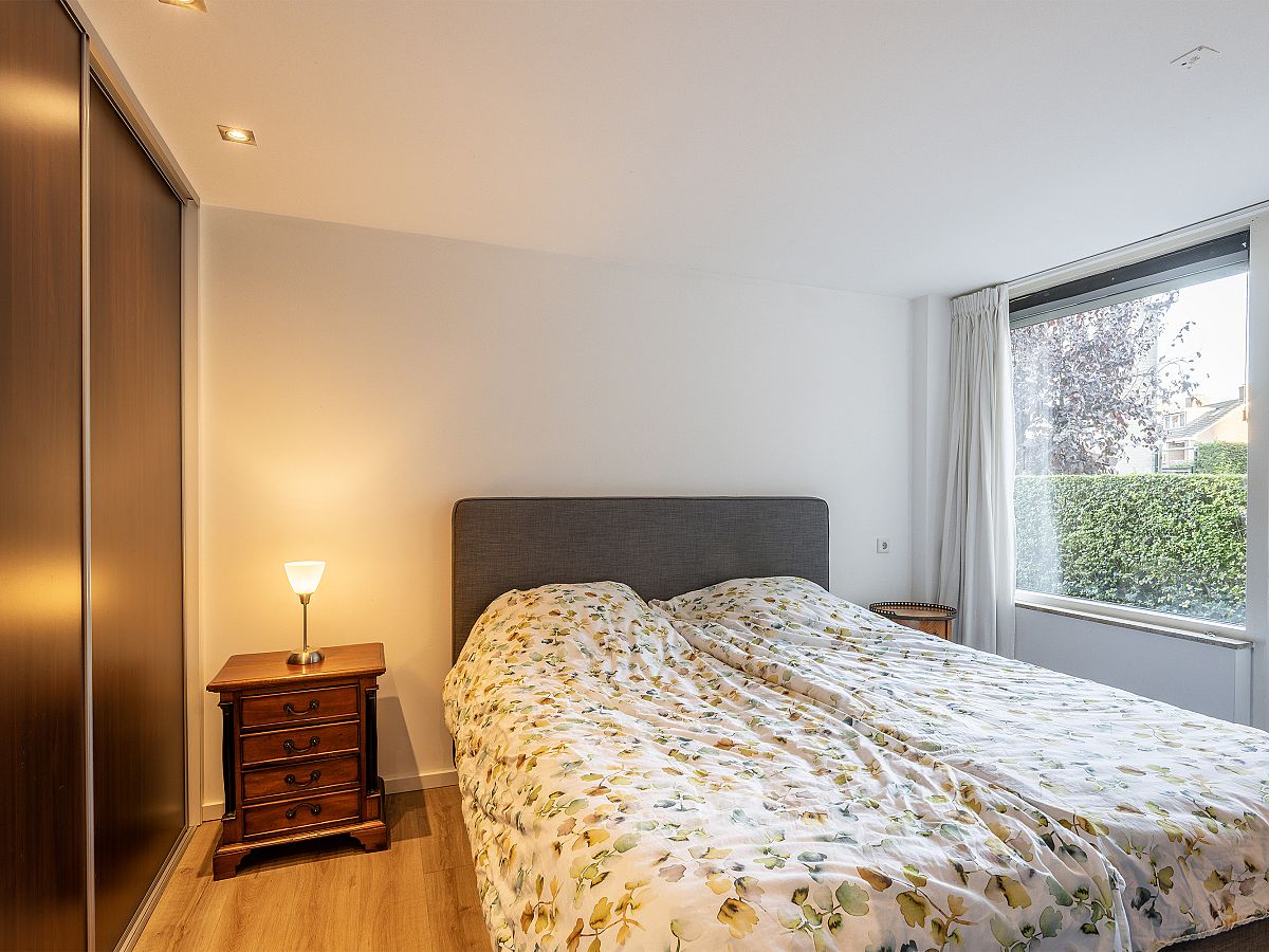 Slaapkamer aan de achterzijde met vaste kast, rolluik en toegang tot de achtertuin.