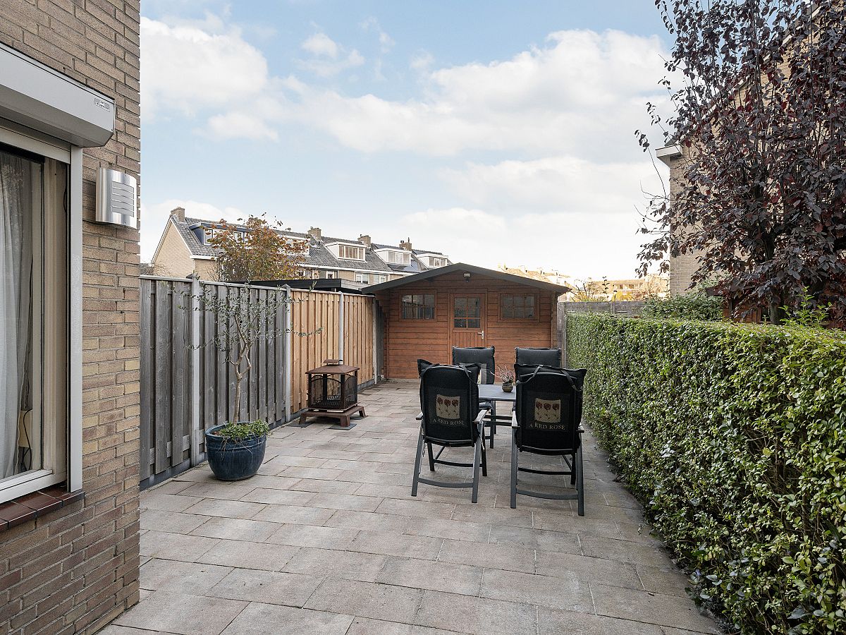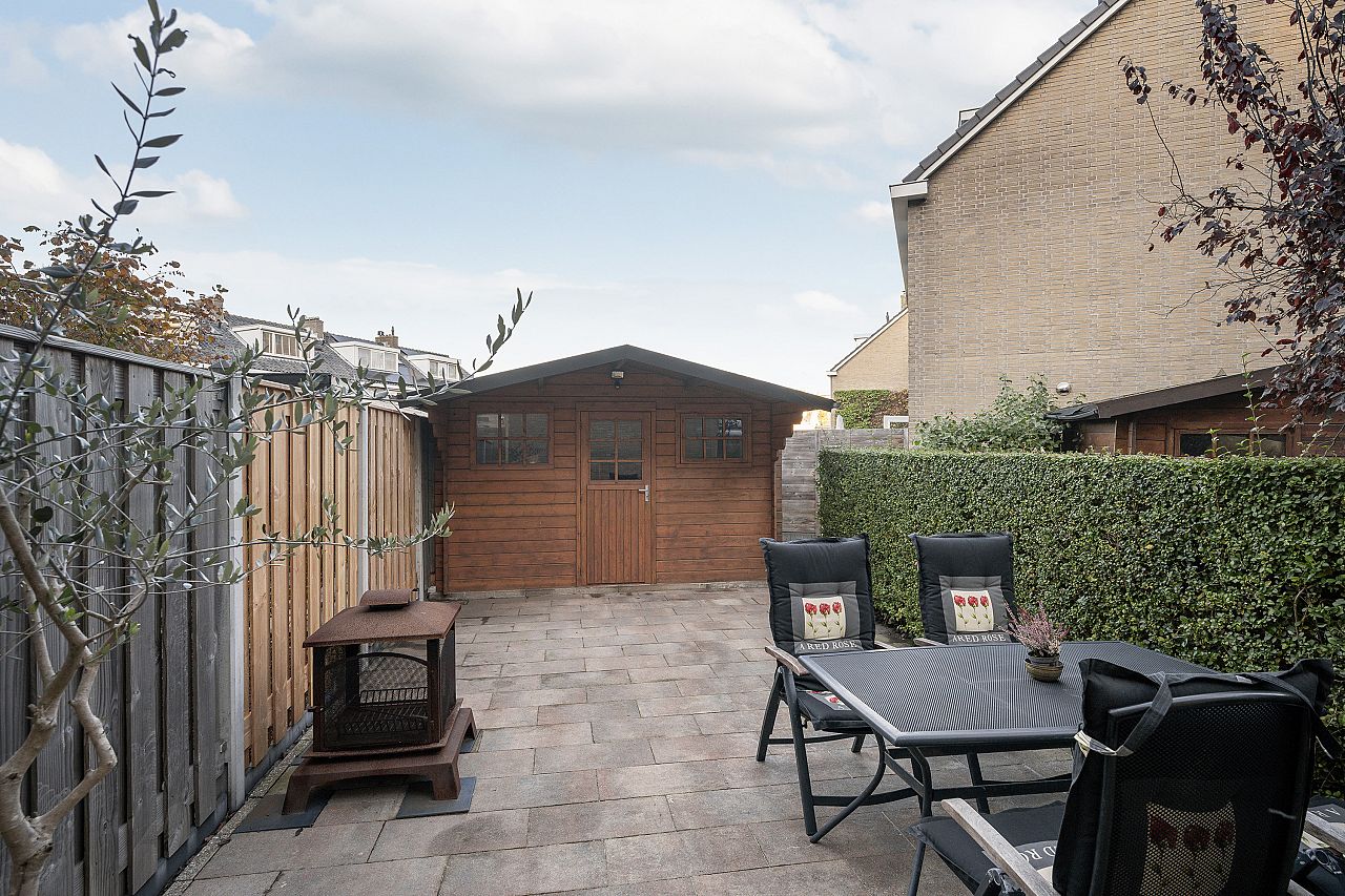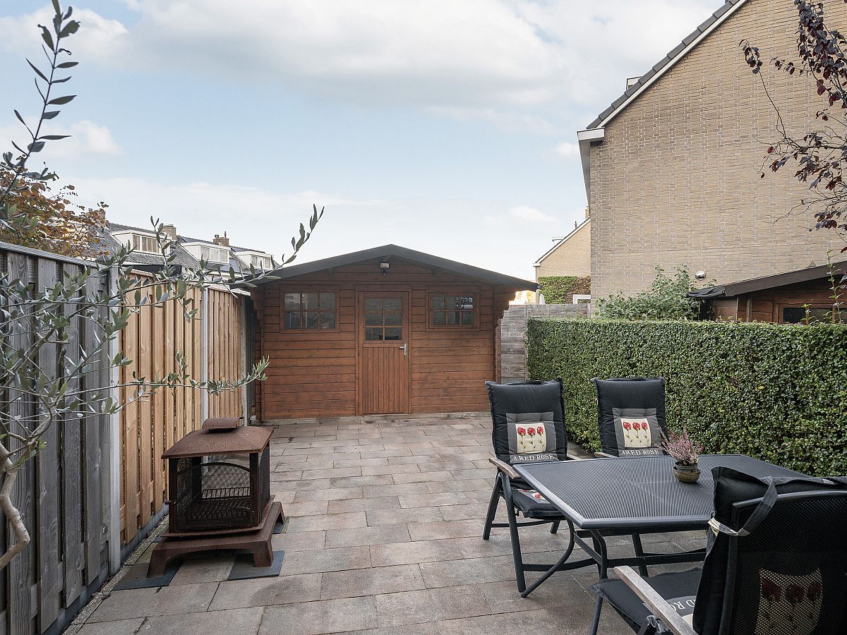 De achtertuin is netjes bestraat en heeft een houten chalet met een betonvloer, extra fietsenhok en achterom.