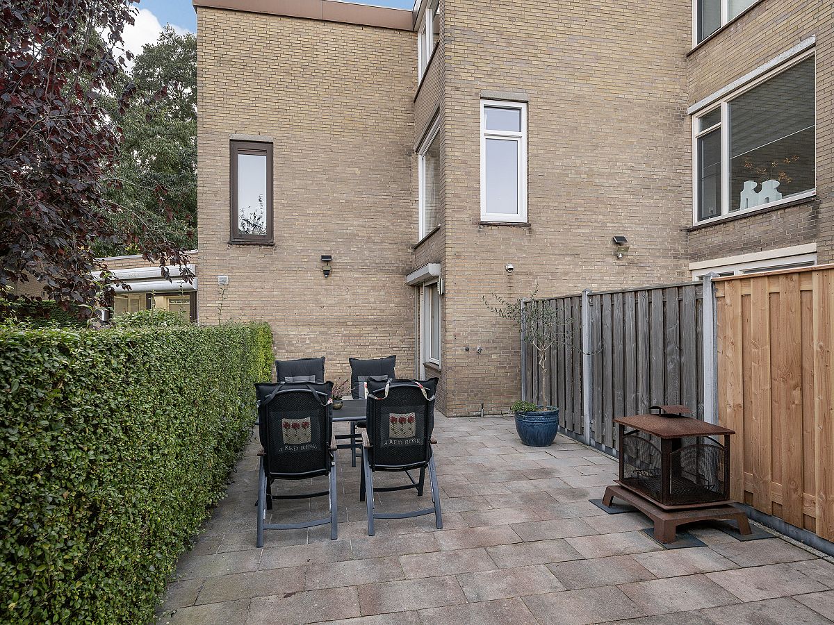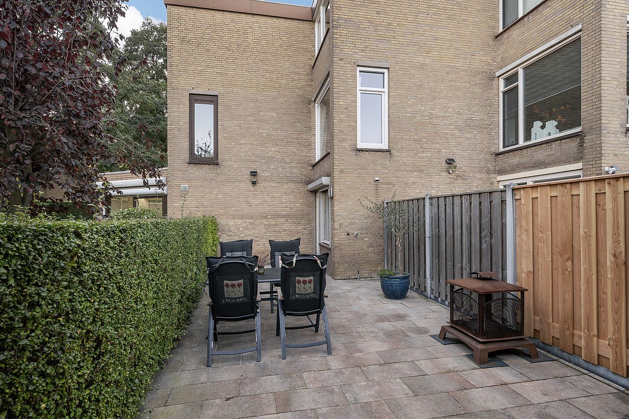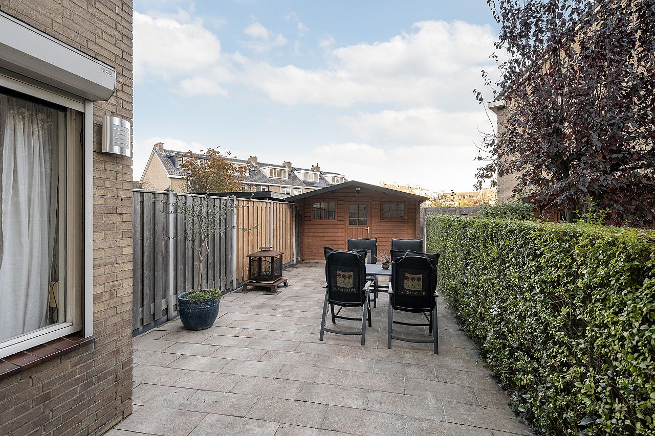 De achtertuin is netjes bestraat en heeft een houten chalet met een betonvloer, extra fietsenhok en achterom.