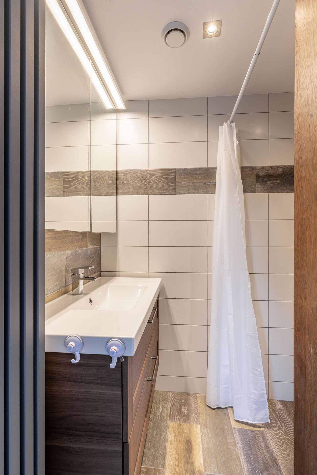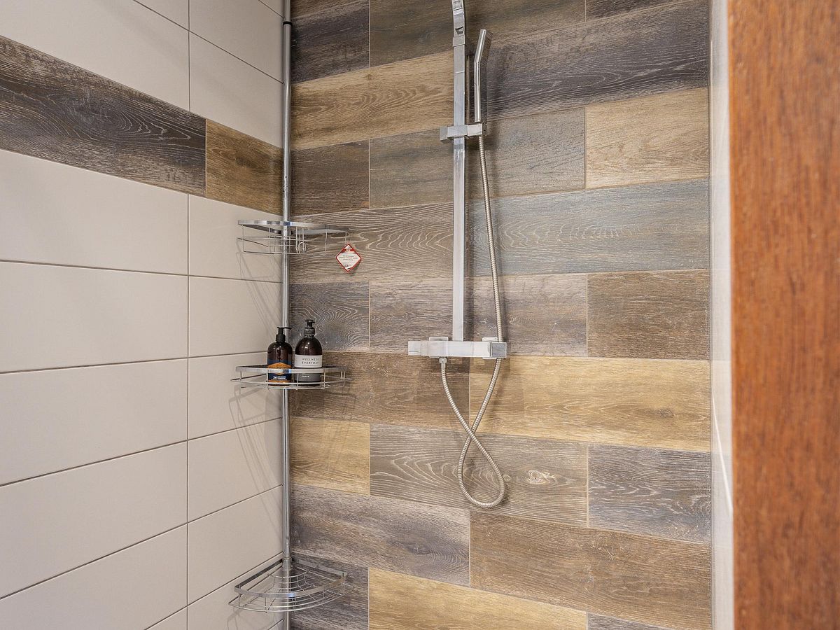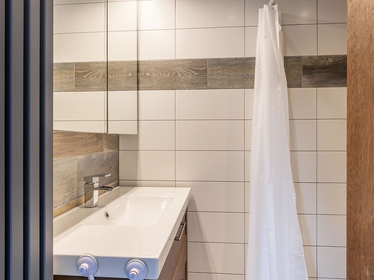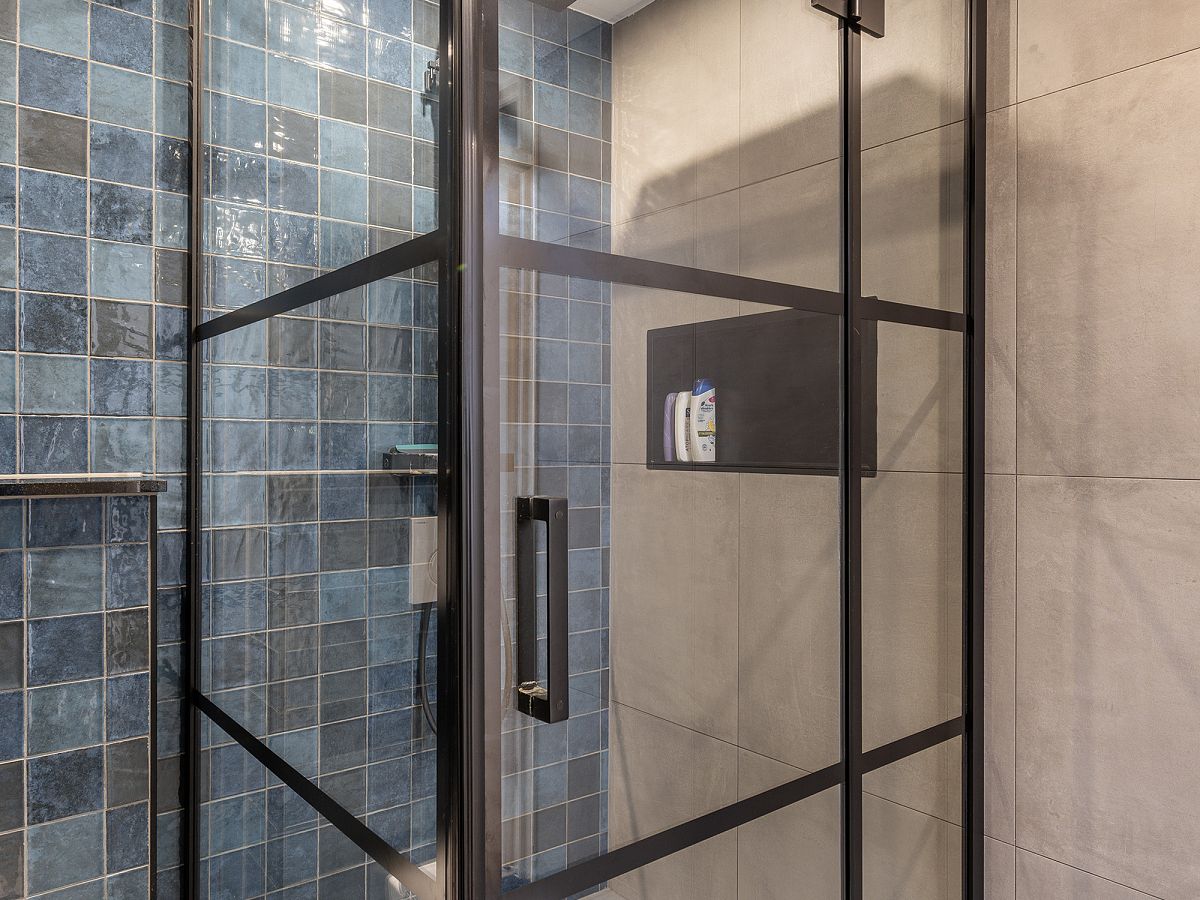 Badkamer met douche en wastafelmeubel.