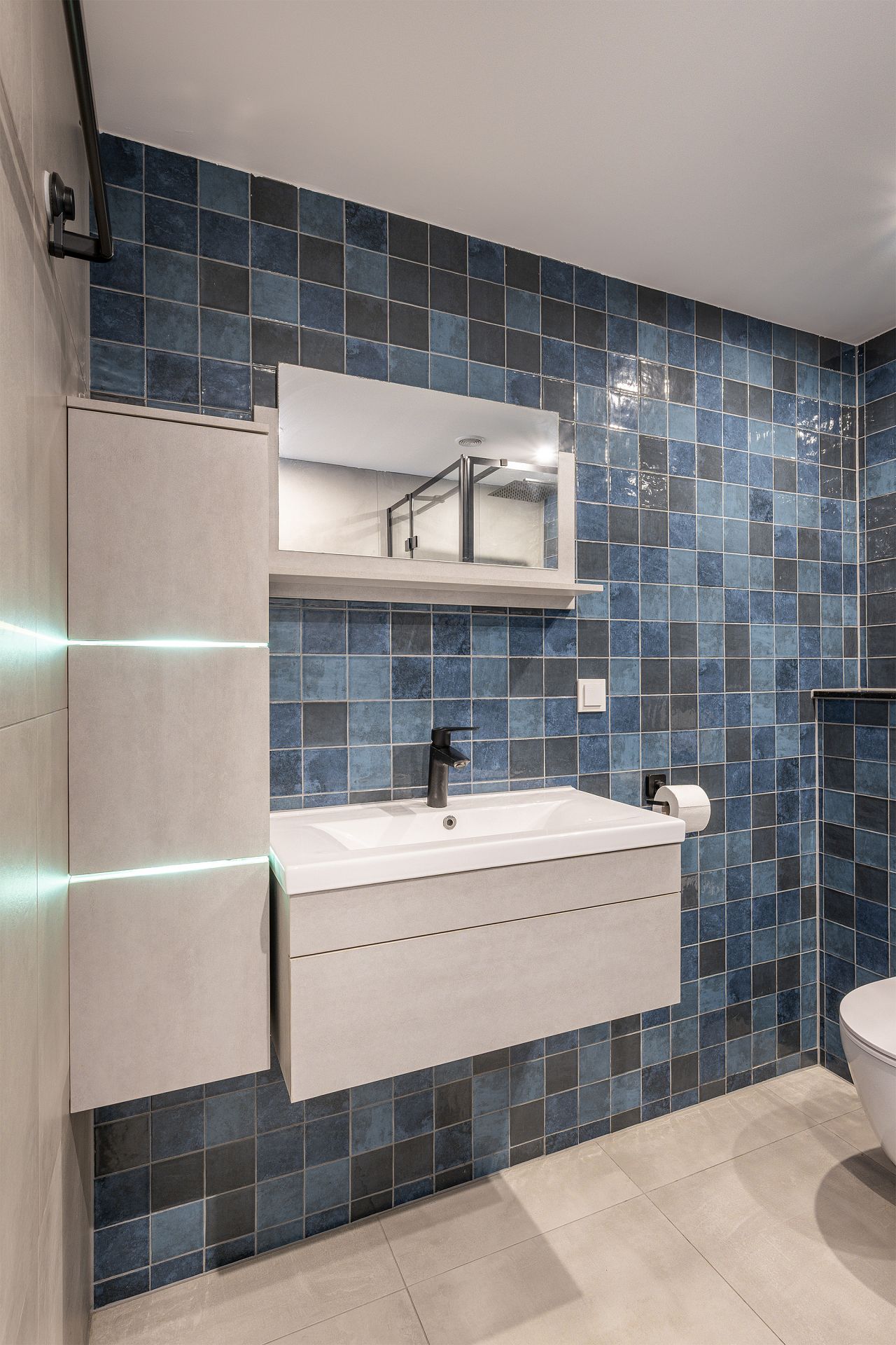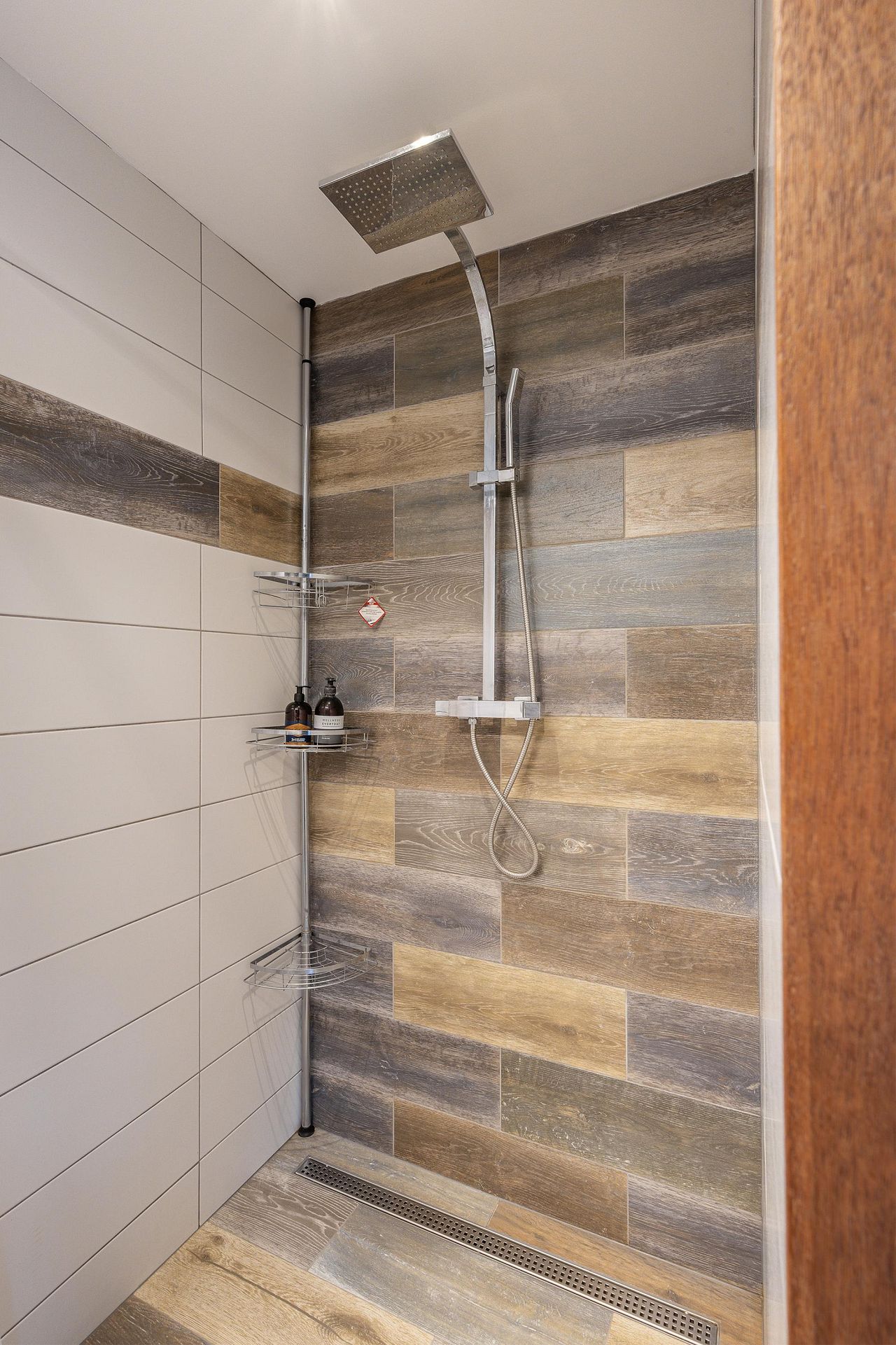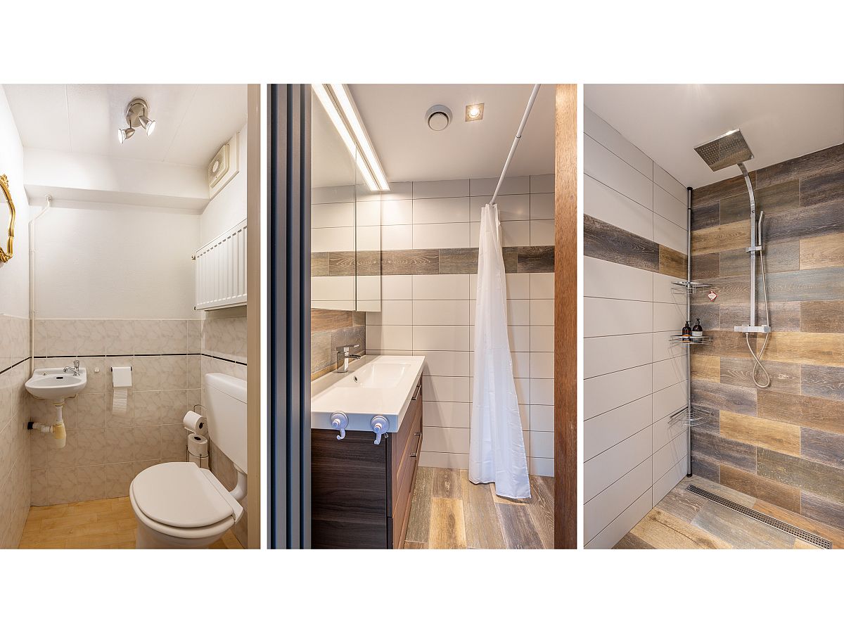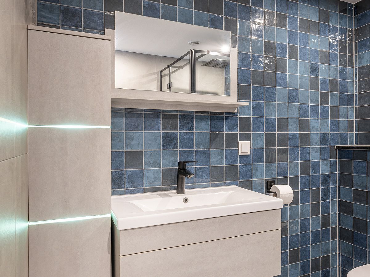 Badkamer met douche en wastafelmeubel.
