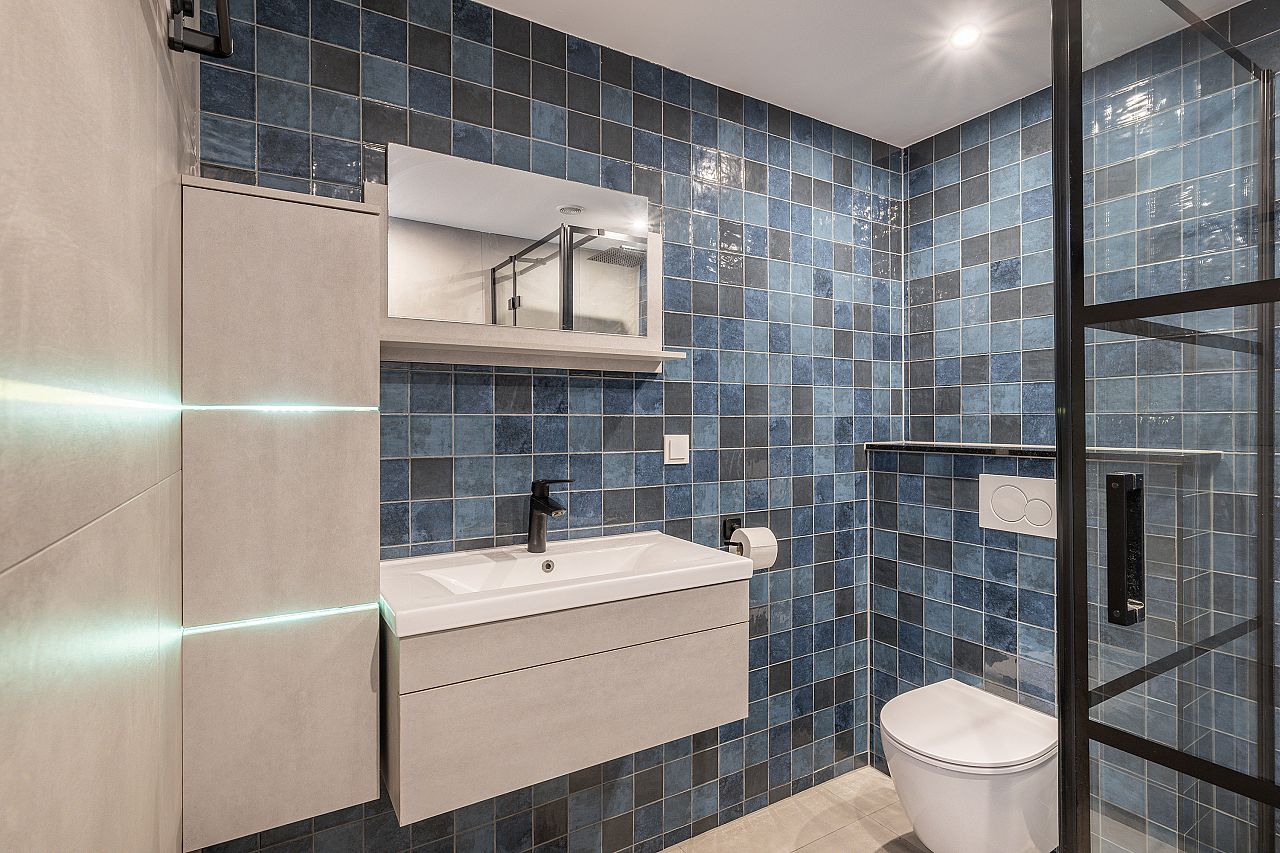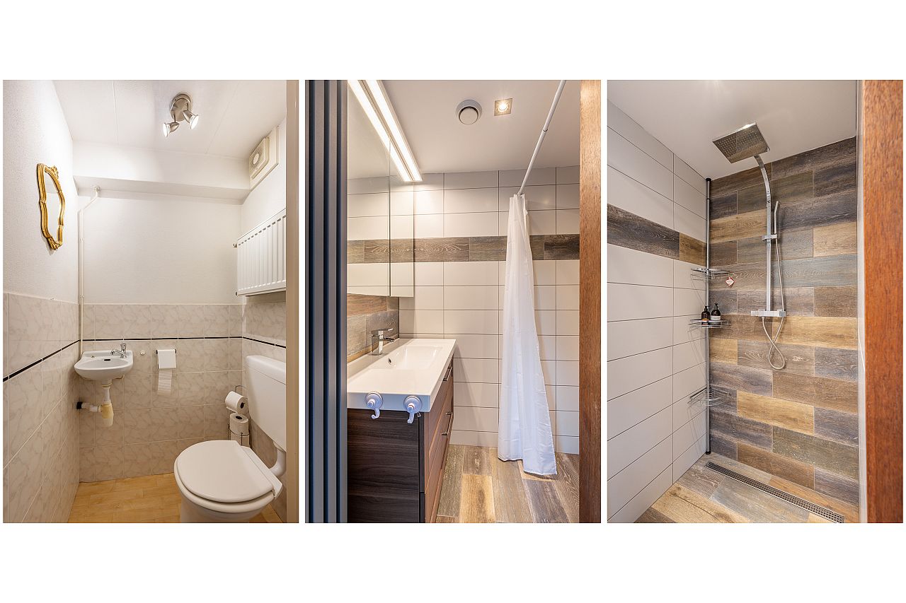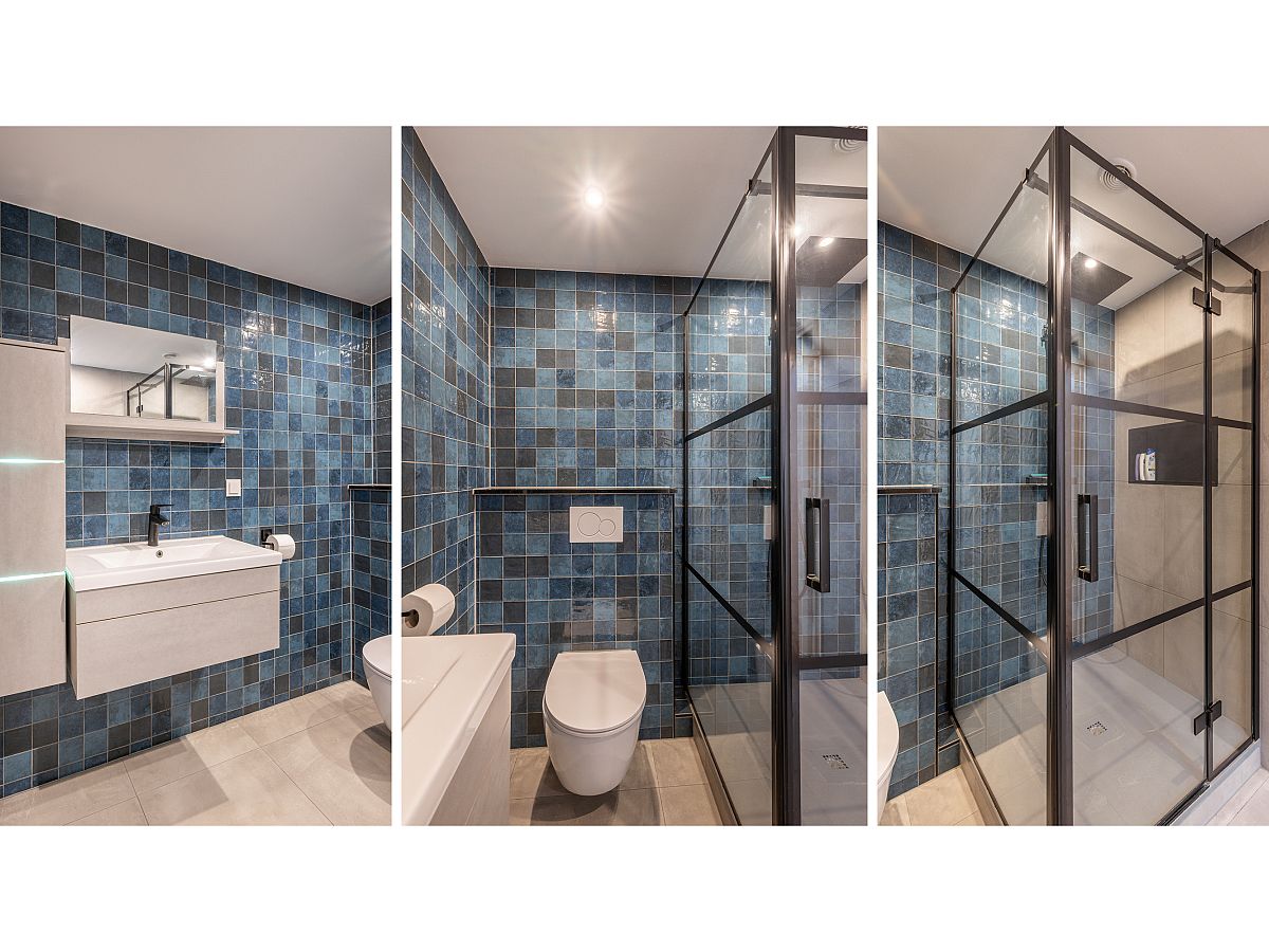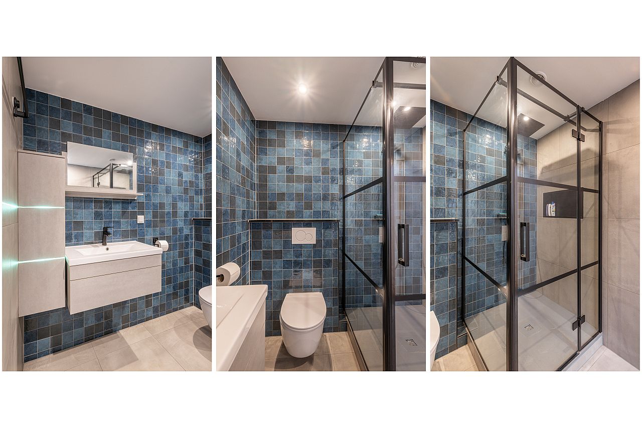 Moderne badkamer uit 2023/24, welke is uitgerust met een douchehoek, wastafelmeubel en tweede toilet.