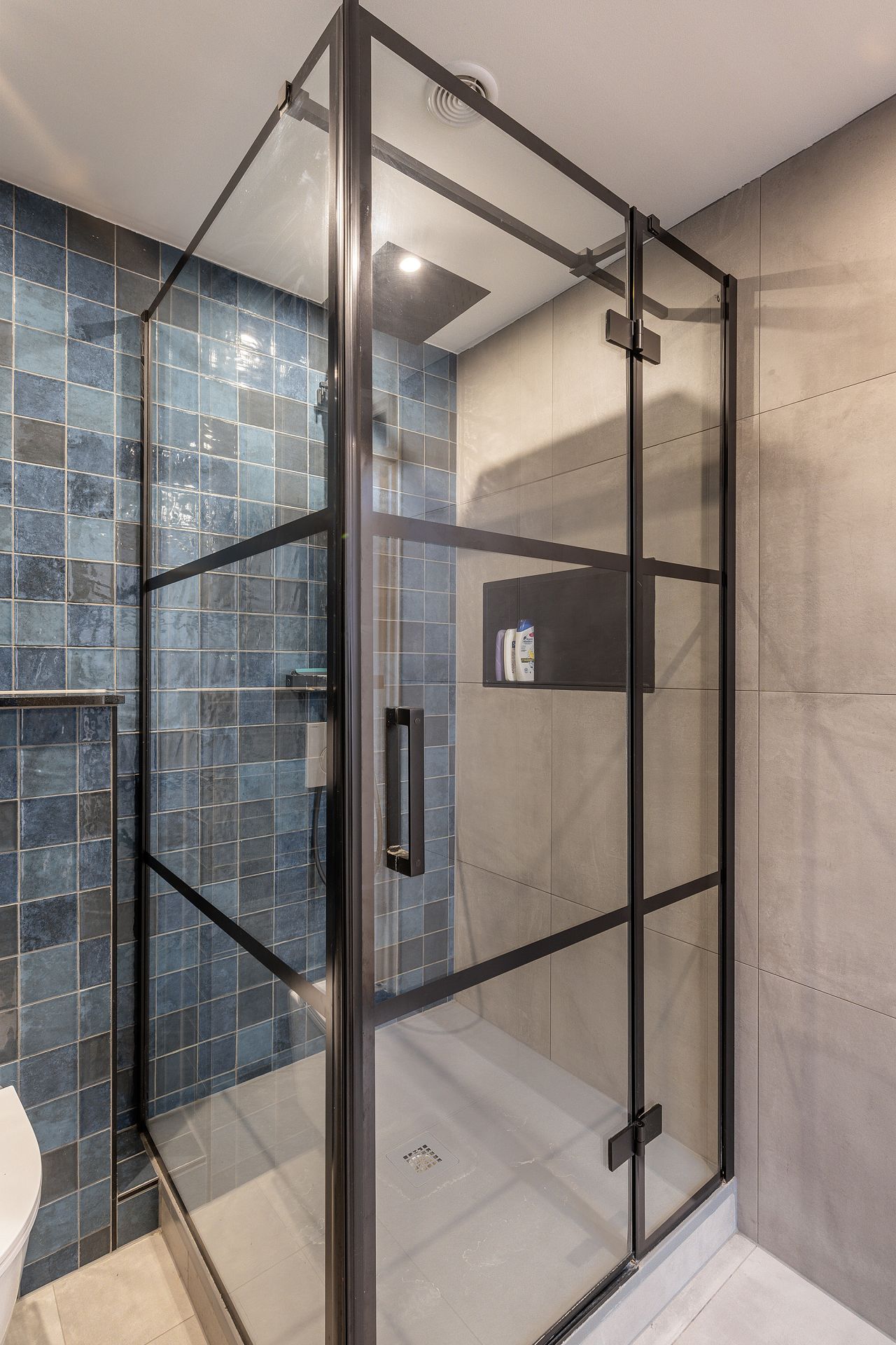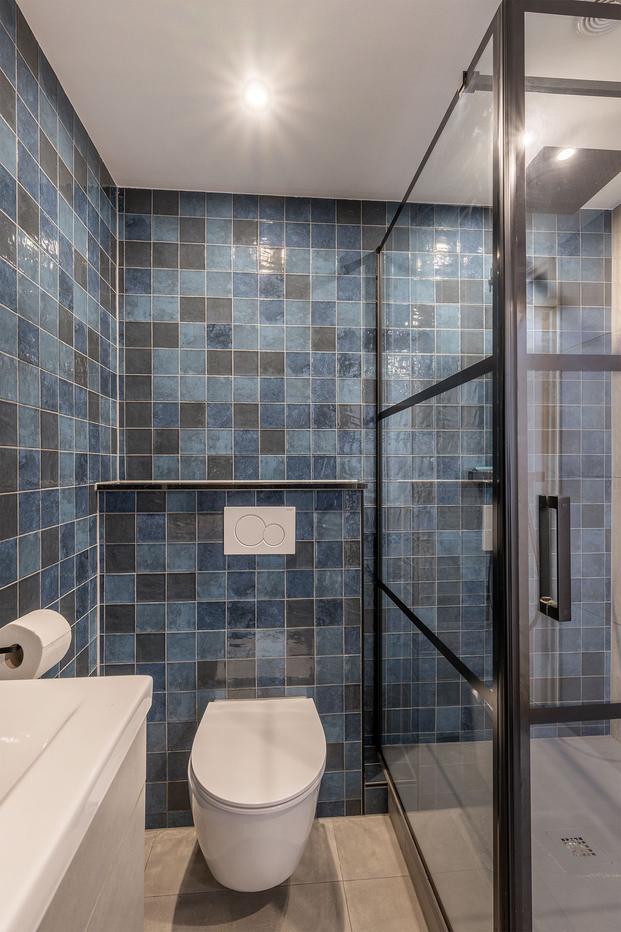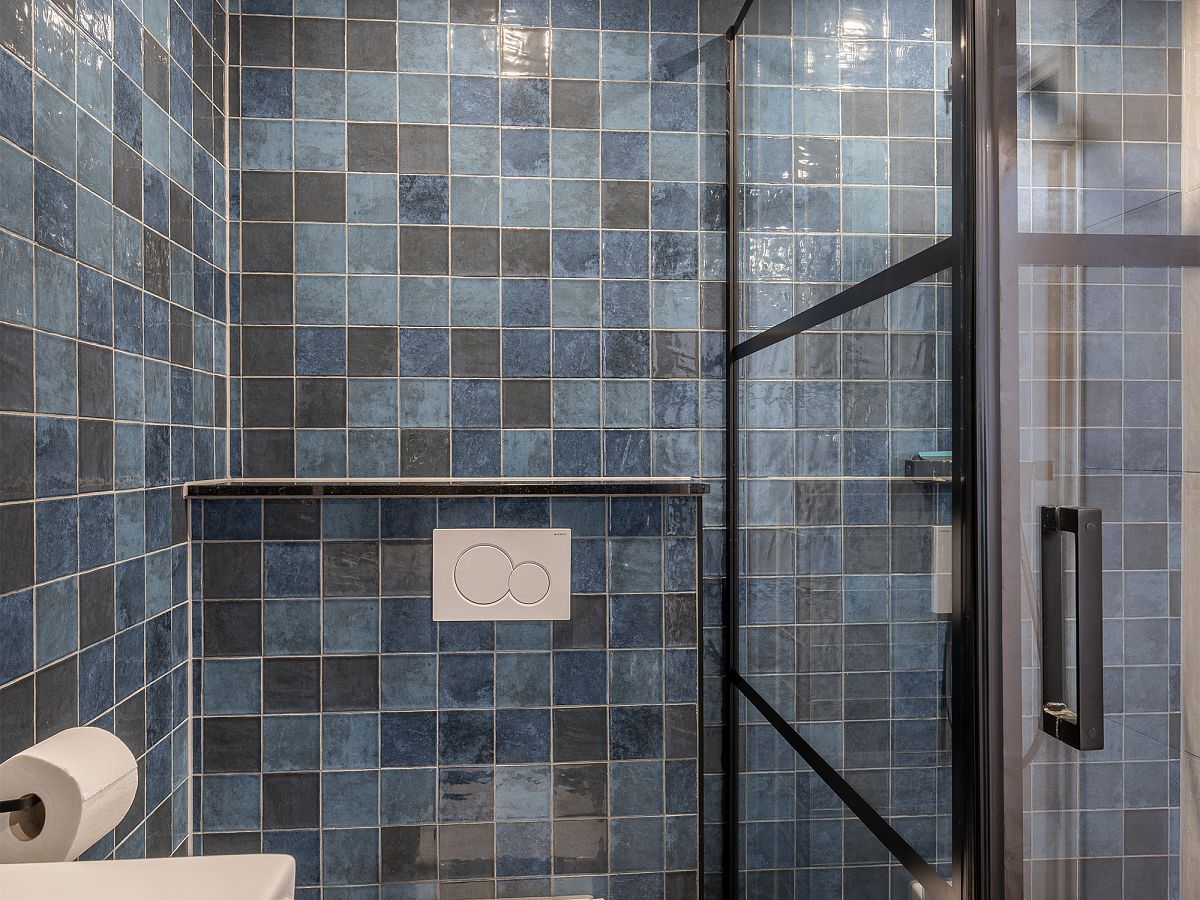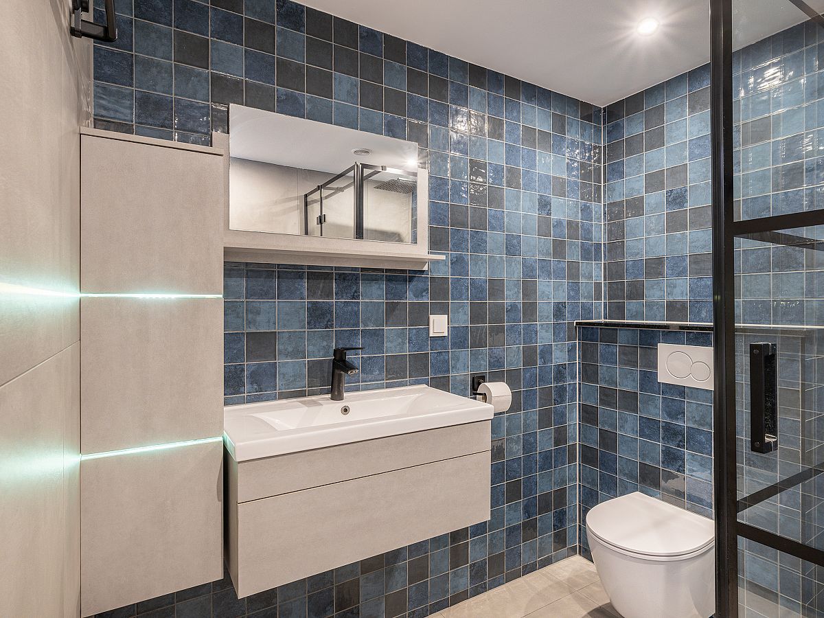 Moderne badkamer uit 2023/24, welke is uitgerust met een douchehoek, wastafelmeubel en tweede toilet.