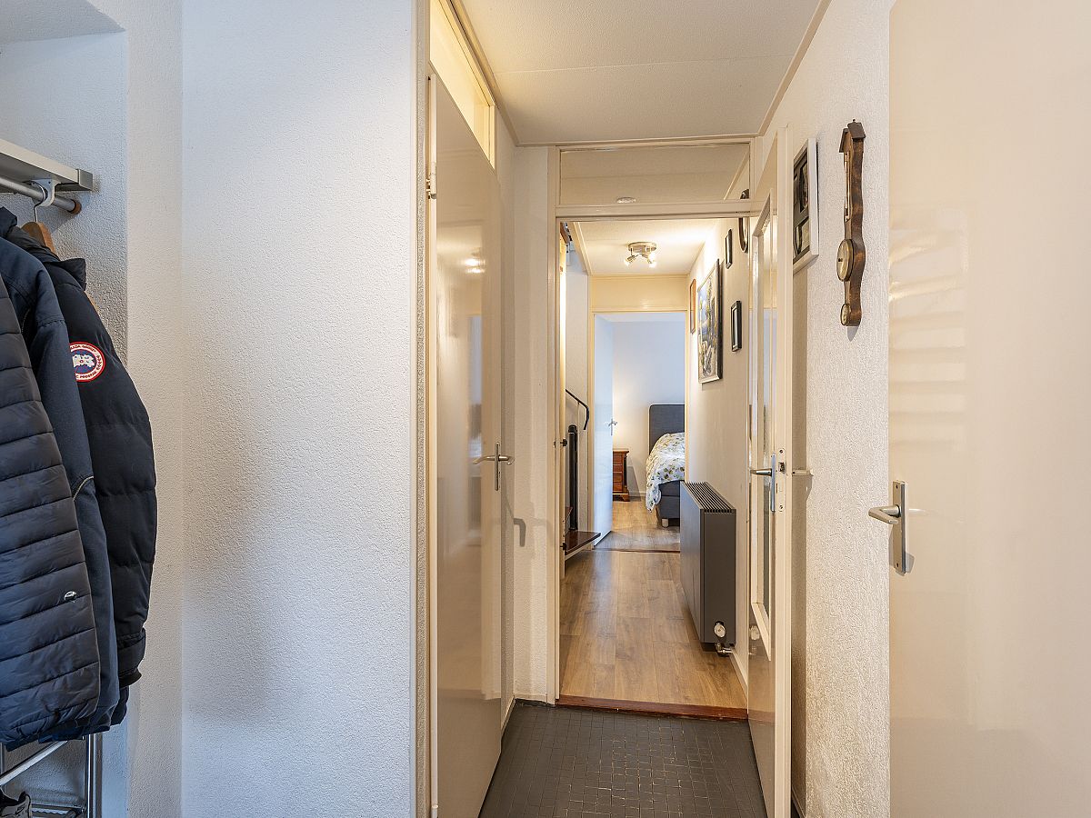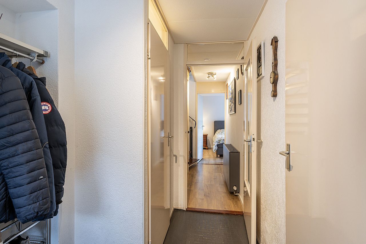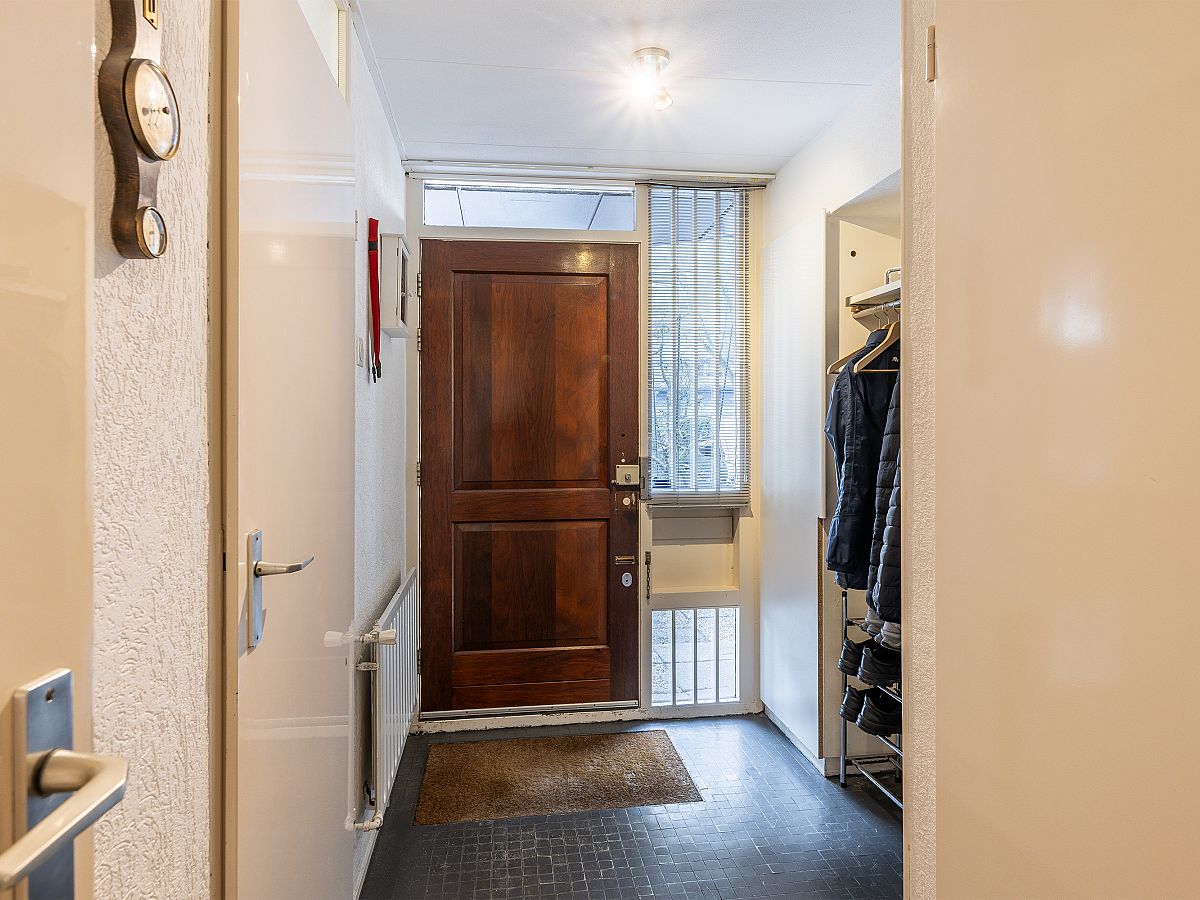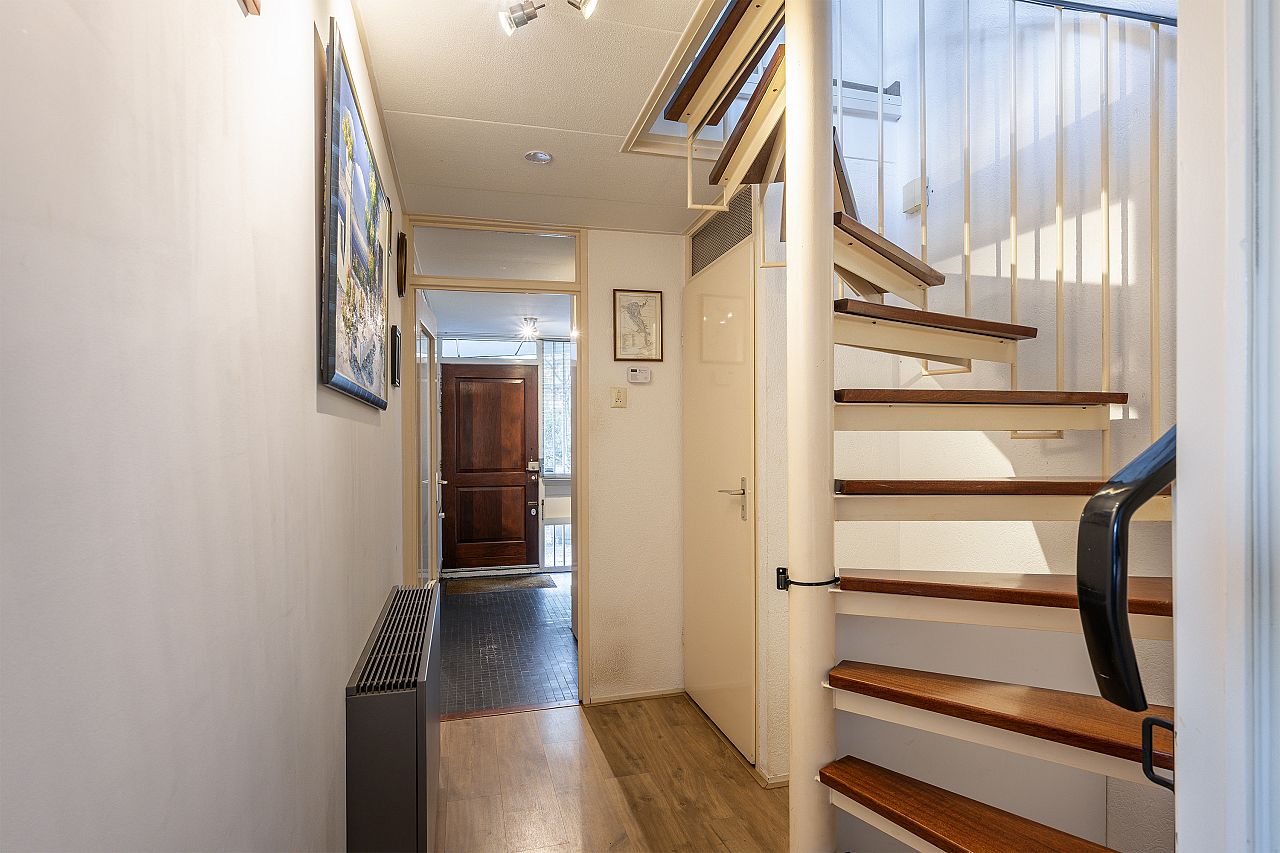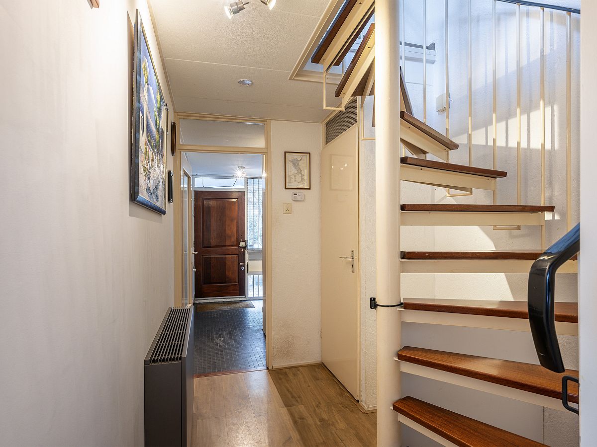 Entree met meterkast, toiletruimte, kast met CV-opstelling en spiltrap naar woonetage.