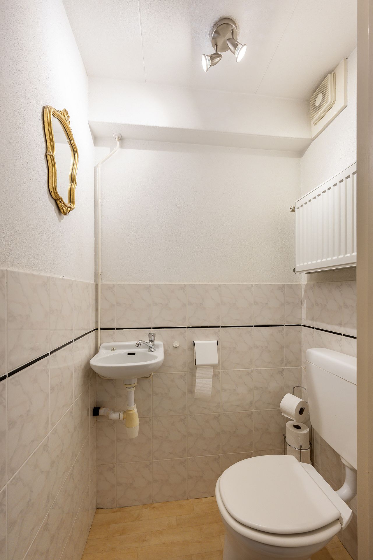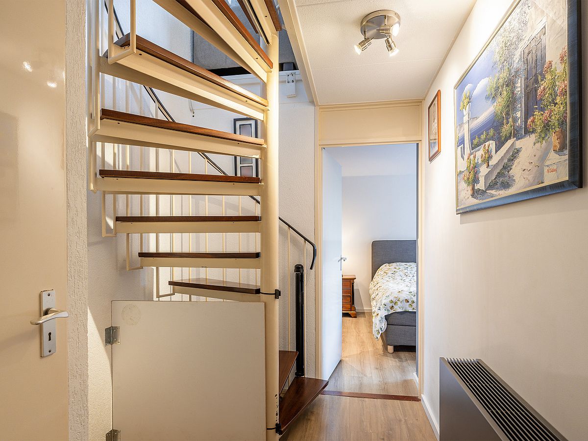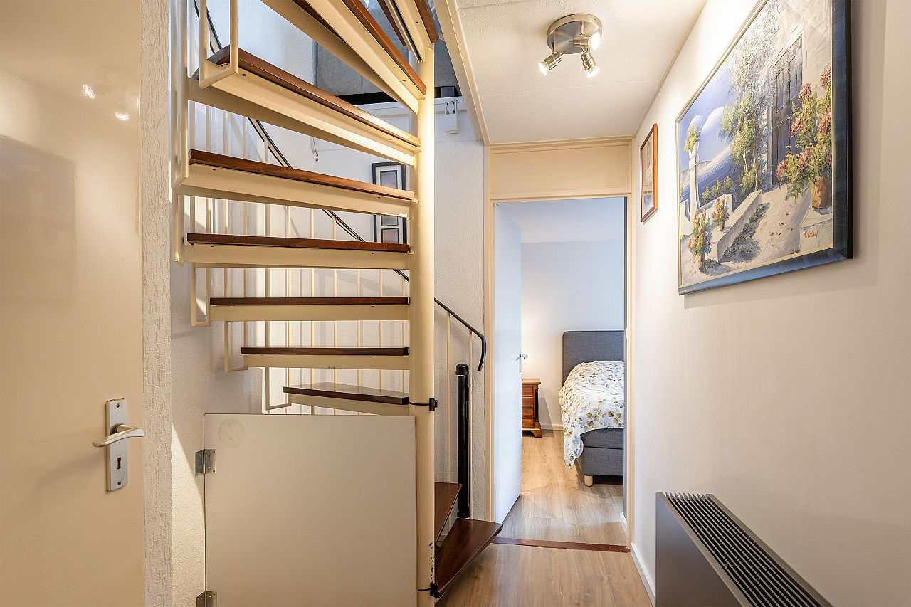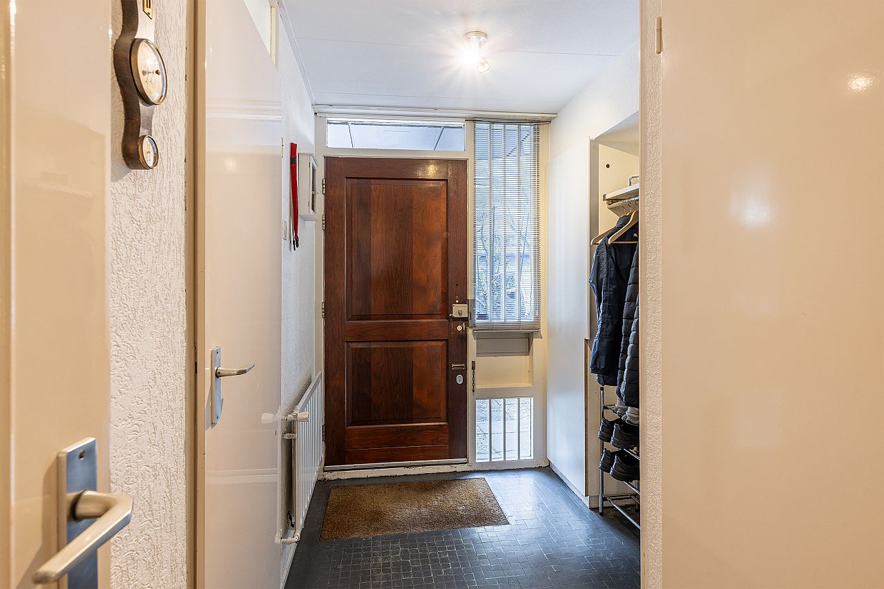 Entree met meterkast, toiletruimte, kast met CV-opstelling en spiltrap naar woonetage.