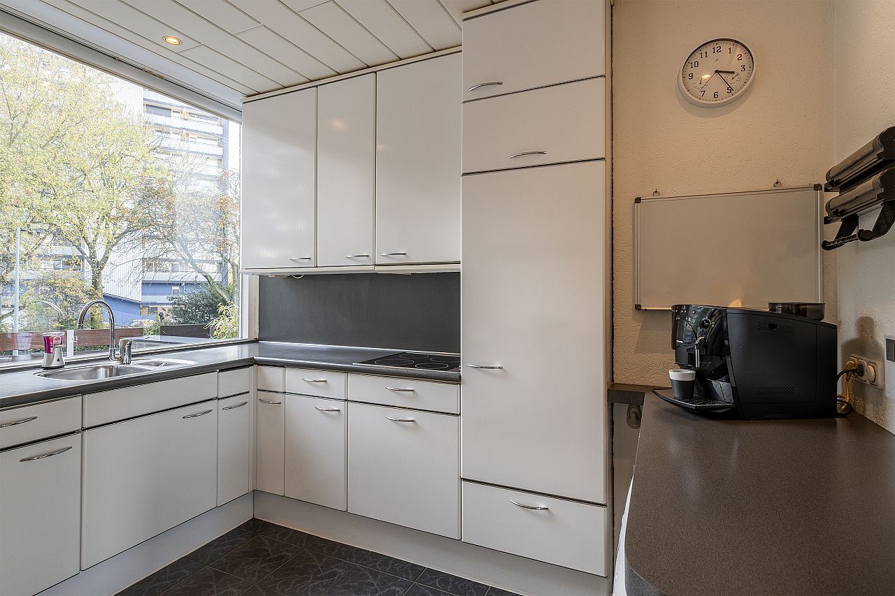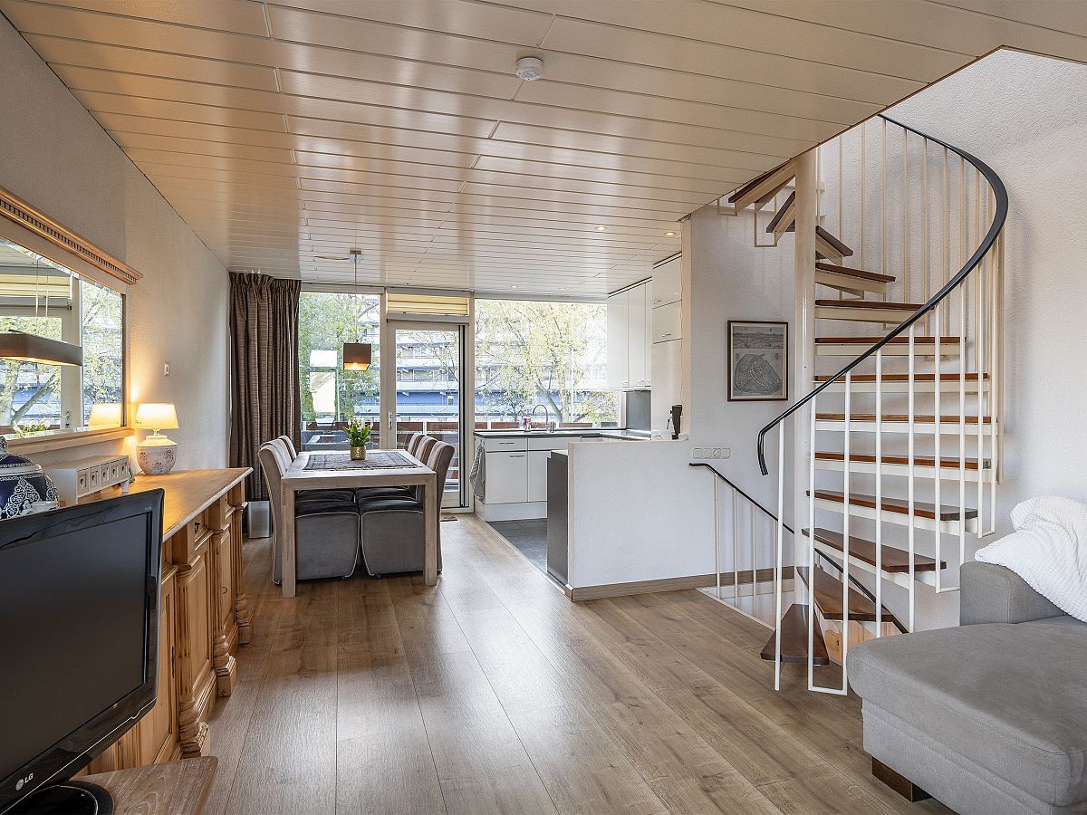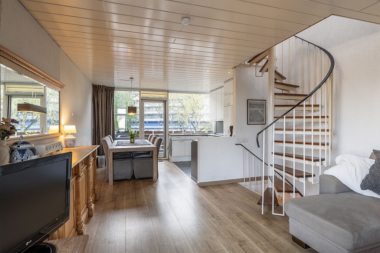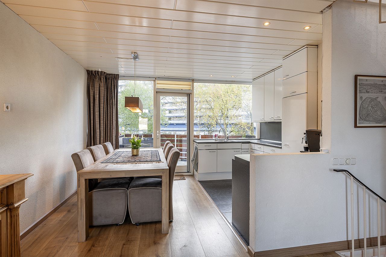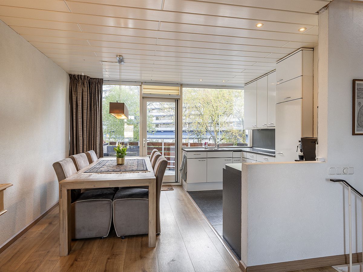 De woonkamer heeft een fijne lichtinval door de grote raampartijen en een open keuken in U-opstelling.
