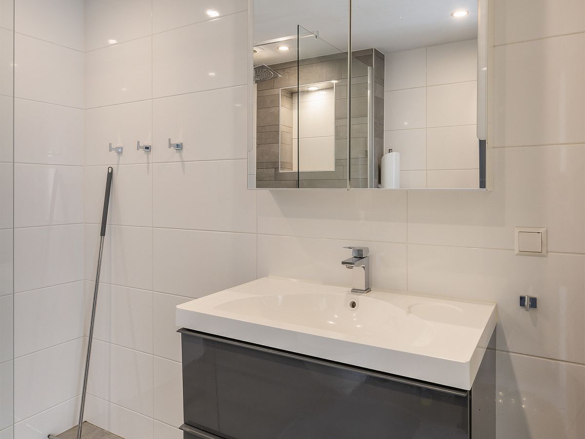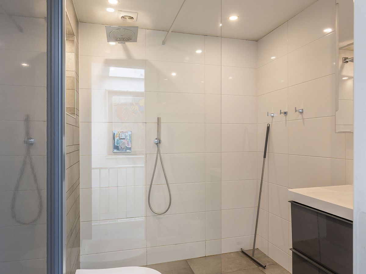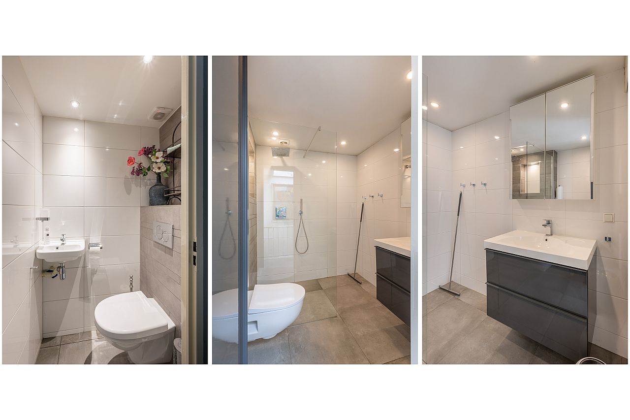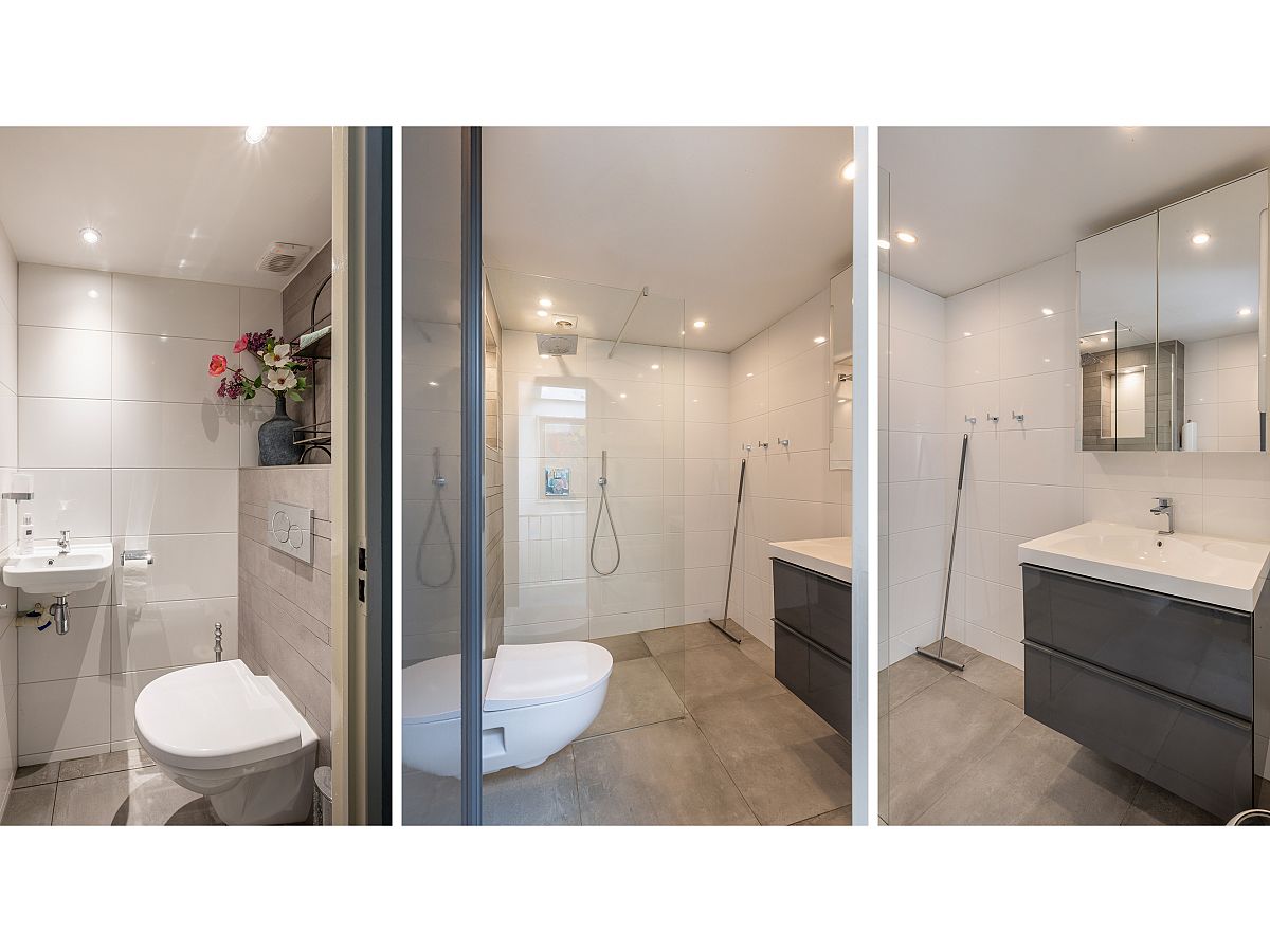 Badkamer met douche, wastafelmeubel en tweede toilet.