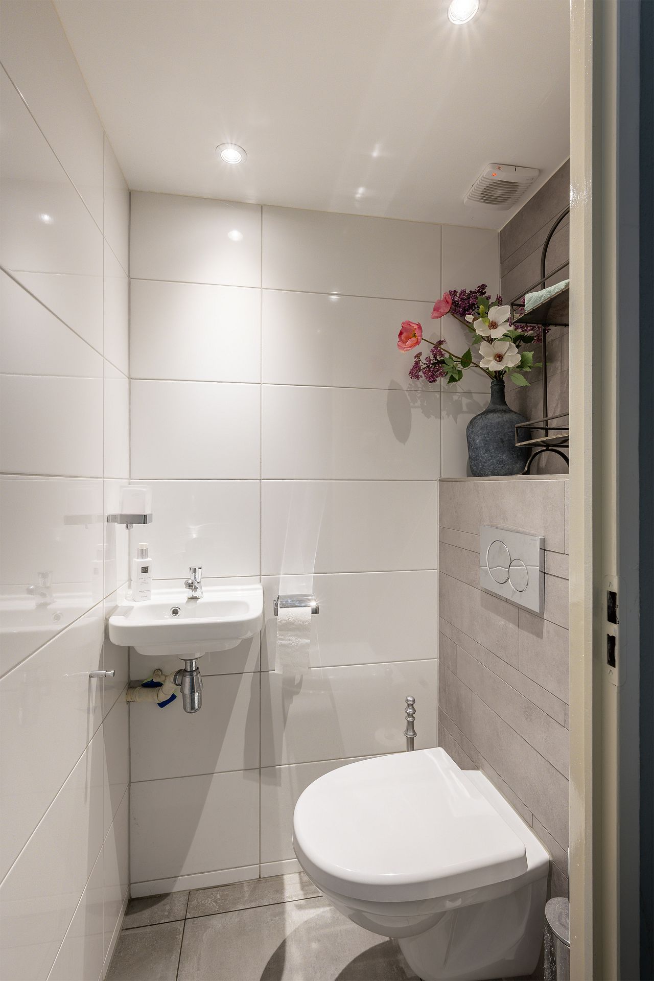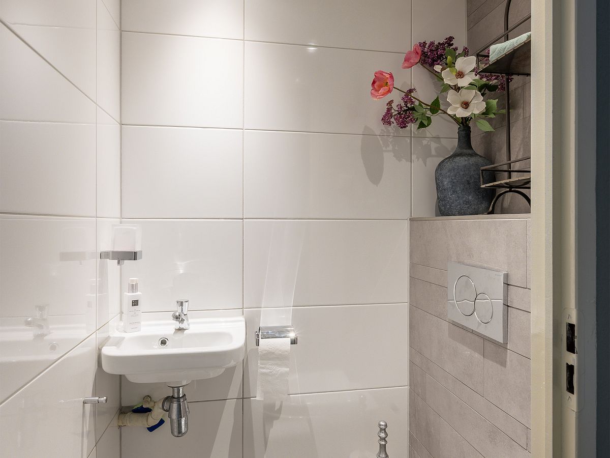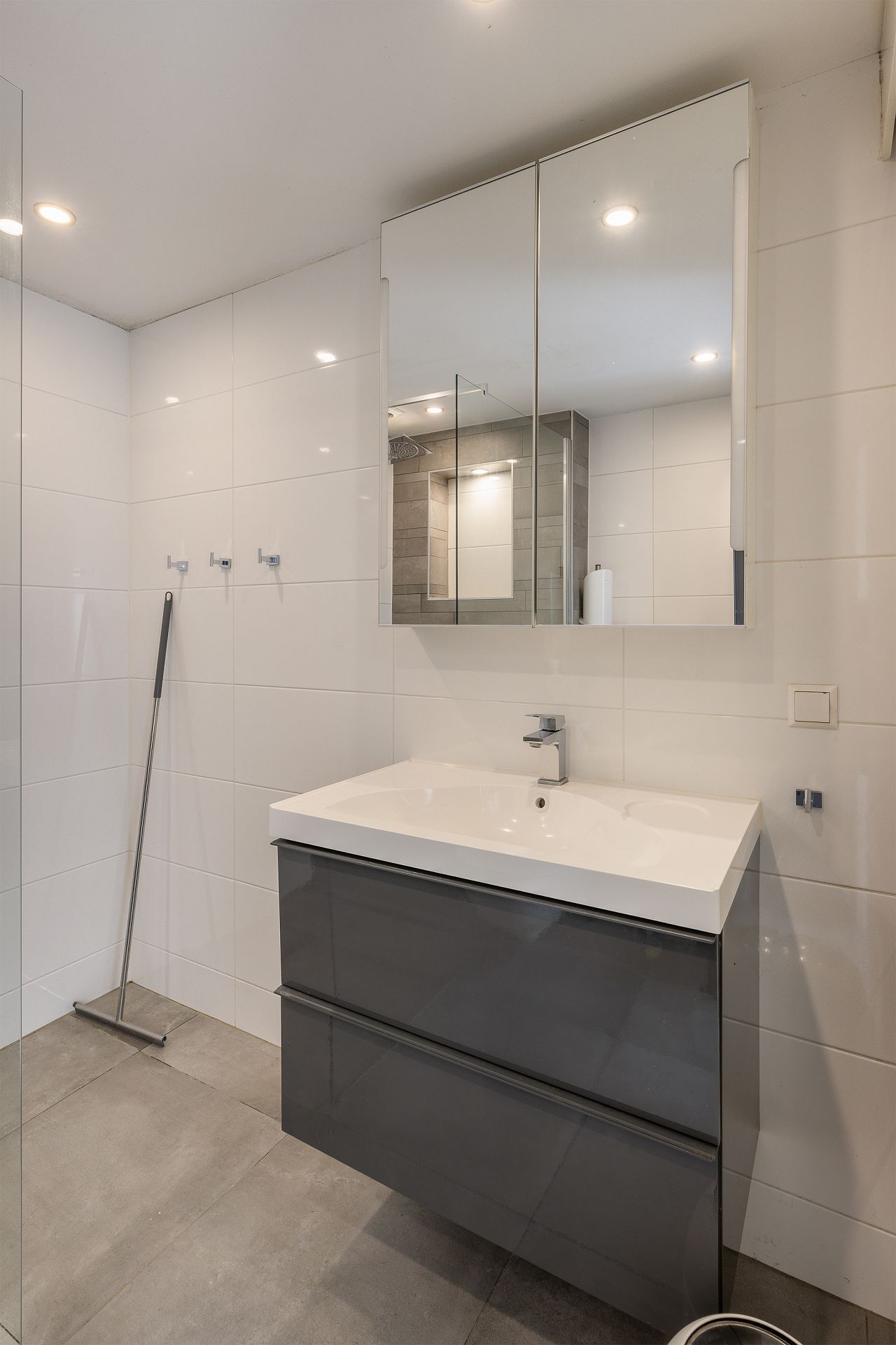 Badkamer met douche, wastafelmeubel en tweede toilet.