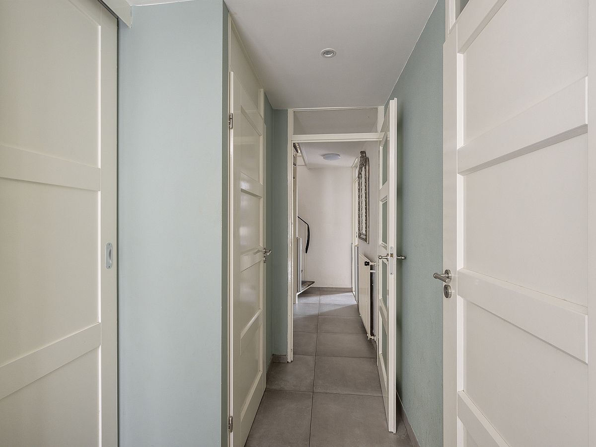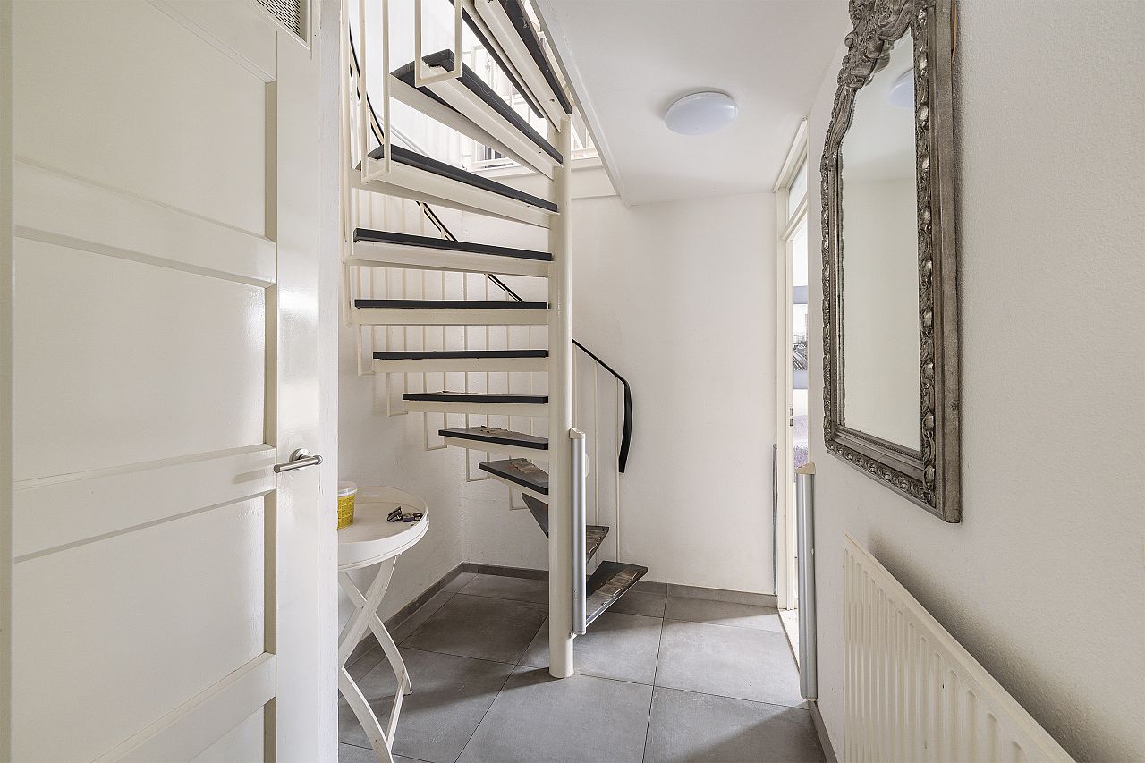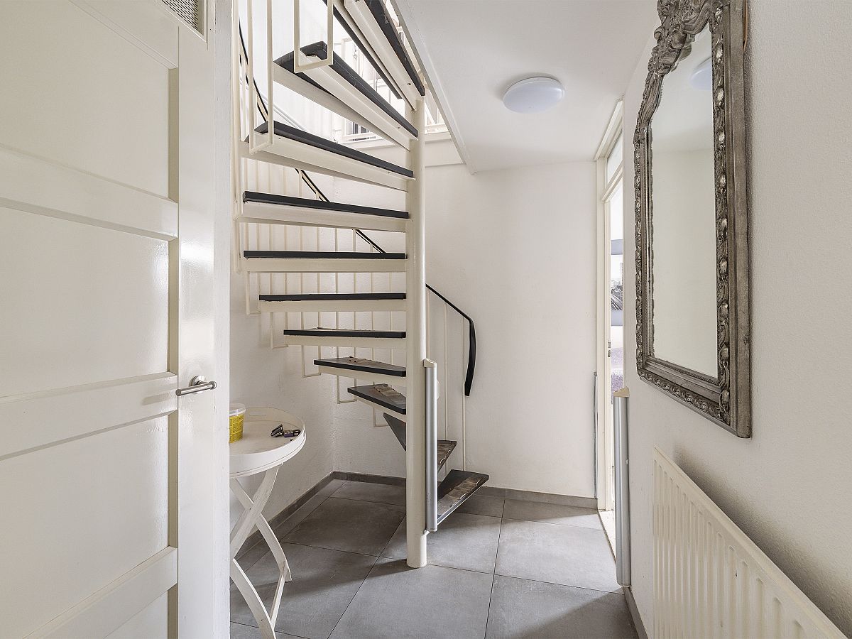 Entree met meterkast, toiletruimte, kast met CV-opstelling en spiltrap naar woonetage.