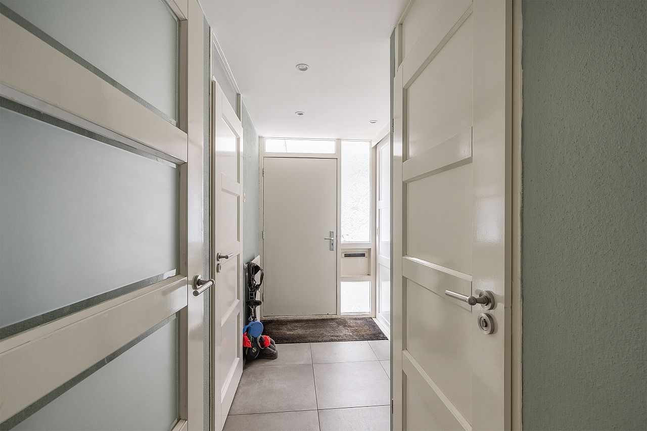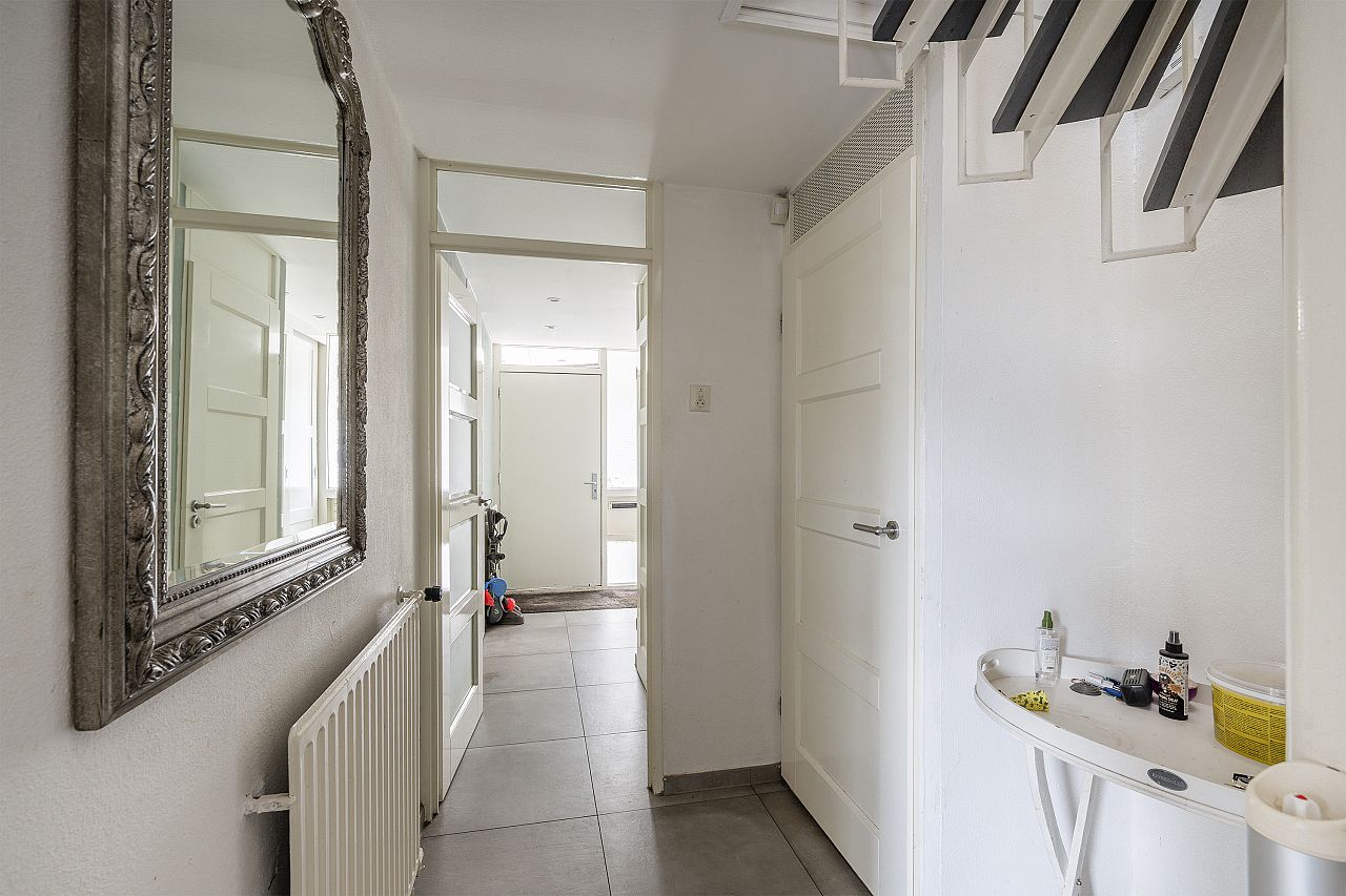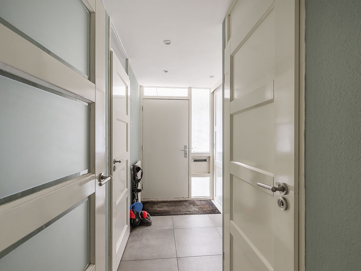 Entree met meterkast, toiletruimte, kast met CV-opstelling en spiltrap naar woonetage.