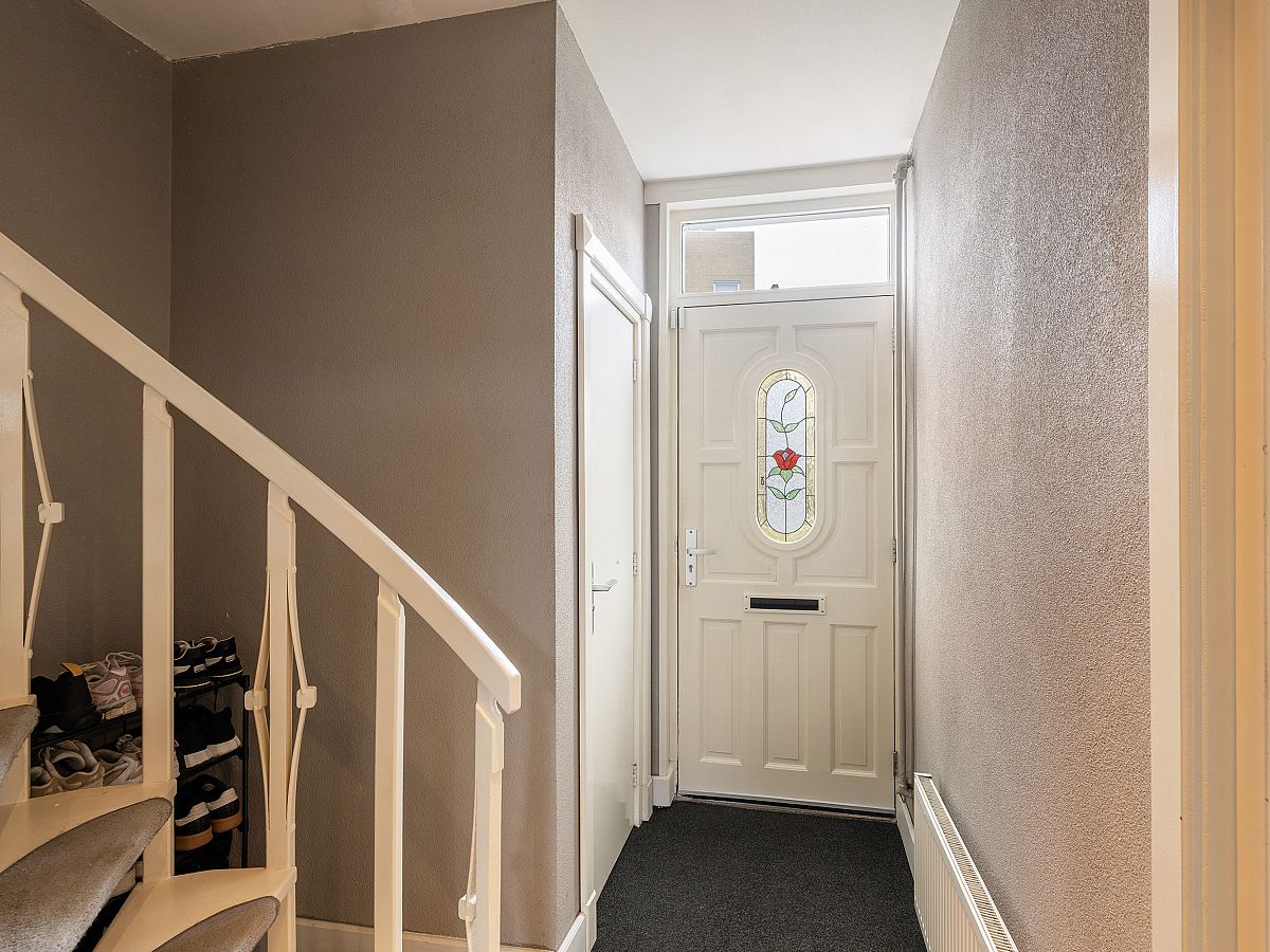 Via een brede stoep voor de rij woningen bereikt je de voordeur.